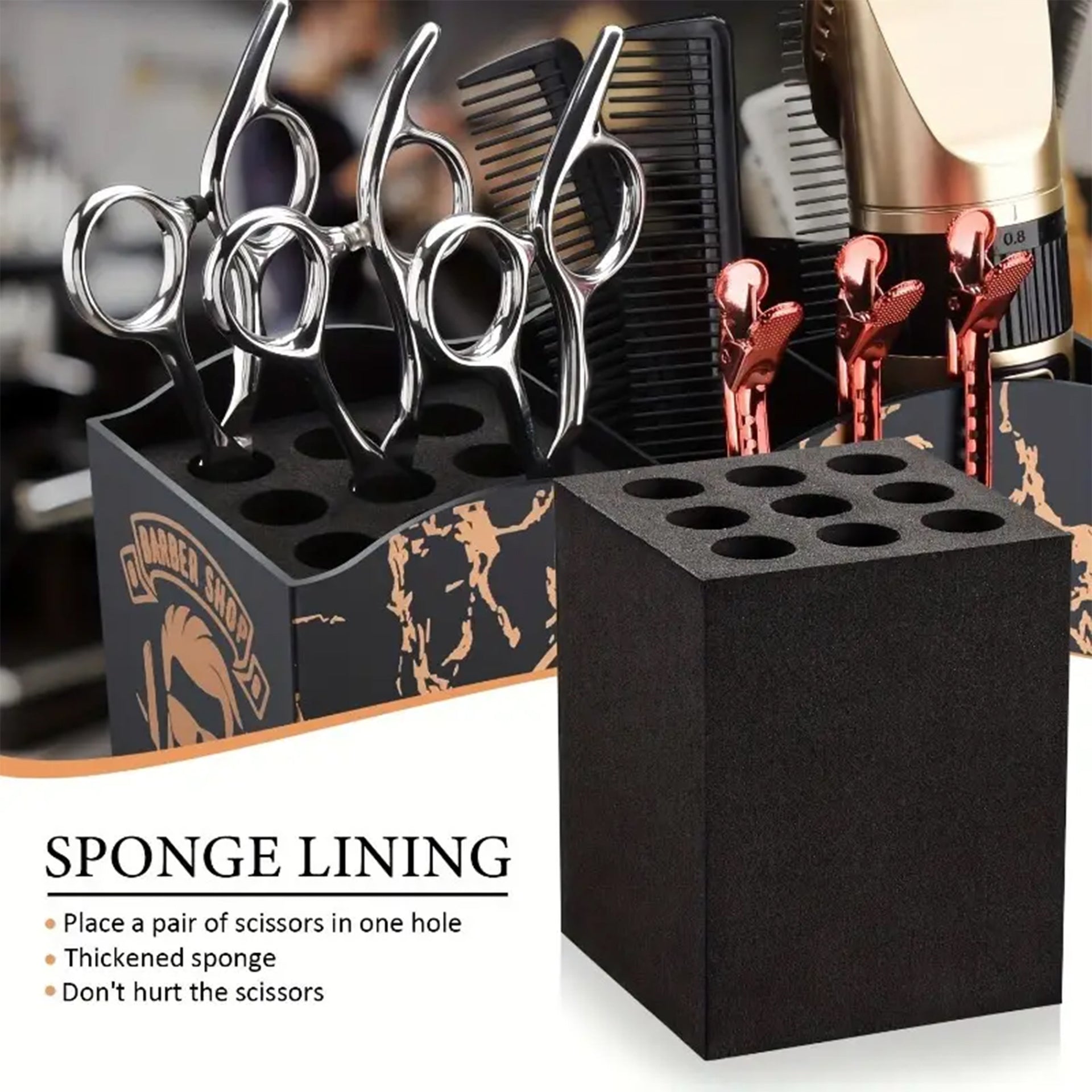 Place the holder on a flat, stable surface. Insert your scissors, brushes, and other styling tools into the bristles or compartments for secure, upright storage and easy access.