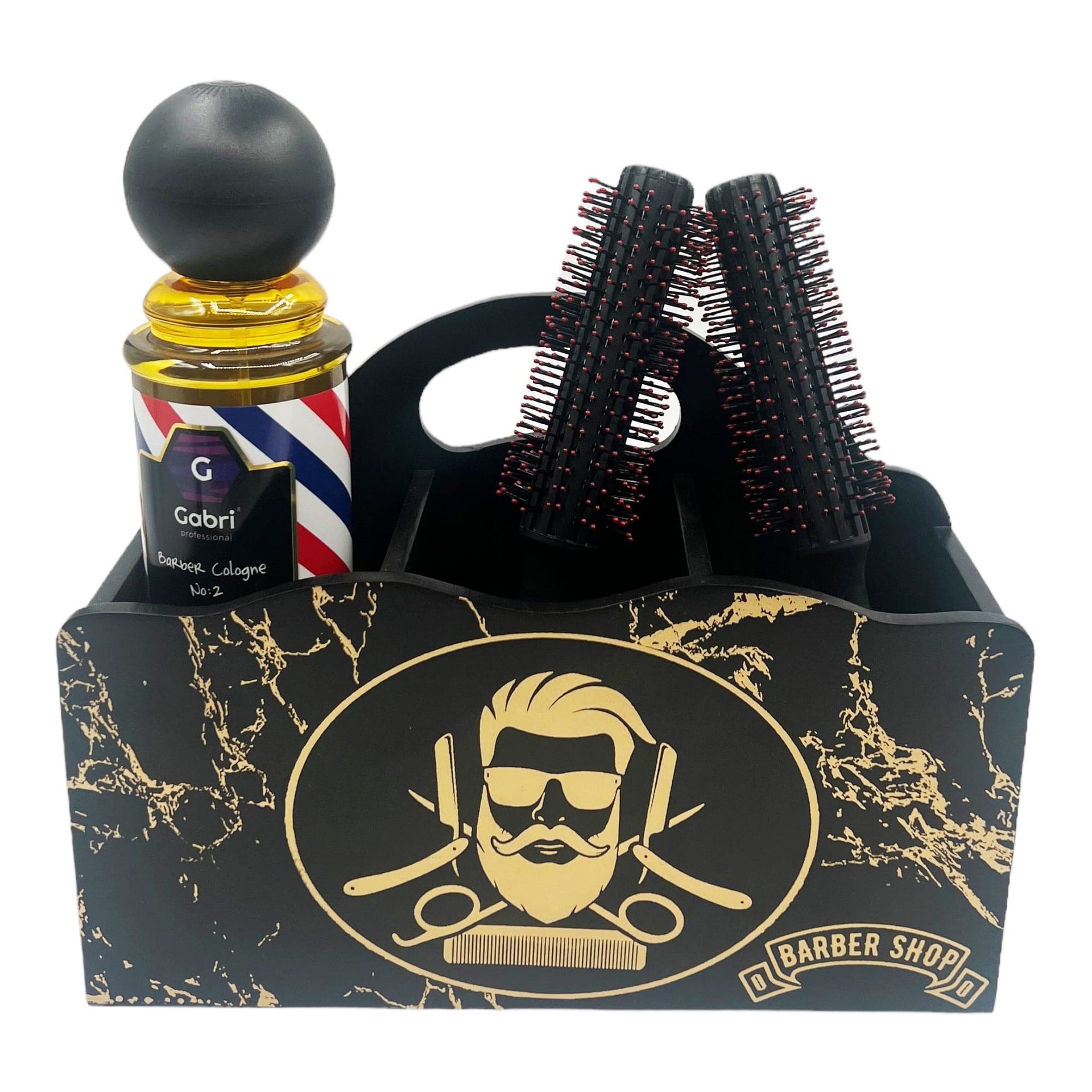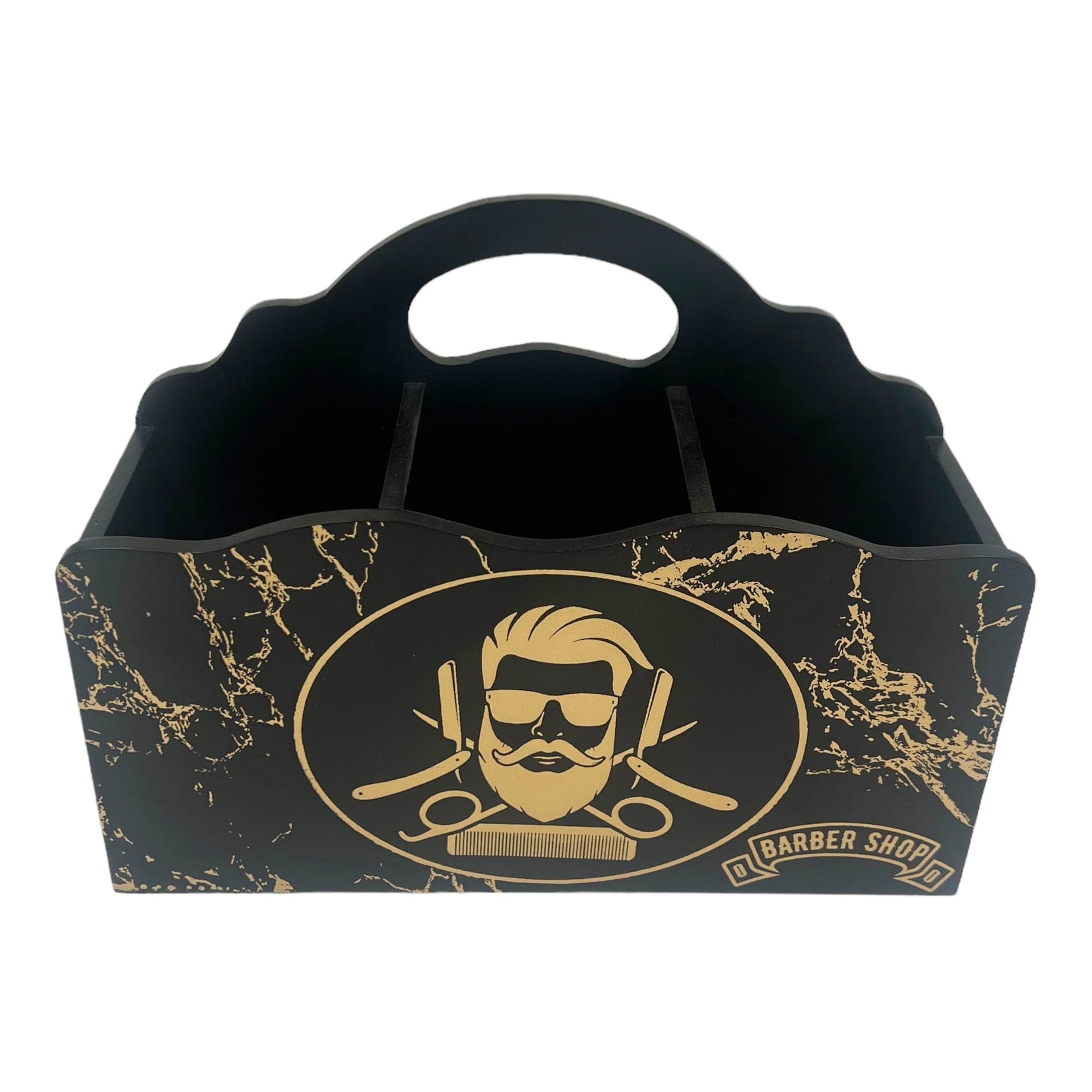 Organise your workspace in style with the Eson - Scissor & Brush Holder Wooden Stand Gold Pattern, an essential caddy for any professional barber or hairdresser. This organiser provides a sturdy and stylish solution for keeping your scissors, clippers, combs, and brushes neatly stored and within easy reach. It is crafted from high-quality materials, featuring a sophisticated black finish with a luxurious gold marble-effect pattern for a premium look. The front is adorned with a classic gold "Barber Shop" logo, adding an authentic and professional touch to your station.