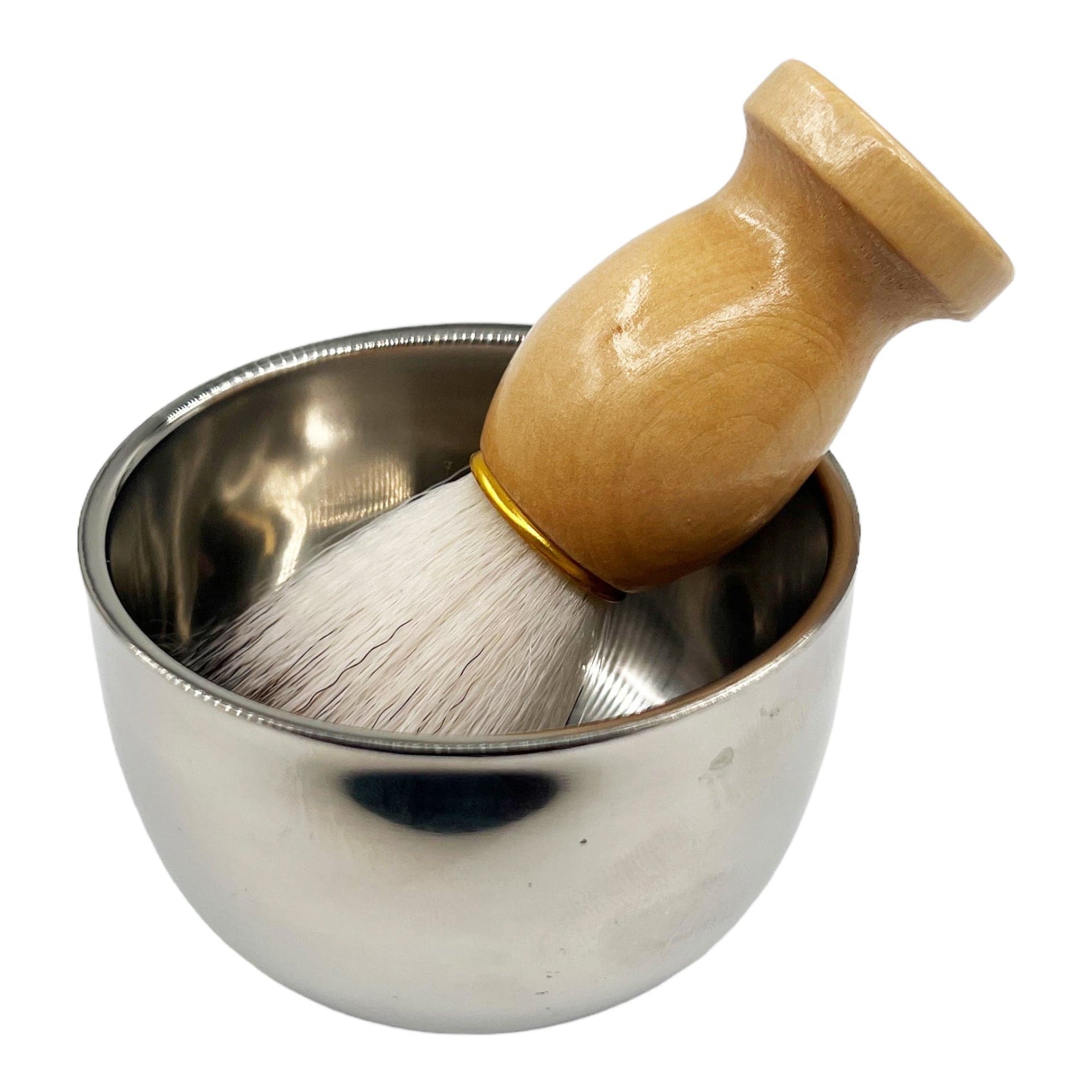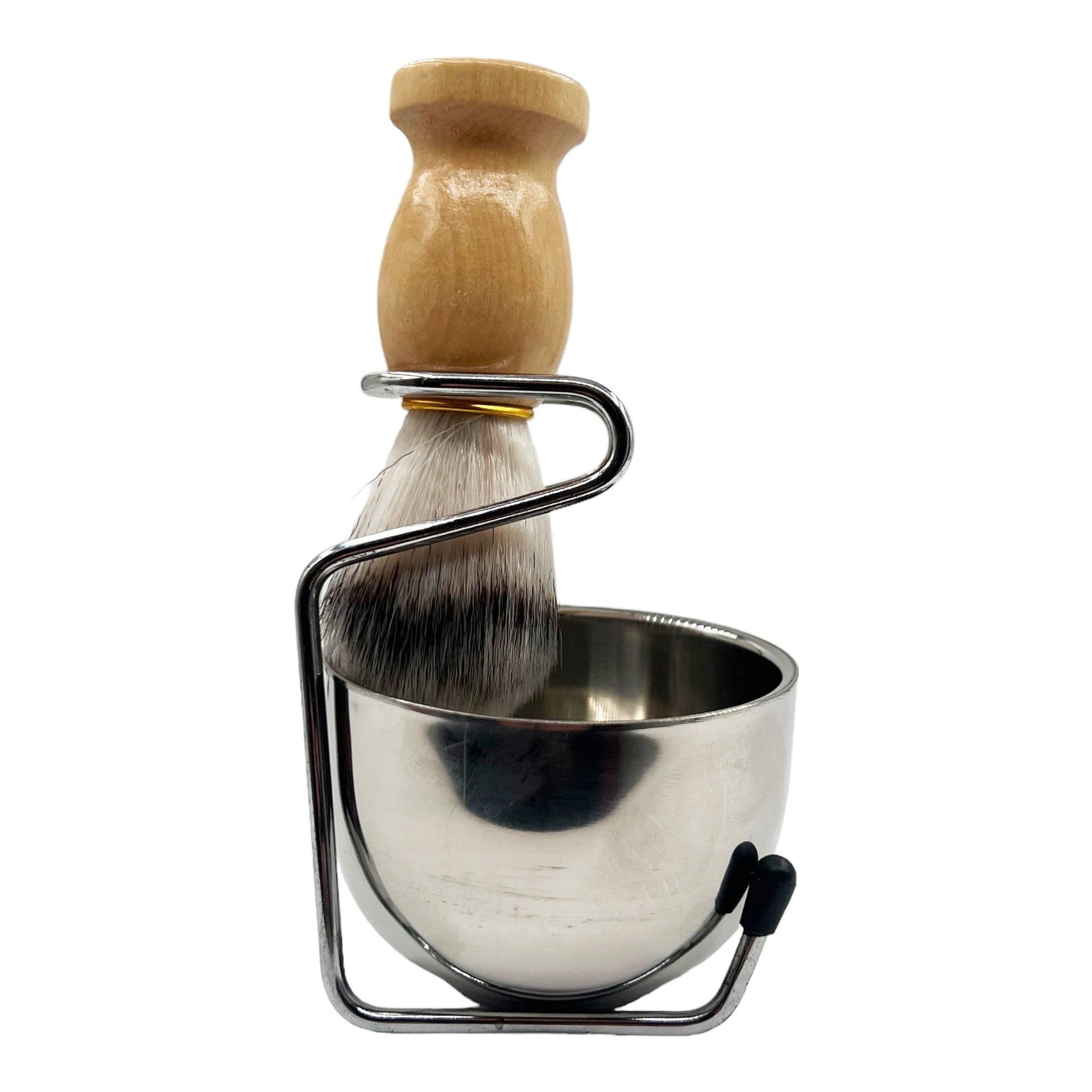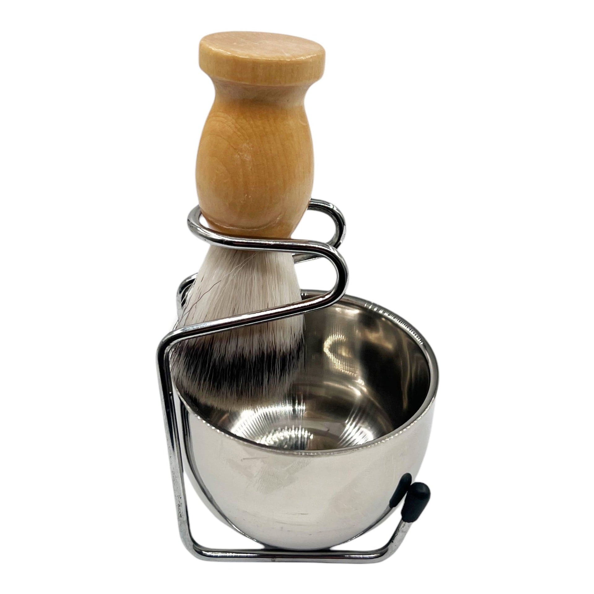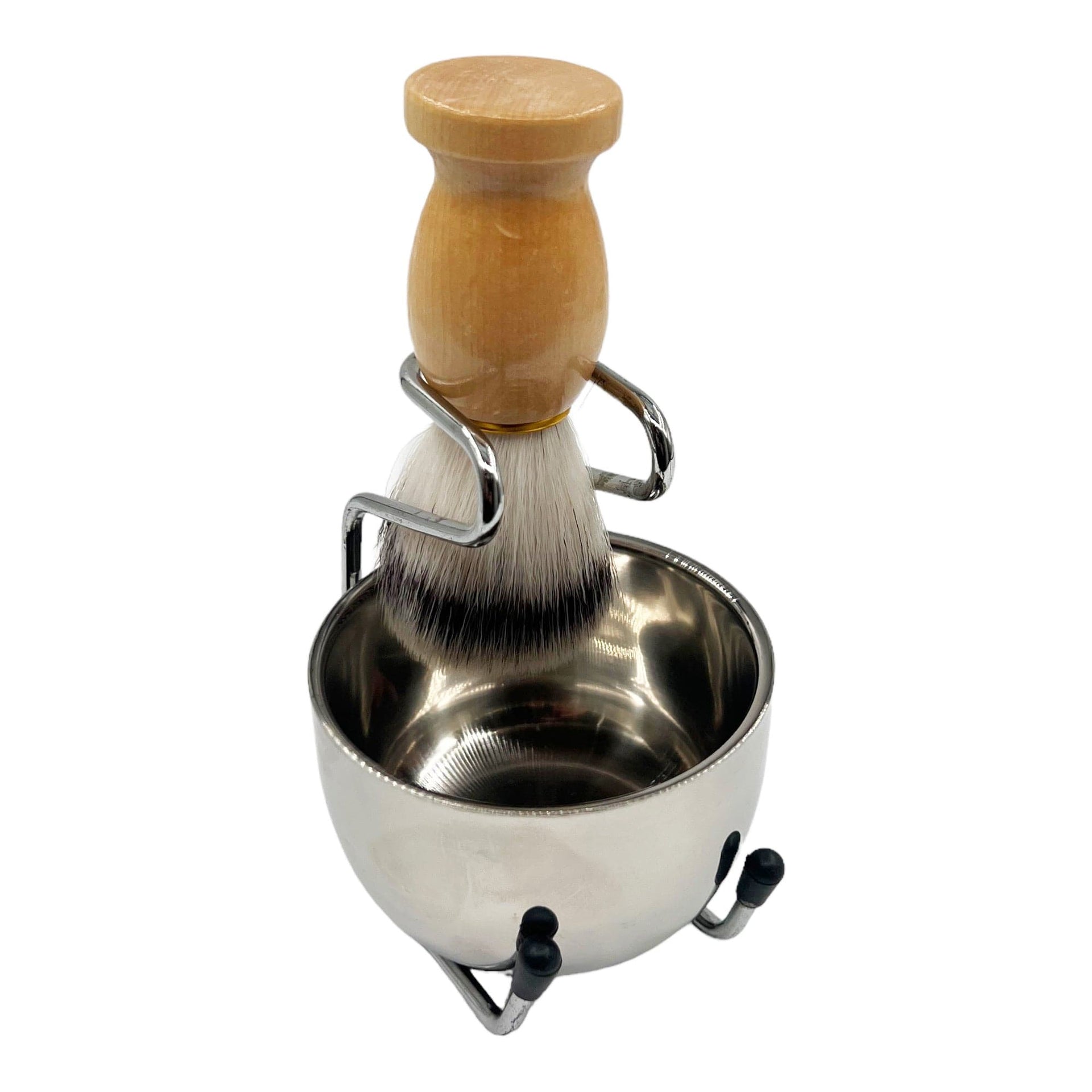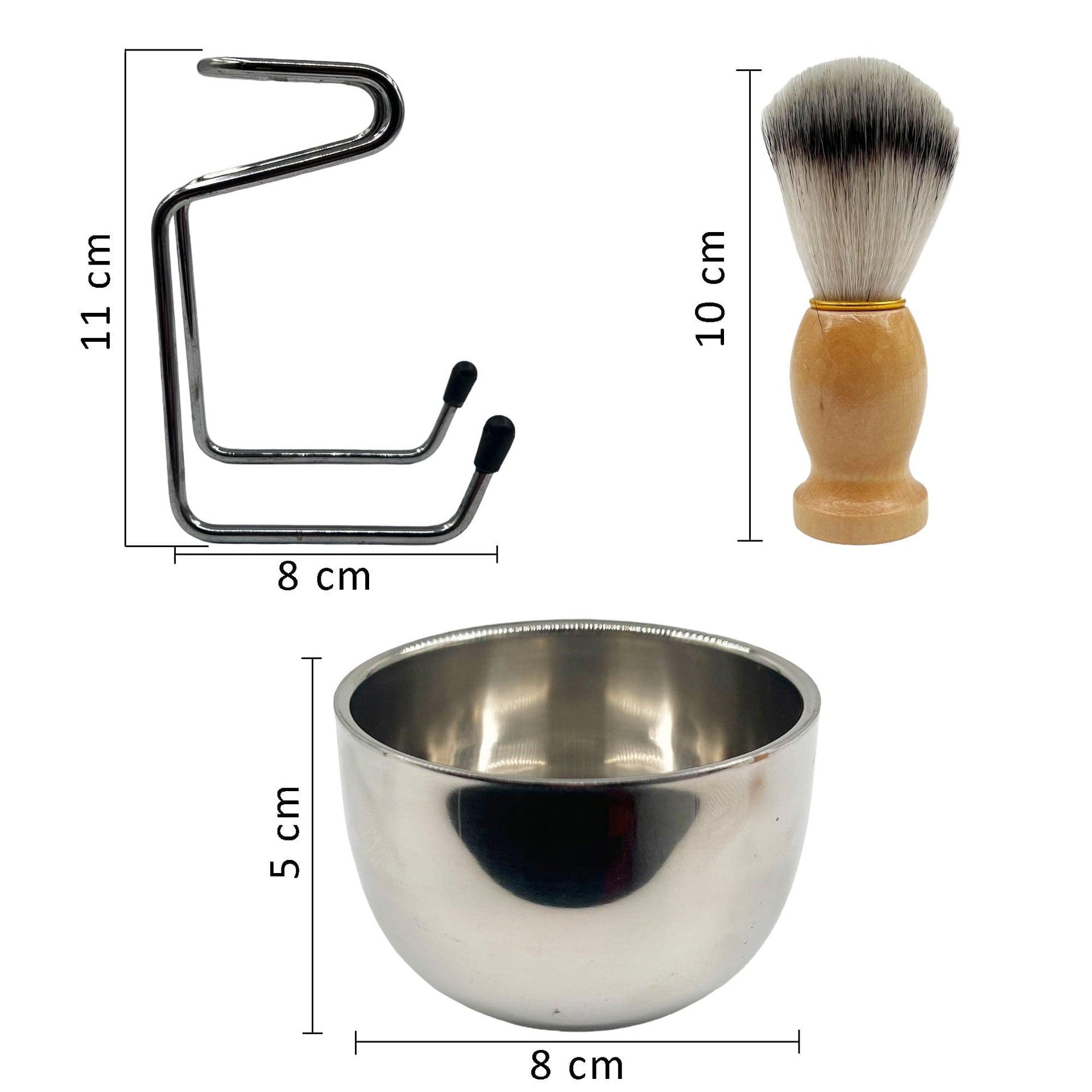 - Material: Stainless steel (bowl and stand), Wood (brush handle), Synthetic/Badger Hair (brush bristles).