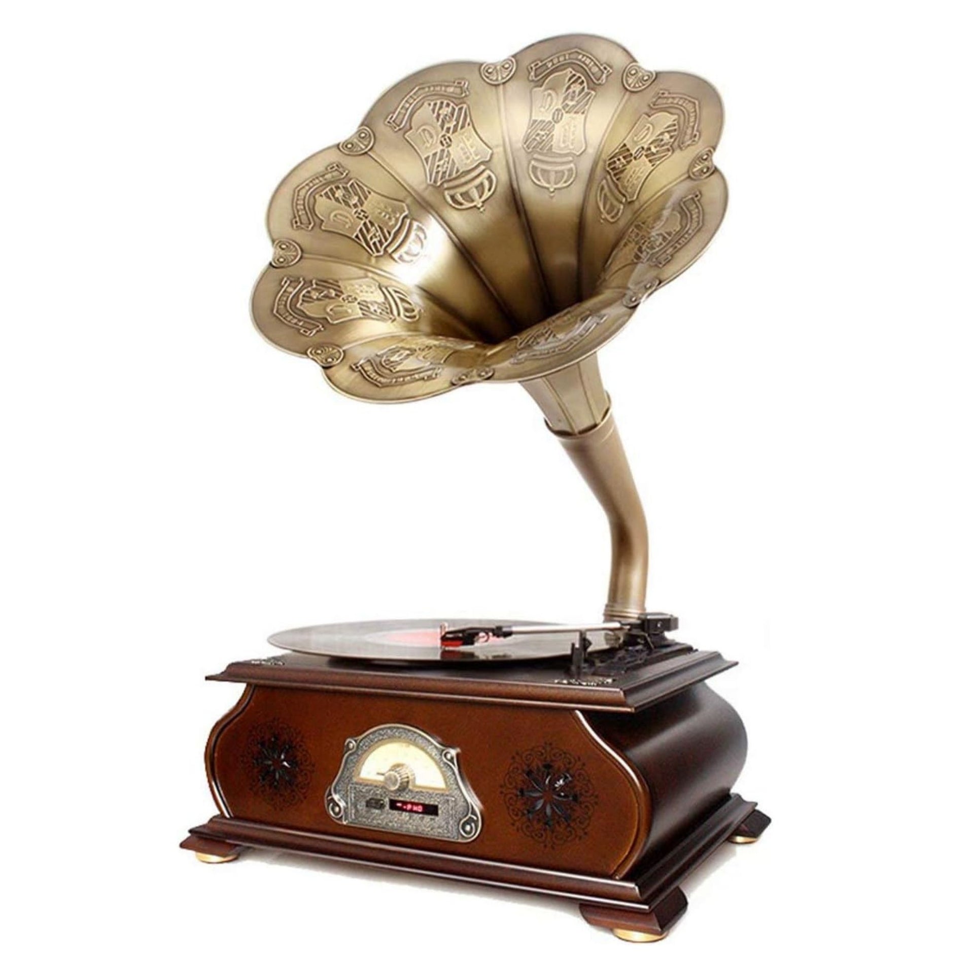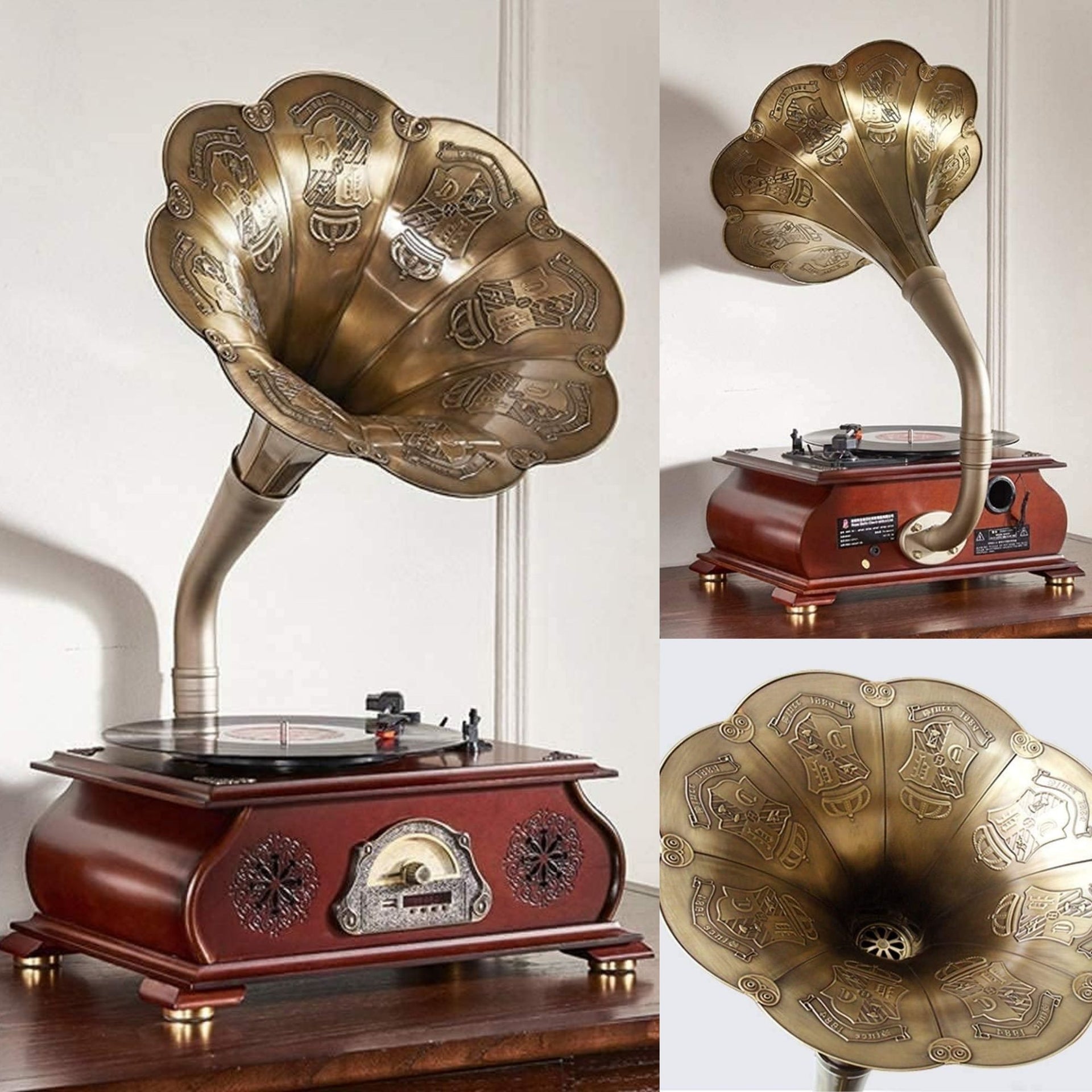 - A stunning vintage gramophone design with a hand-carved oak base and pure copper horn.