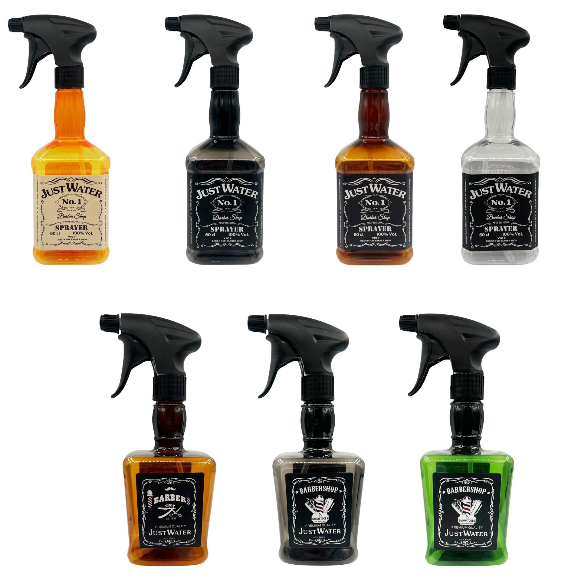 - A stylish spray bottle with a classic whiskey bottle design and nostalgic barbershop graphics.