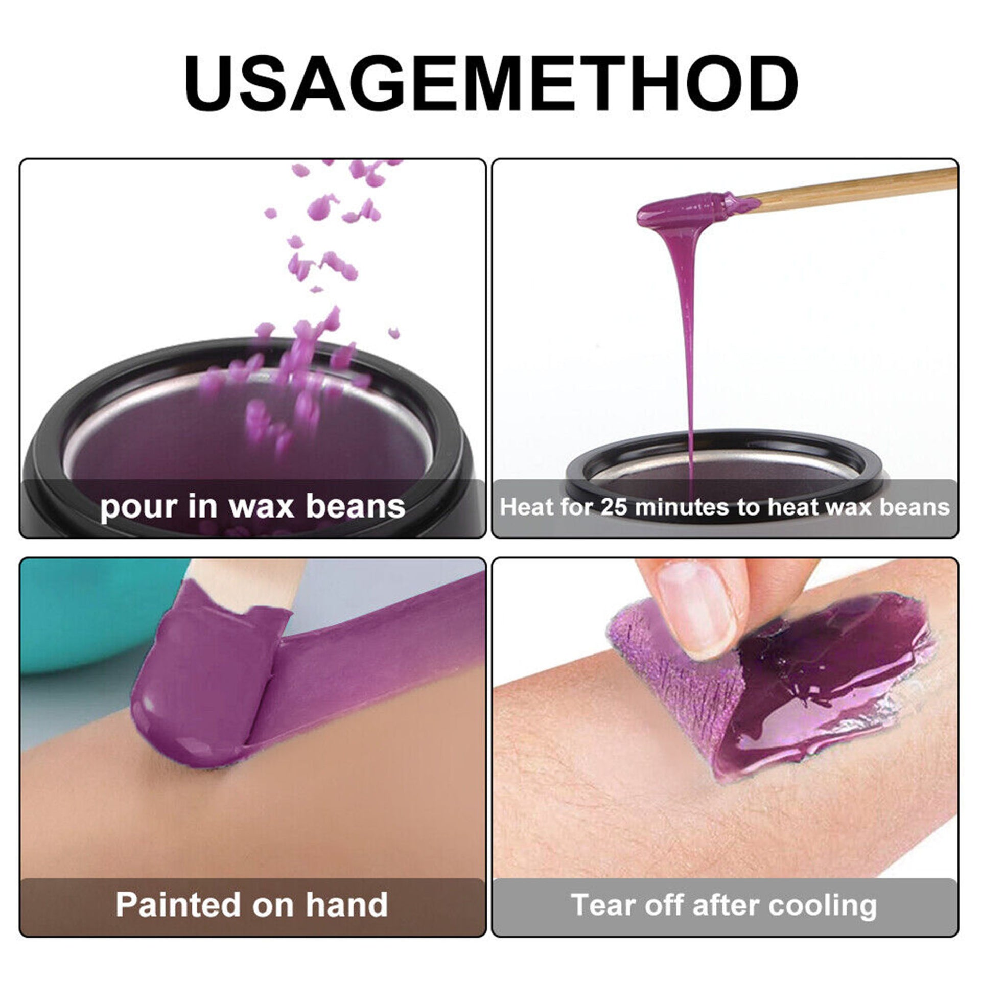 Place wax in chamber, select appropriate temperature setting, and allow 30 minutes for thorough heating. Test temperature before application.