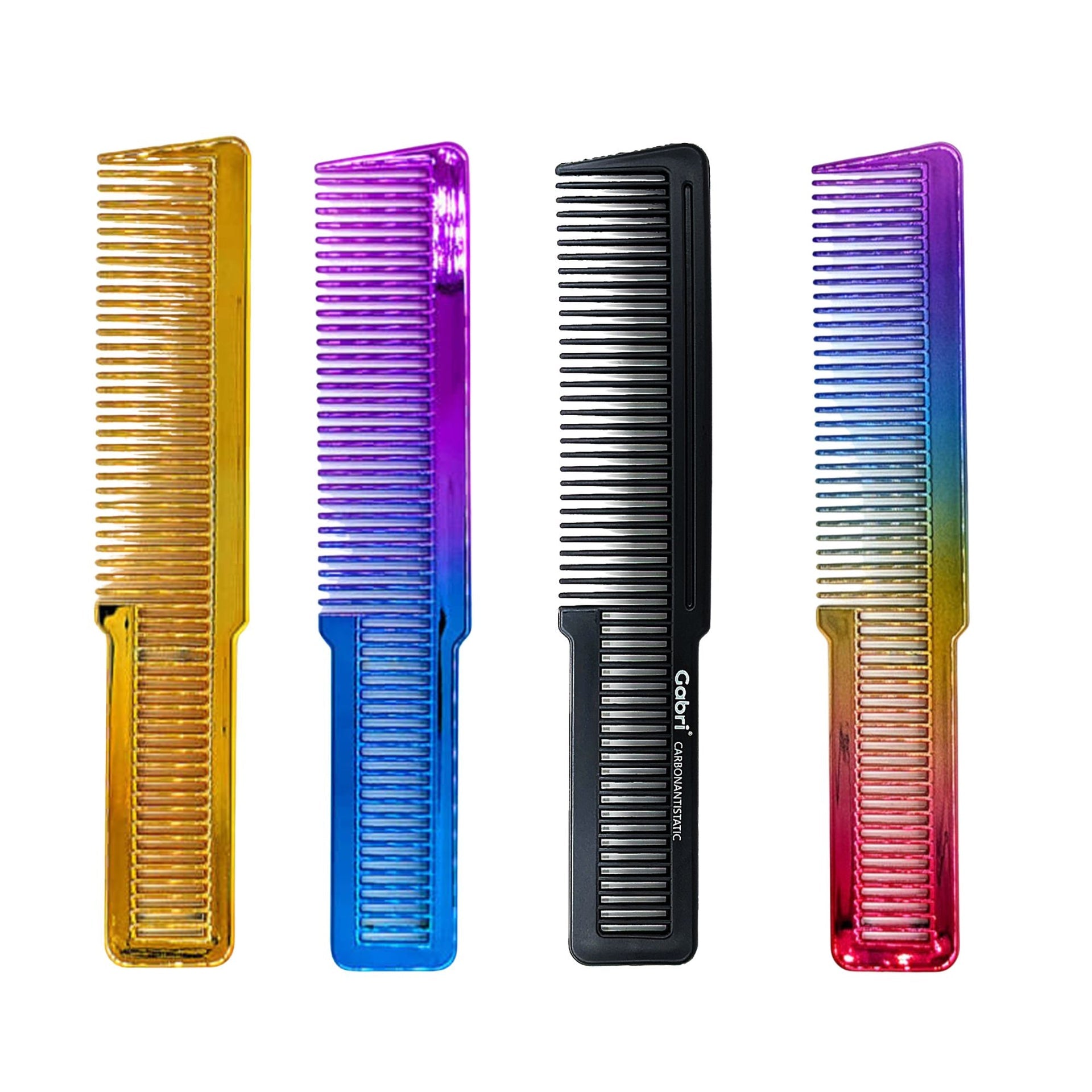 Elevate your styling toolkit with these striking professional-grade combs designed for precision cutting, sectioning and creating flawless flat top styles. The Gabri Flat Top Combs are available in four eye-catching finishes—luxurious Gold, vibrant Purple-Blue ombré, sleek Matte Black, and statement-making Rainbow gradient—allowing you to express your personal style whilst maintaining professional functionality. Each comb features the same high-performance 20cm double-sided design with perfectly spaced teeth that glide smoothly through hair without catching or causing damage, whilst the flat handle provides exceptional control for precision cutting techniques. Crafted from premium-grade plastic with a stunning metallic effect finish (except for the sophisticated Matte Black option), these combs combine lightweight handling with exceptional durability to withstand the demands of daily professional use.