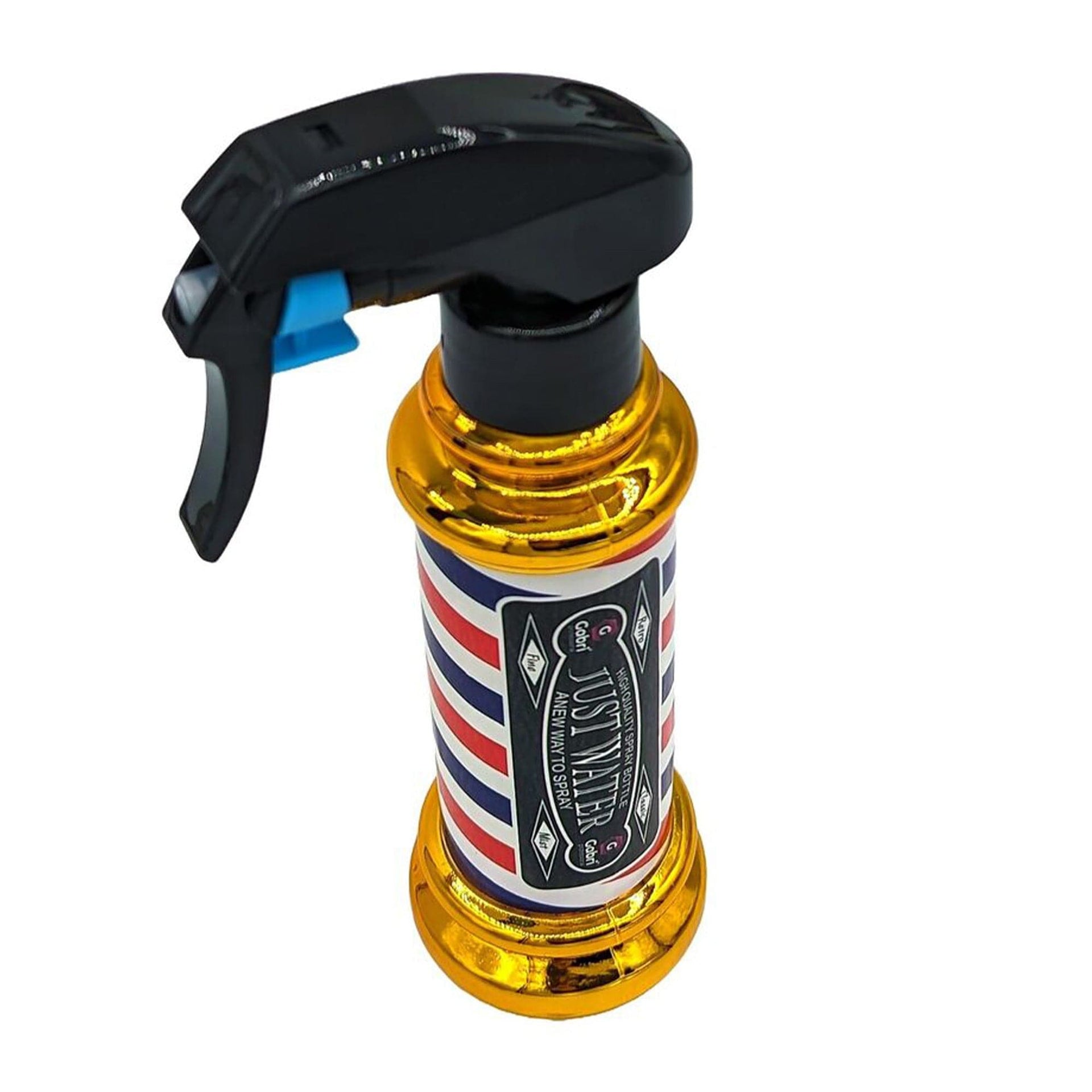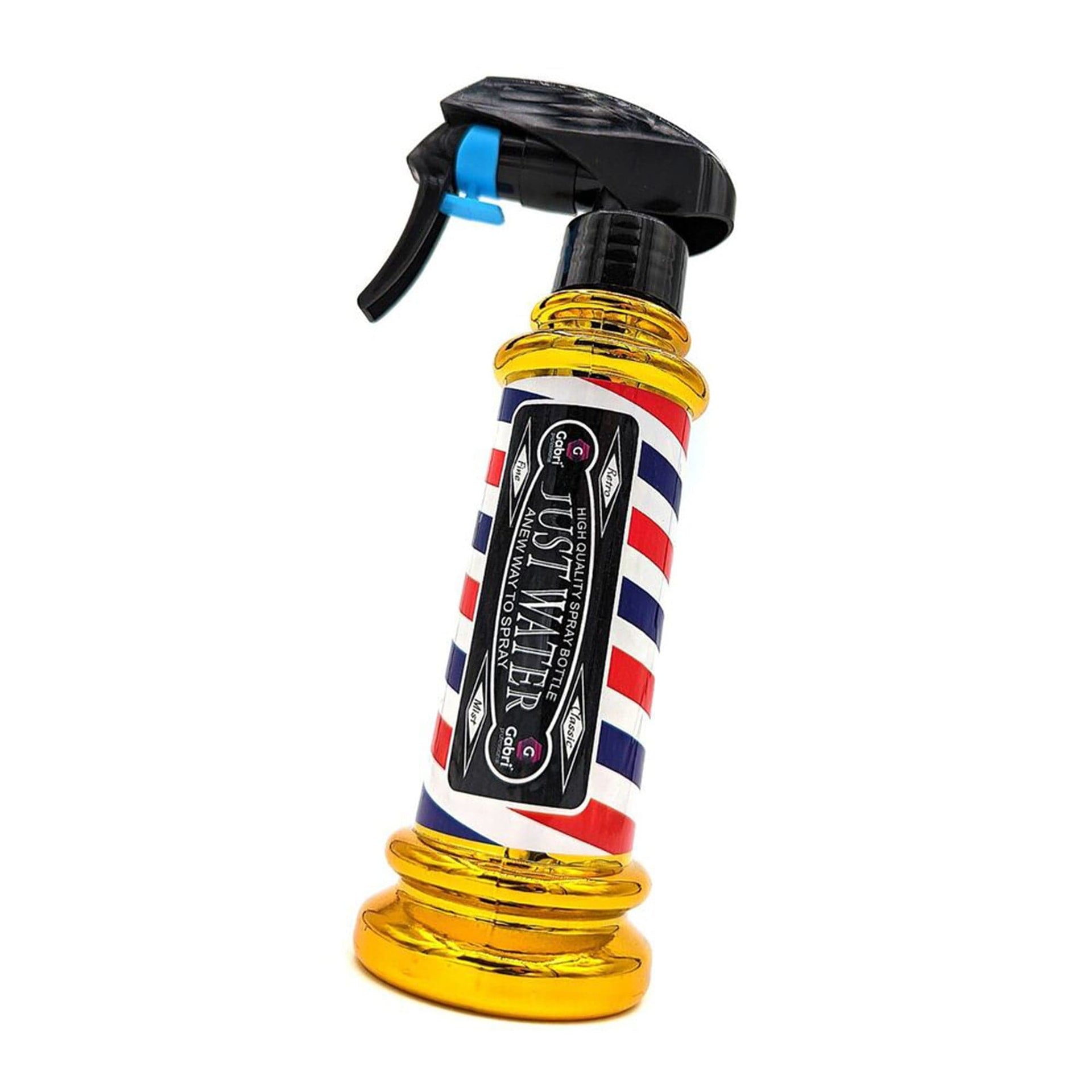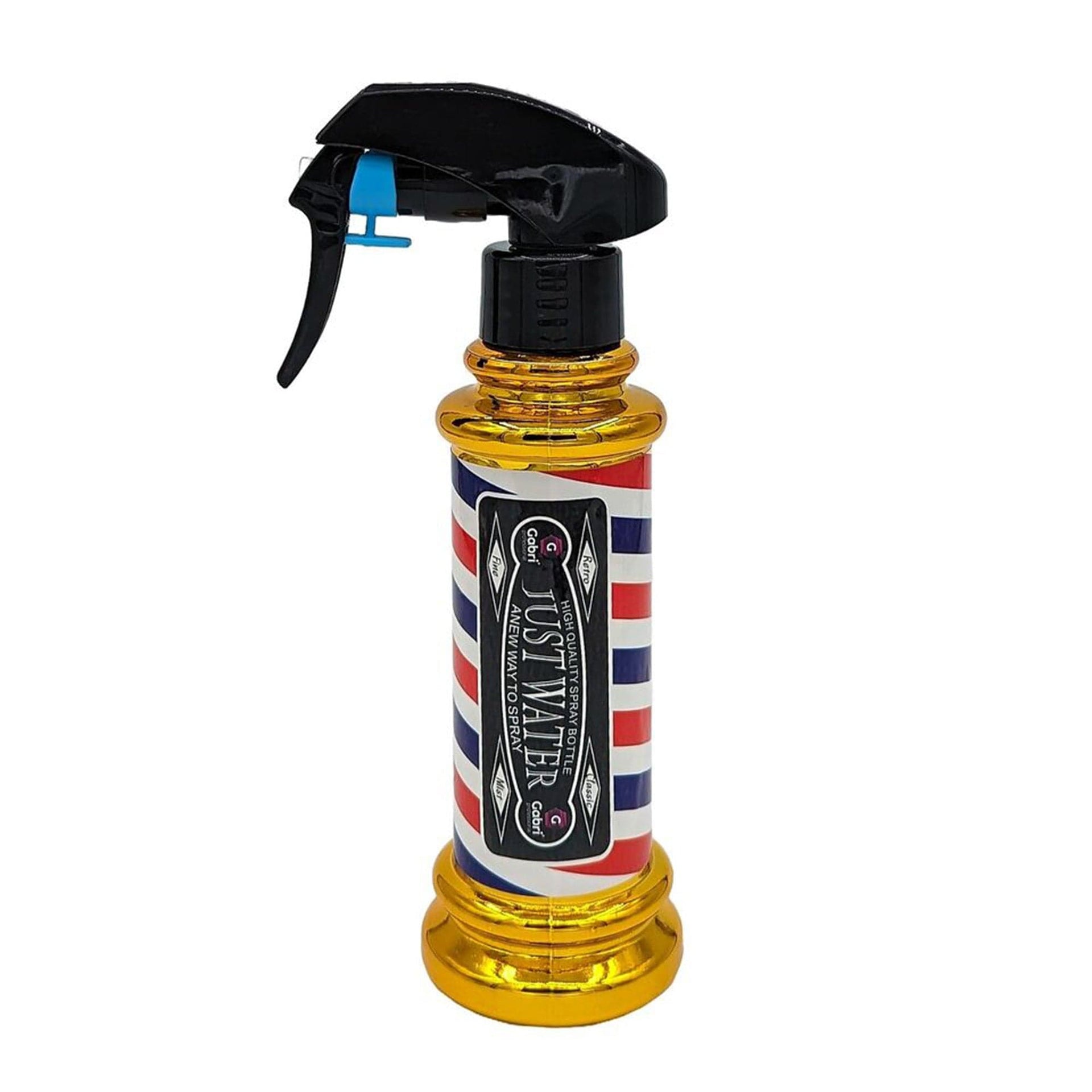 - Professional-grade barber spray bottle with classic striped design and adjustable nozzle for controlled moisture application.