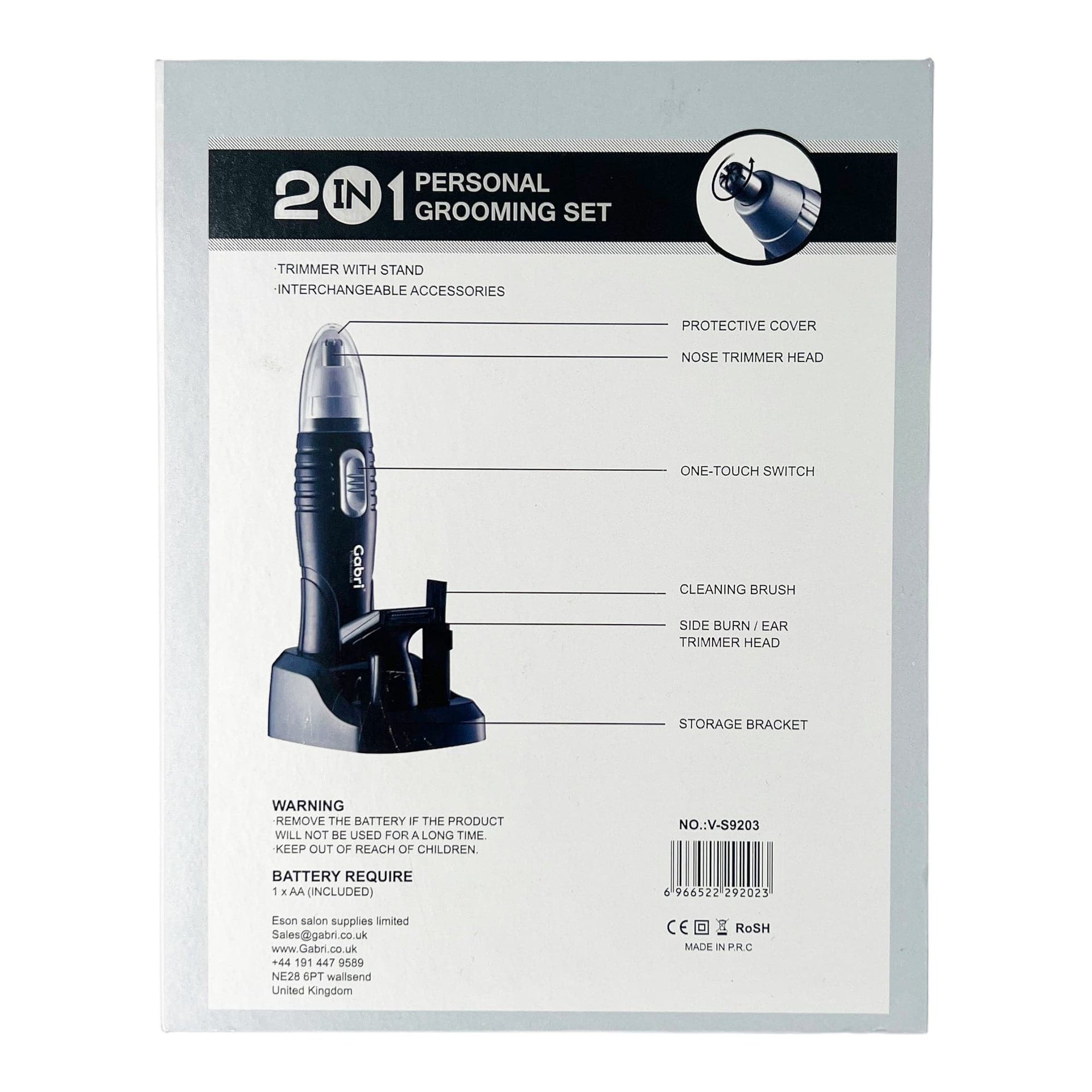 The Gabri - Hair Trimmer 2in1 Grooming Set V-S9203 stands as your consummate solution for all personal grooming requirements. Engineered with meticulous precision and ultimate convenience in mind, this comprehensive set encompasses a versatile trimmer complete with easily interchangeable attachments. These are perfectly suited for the precise trimming of nose, ear, beard, eyebrow, and sideburn hair. Each high-quality precision trimming head ensures an impeccably clean and accurate cut every single time, guaranteeing a consistently sharp finish. Furthermore, the user-friendly one-touch switch and robust protective cover contribute to effortless operation and straightforward maintenance, making this set a true pleasure to use.