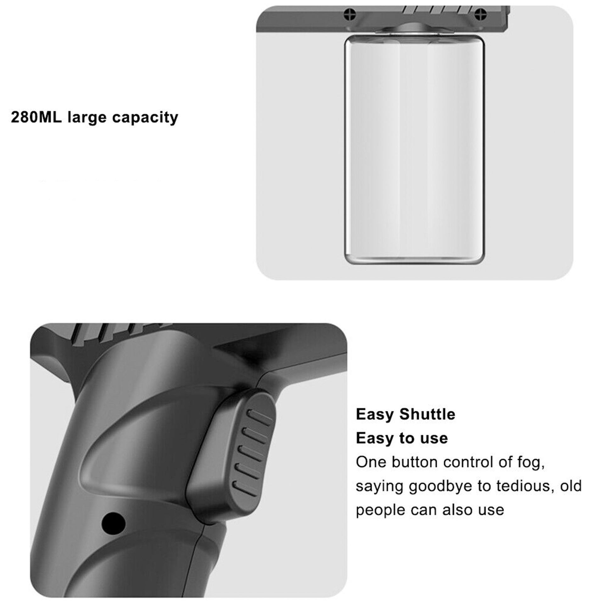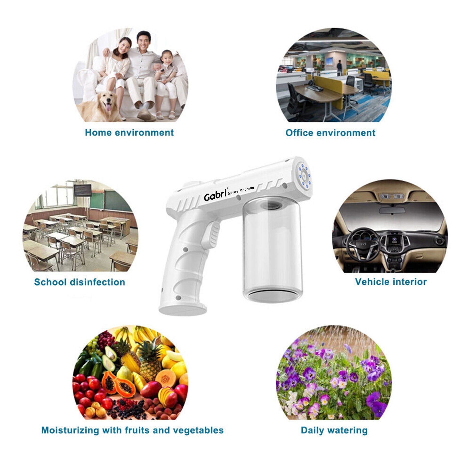Fill container with desired solution, press mechanical switch to activate spray, adjust distance for optimal coverage (recommended 1-1.5m). Clean nozzle after each use and charge regularly.