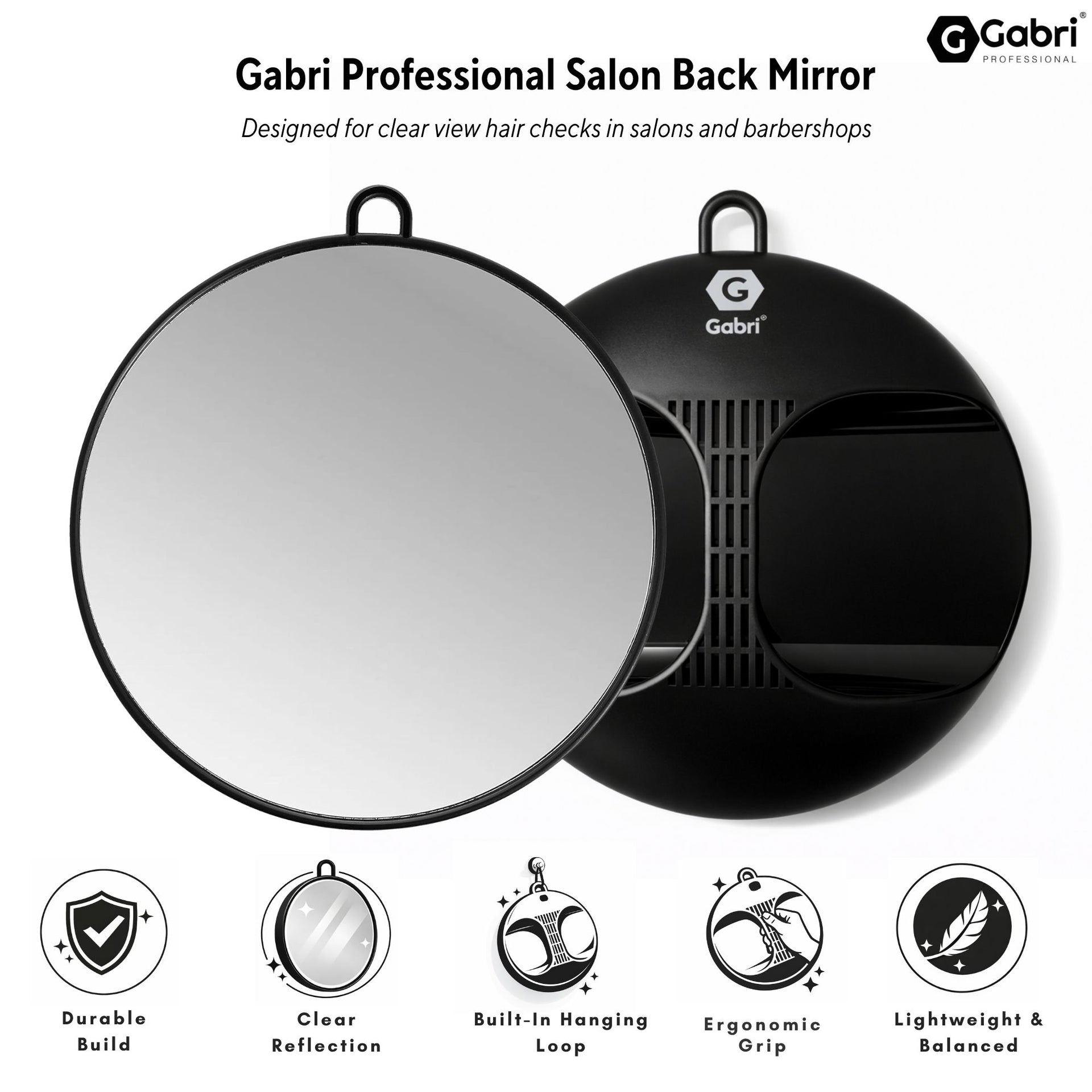 Gabri - Salon Mirror Round Handheld & Wall Black 28cm is designed to give clients a clear, full view of the back and sides of their finished hairstyle. With its 28cm round mirror face, it is ideal for salons and barbershops that want to present every cut, fade or style with confidence. The mirror provides a sharp, true-to-life reflection for more professional final checks and client consultations. Its black finish gives it a clean, modern look that suits both classic and contemporary salon interiors. The lightweight construction makes it easy to hold throughout the day without unnecessary strain. Built for regular professional use, it offers a practical balance of comfort, presentation and durability. It is a reliable and professional choice for stylists who want a salon mirror that looks smart and performs well every day.