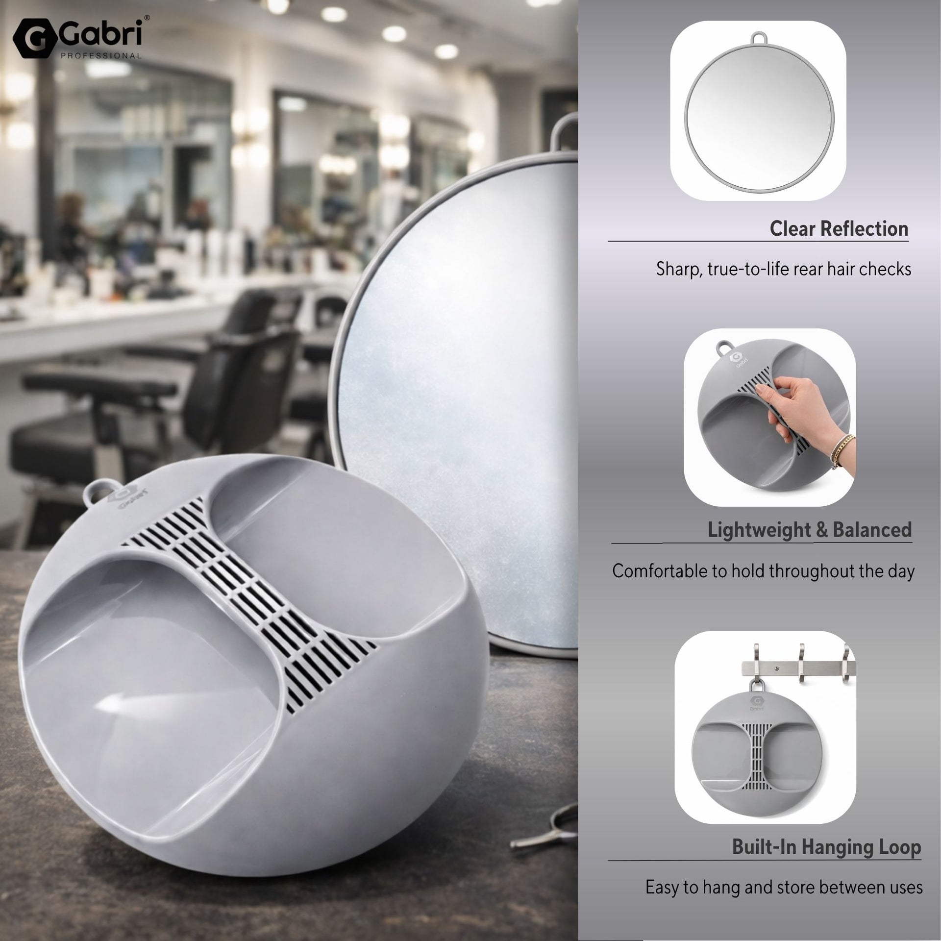 Gabri - Salon Mirror Round Handheld & Wall Grey 28cm is designed to give clients a clear, full view of the back and sides of their finished hairstyle. With its 28cm round mirror face, it is ideal for salons and barbershops that want to present every cut, fade or style with confidence. The mirror provides a sharp, true-to-life reflection for more professional final checks and client consultations. Its grey finish gives it a clean, modern look that suits a wide range of salon interiors. The lightweight construction makes it easy to hold throughout the day without unnecessary strain. Built for regular professional use, it offers a practical balance of comfort, presentation and durability. It is a reliable and professional choice for stylists who want a salon mirror that looks smart and performs well every day.