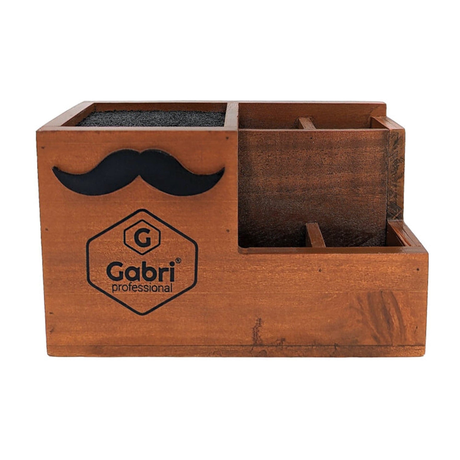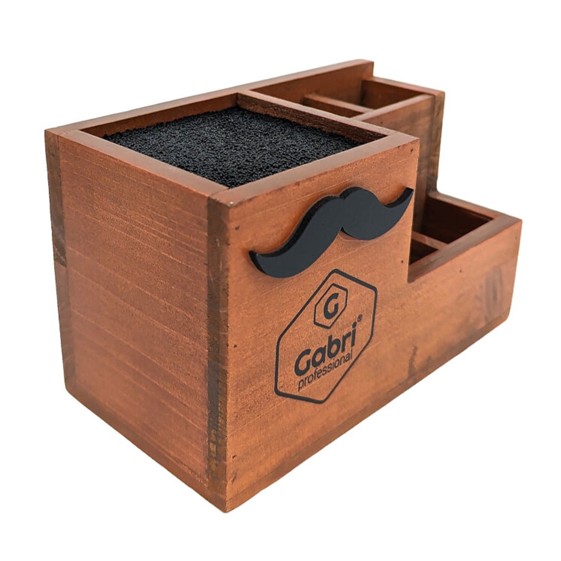 Elevate your styling station with the Gabri Scissor & Brush Holder Wooden Stand, a perfect blend of rustic charm and practical organisation for the discerning barber or hairstylist. Crafted from quality natural wood with a warm, rich finish, this multi-compartment organiser features a distinctive moustache emblem that adds a touch of classic barbershop character to any professional or home setting. The thoughtfully designed layout includes a generous scissor compartment with protective bristle insert that securely holds your cutting tools whilst preventing damage to delicate blades, alongside multiple dedicated sections for brushes, combs, and additional styling accessories. Its compact yet sturdy construction occupies minimal counter space whilst providing maximum organisation, allowing you to maintain a tidy, professional workspace that enhances both efficiency and aesthetic appeal.