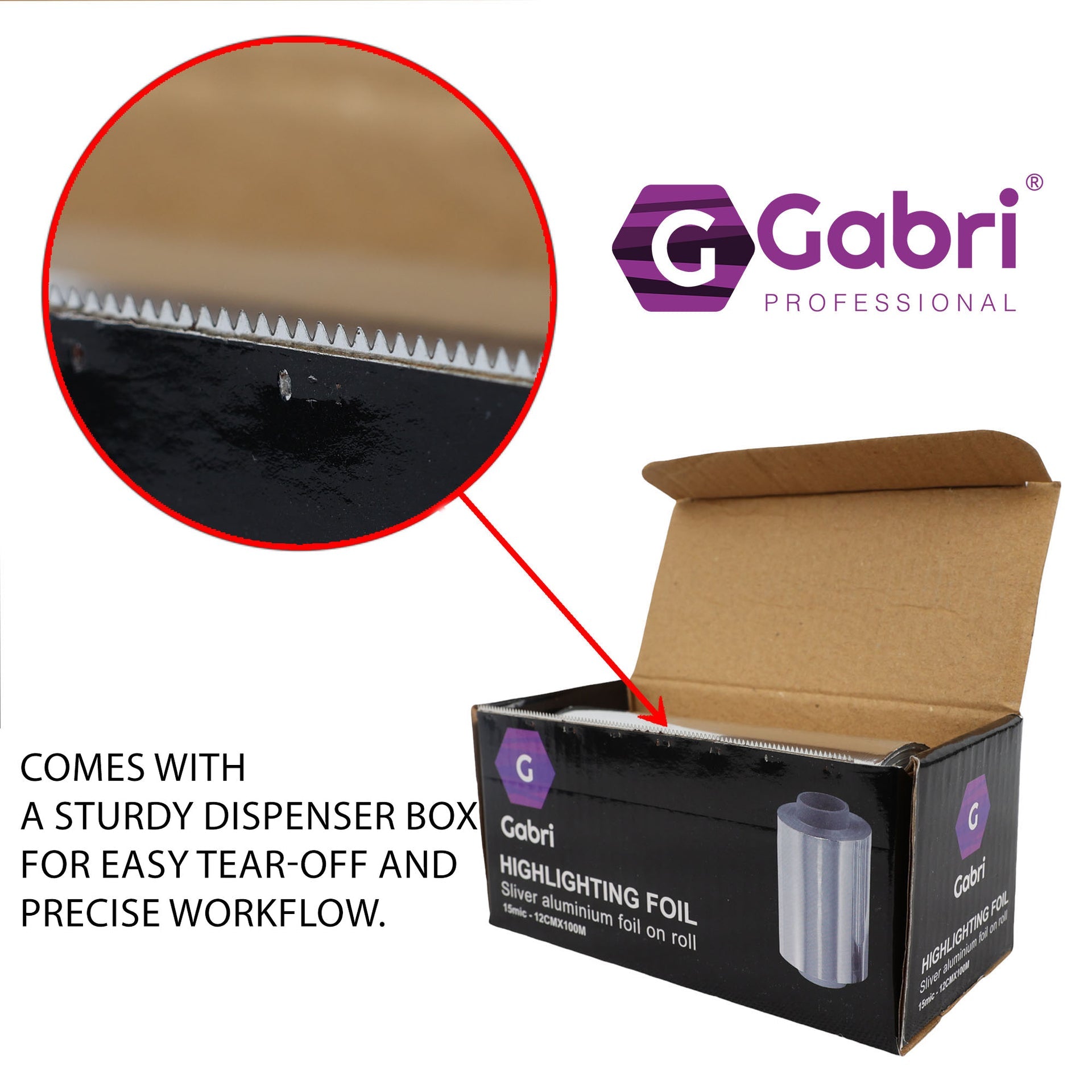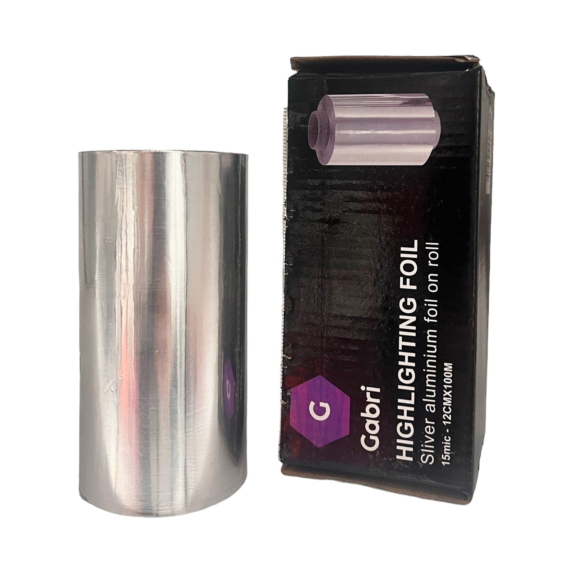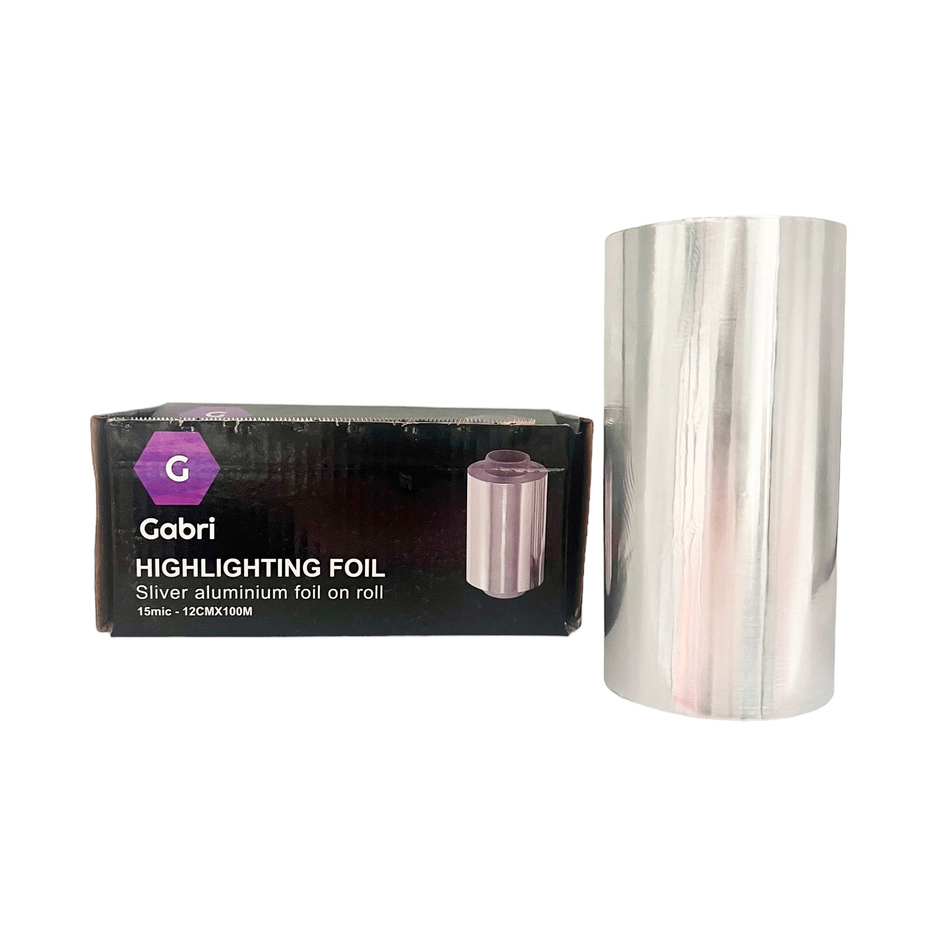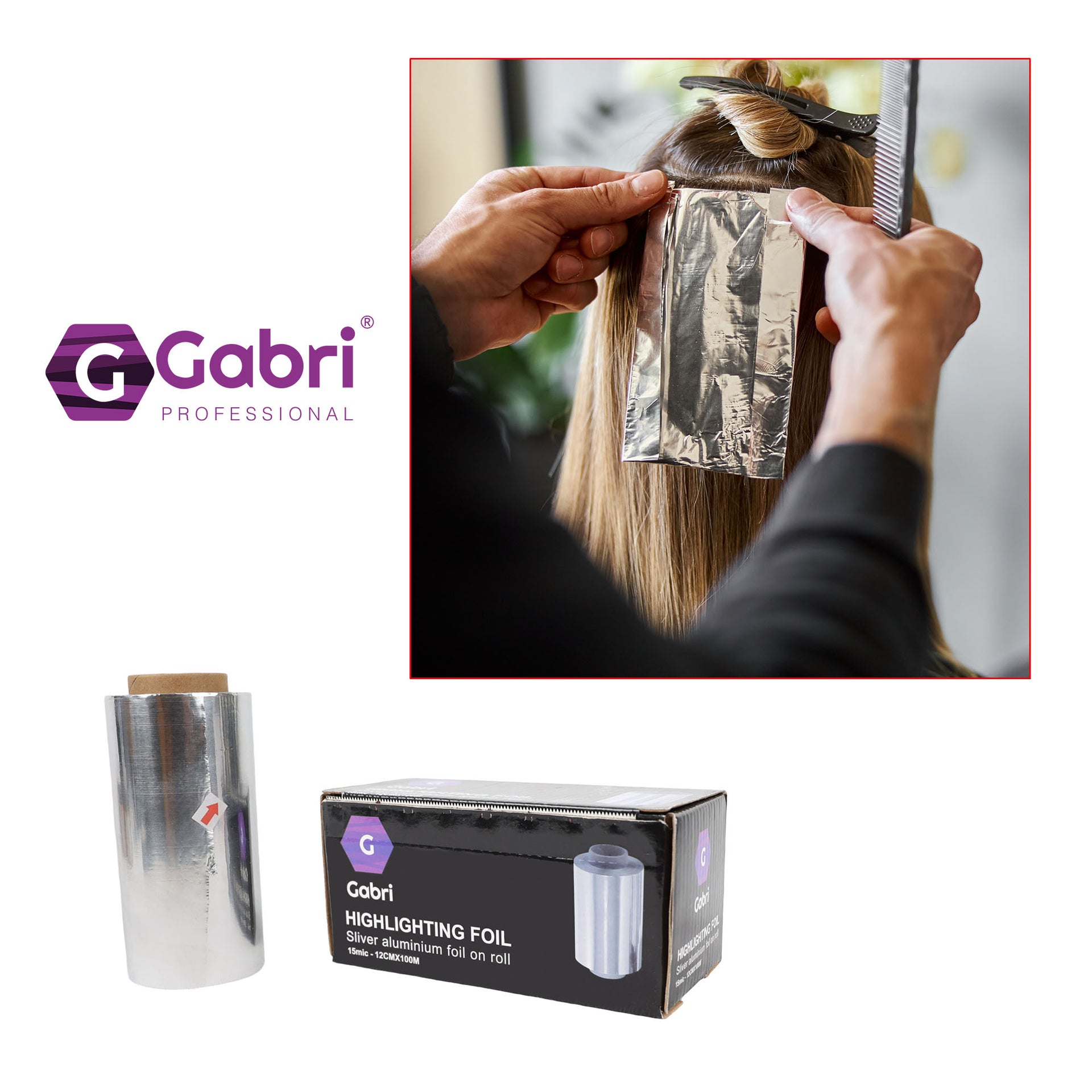 Elevate your colour services with Gabri Highlighting Foil Silver Aluminium Foil On Roll, the professional-grade solution designed specifically for precise, consistent results in all highlighting and colouring techniques. This premium 12cm wide foil comes in a generous 100-metre roll housed in a convenient dispenser box that allows for clean, easy tear-off without tangling or wastage. Crafted from high-quality silver aluminium, this durable foil maintains its integrity even when folded multiple times during complex techniques, preventing the frustrating mid-application tears that can compromise colour results. The optimal thickness strikes the perfect balance between pliability for precise application and strength for reliable performance, making it suitable for everything from fine babylights to bold balayage and creative colour placement. Professional colourists will appreciate the superior heat conductivity that promotes even, predictable development of lighteners and colours.