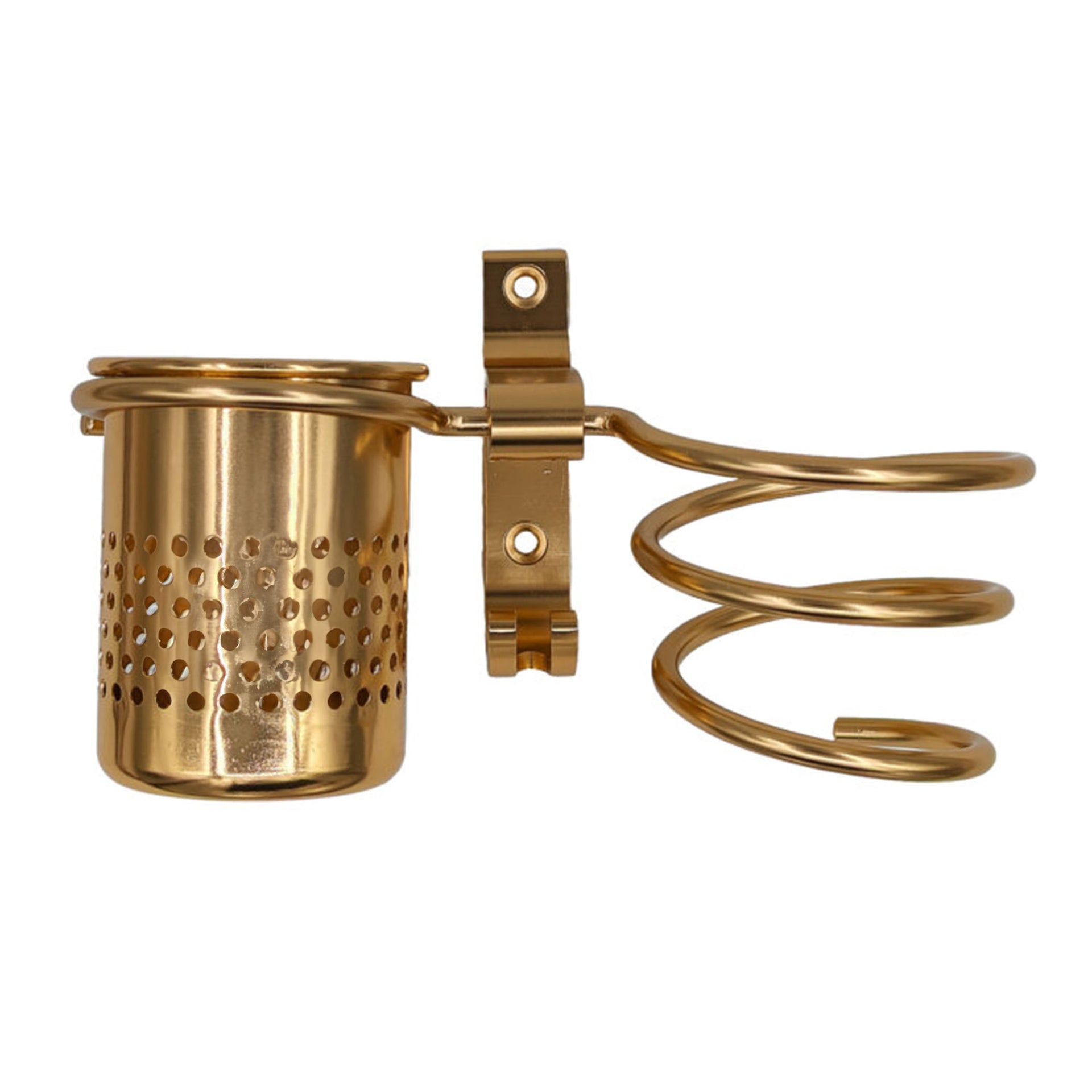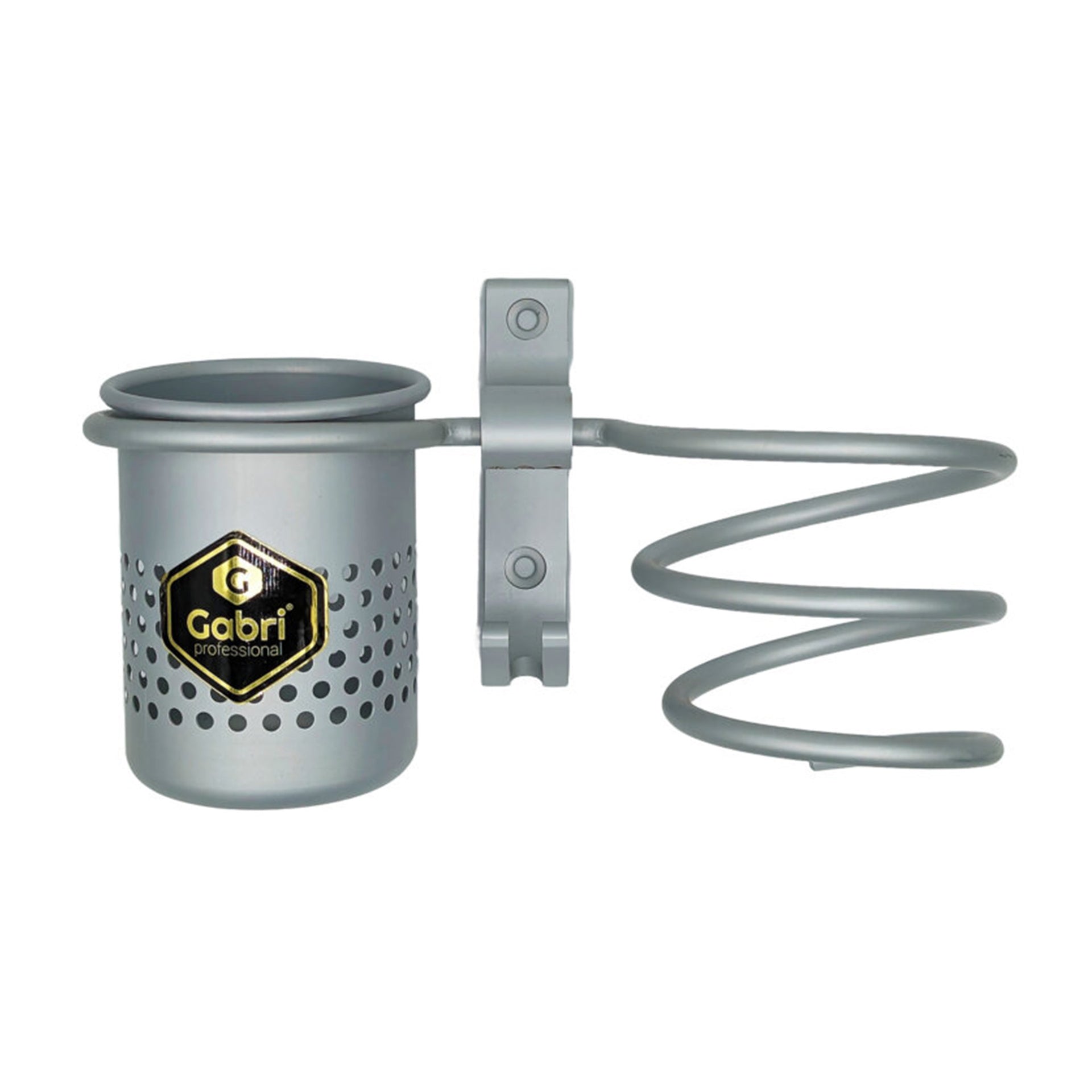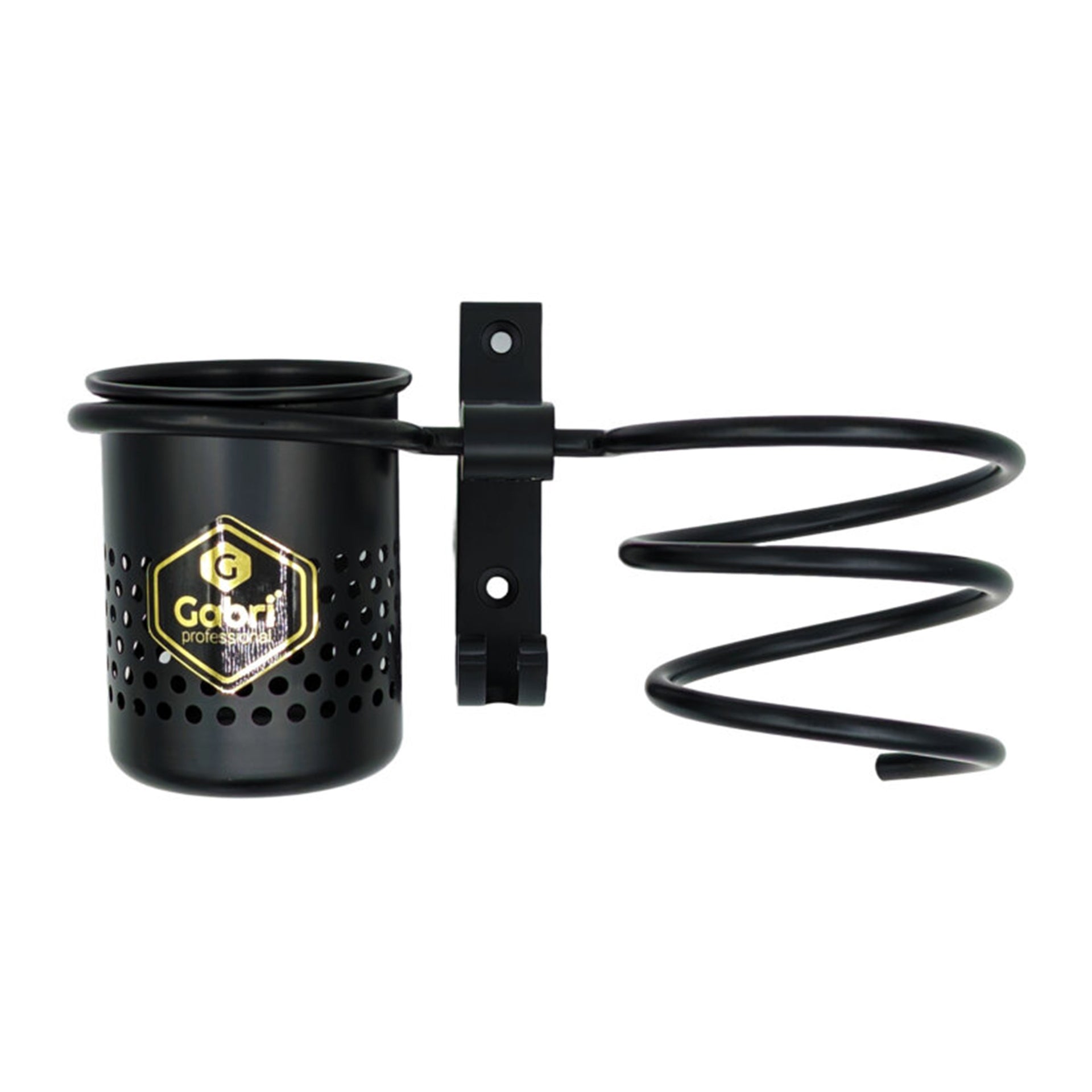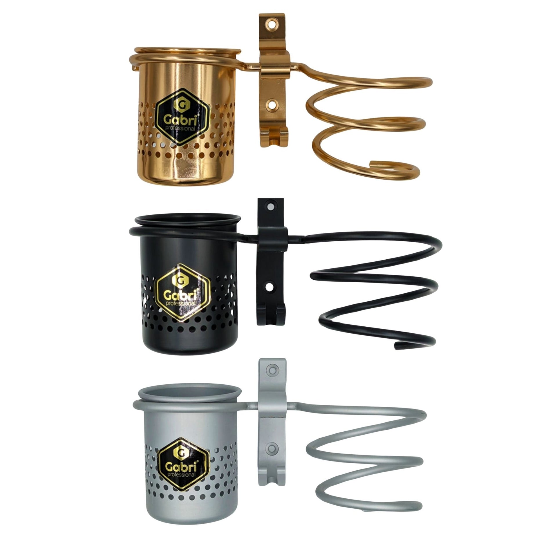 Elevate your styling space with this innovative wall-mounted storage solution. The Gabri Professional Hairdryer Holder combines sleek design with practical functionality, featuring a sturdy spiral holder and integrated storage cup. Available in elegant Gold, classic Silver, and sophisticated Black finishes, this premium organiser maximises workspace efficiency while adding a touch of luxury to any styling station.