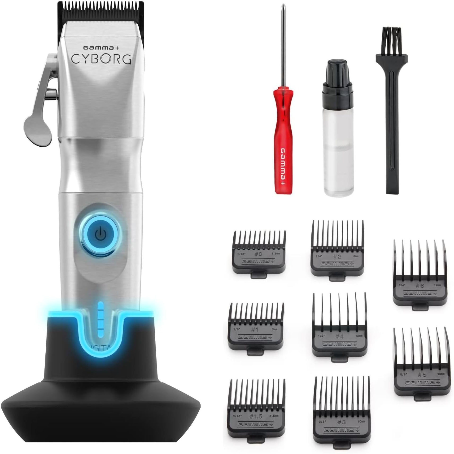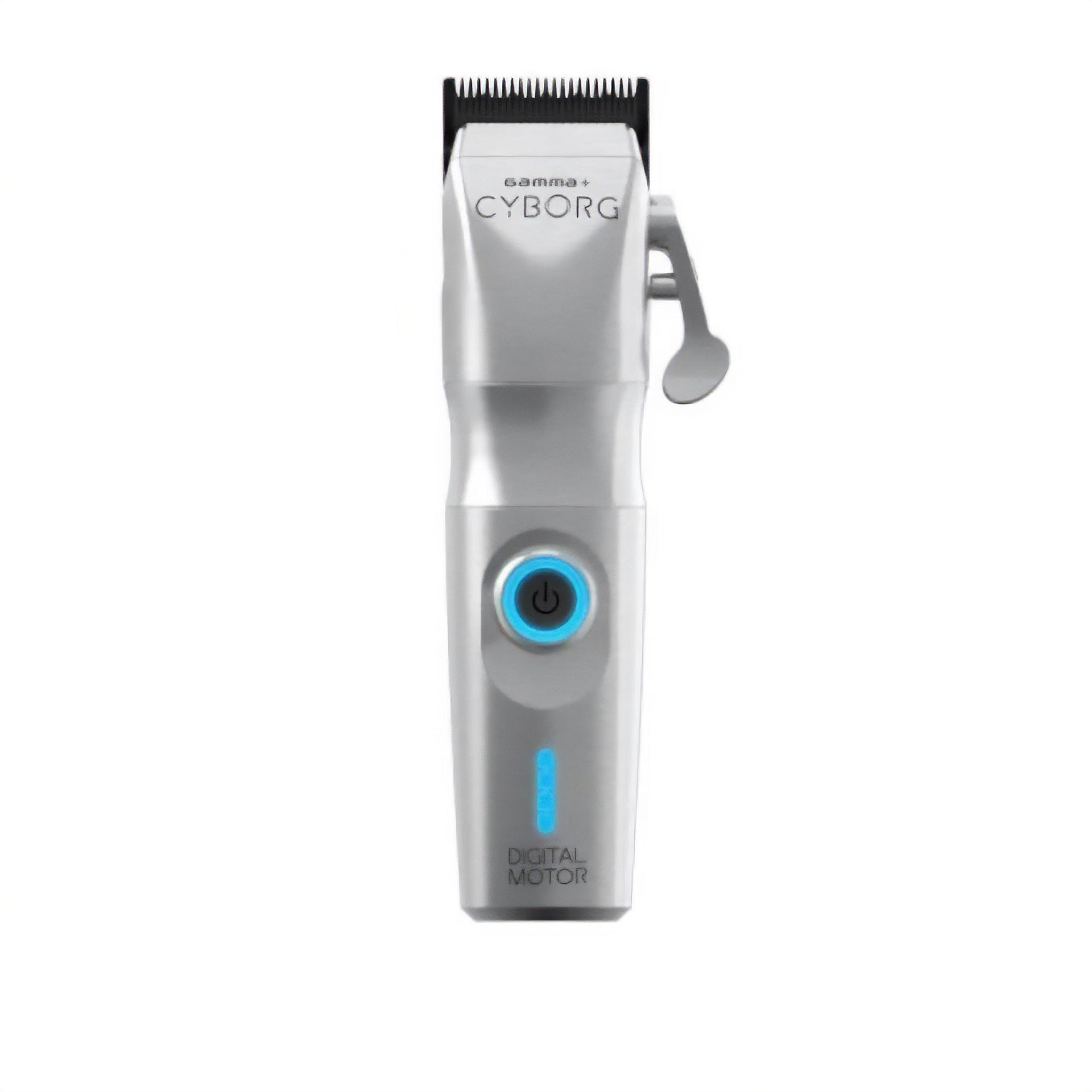The Gamma+ Cyborg Metal Clipper with Digital Motor is the perfect balance between vintage style and cutting-edge technology, offering outstanding performance in a high-tech, full-metal body. Equipped with a powerful 7500 RPM digital motor, this clipper provides high torque and smoother operation, ensuring professional-level results with minimal vibration and reduced sound. It features a sleek design with an ergonomic recessed grip, providing exceptional comfort and stability during use. With 200 minutes of runtime from a single charge and a quick 150-minute recharge time, this clipper is built for efficiency and endurance, ideal for busy barbers and stylists.