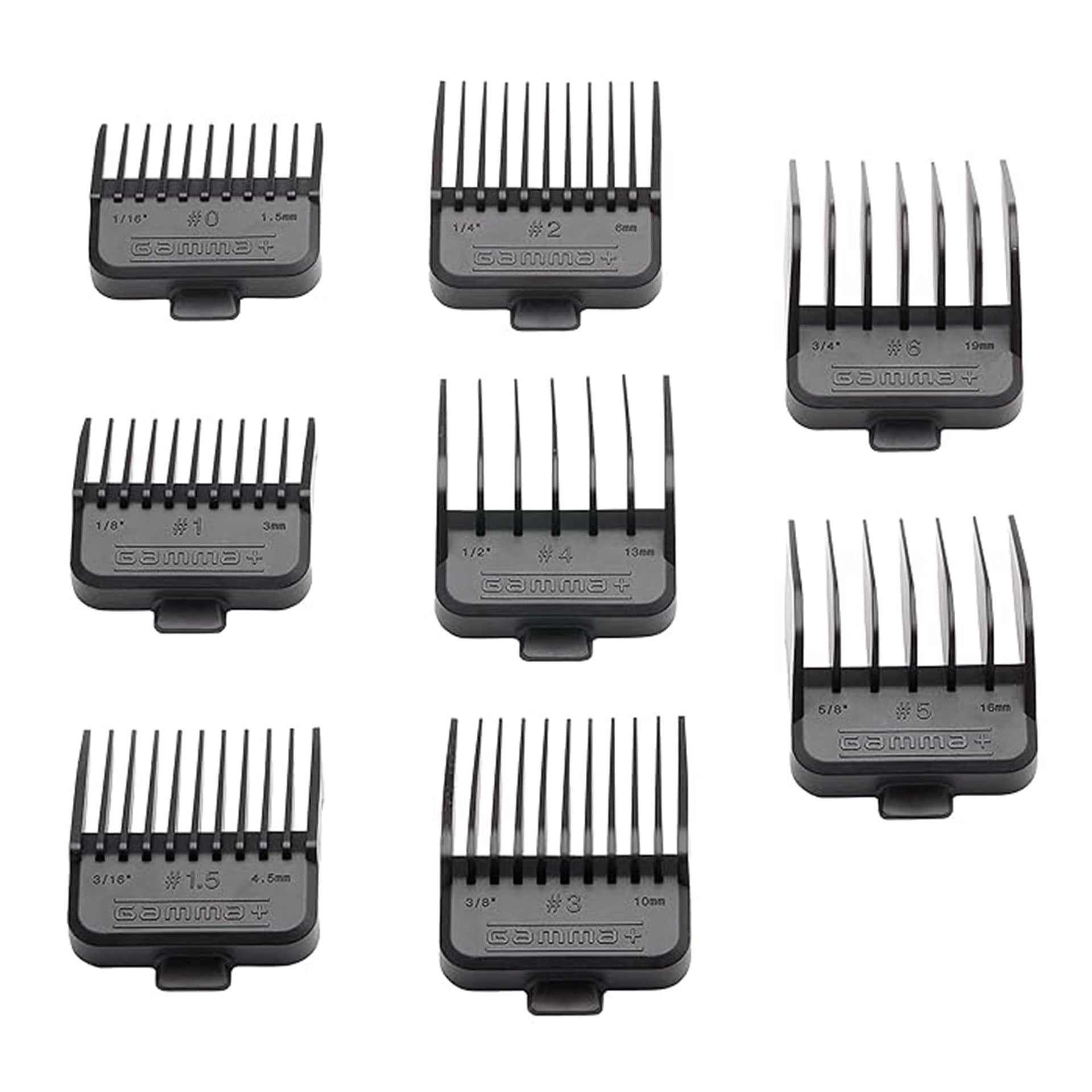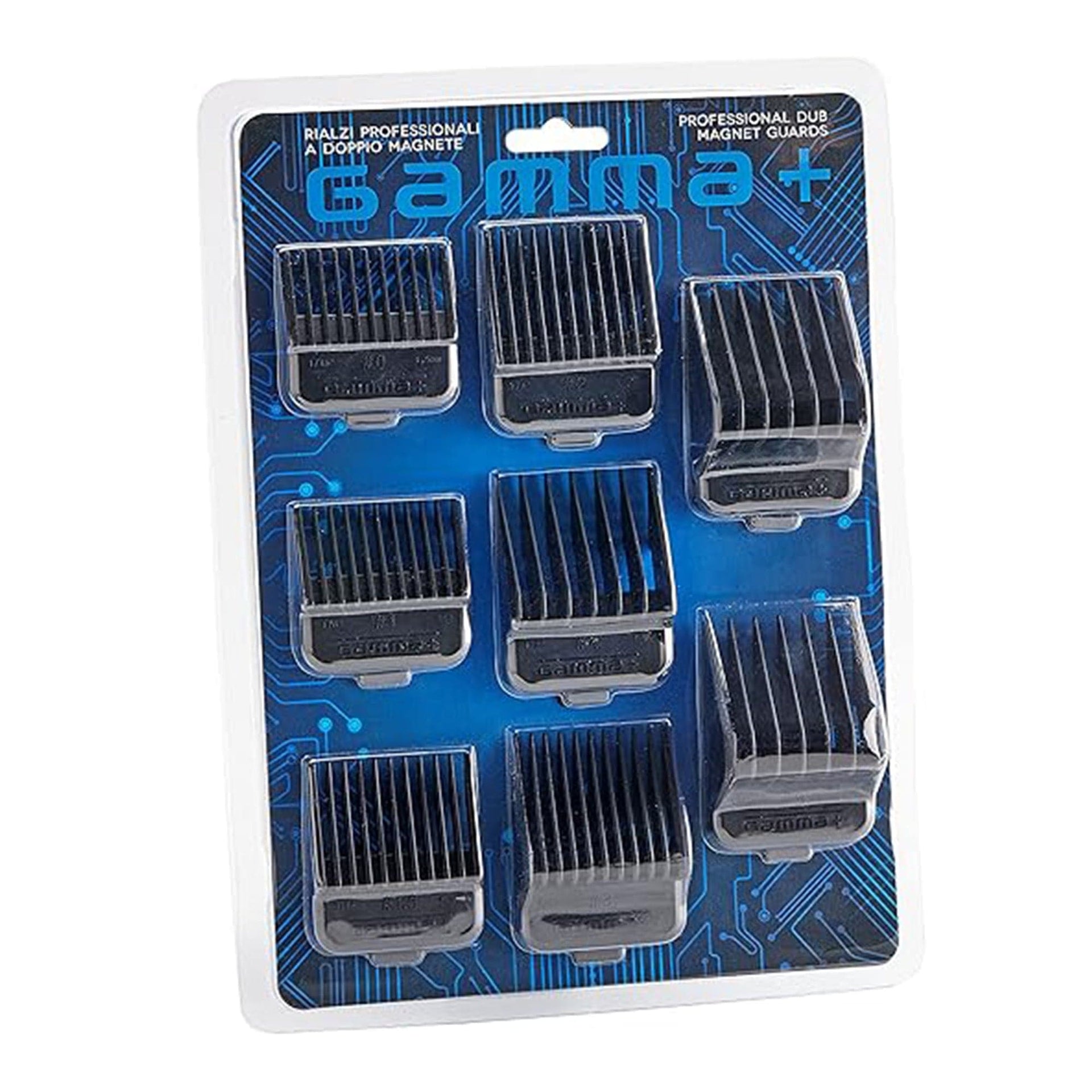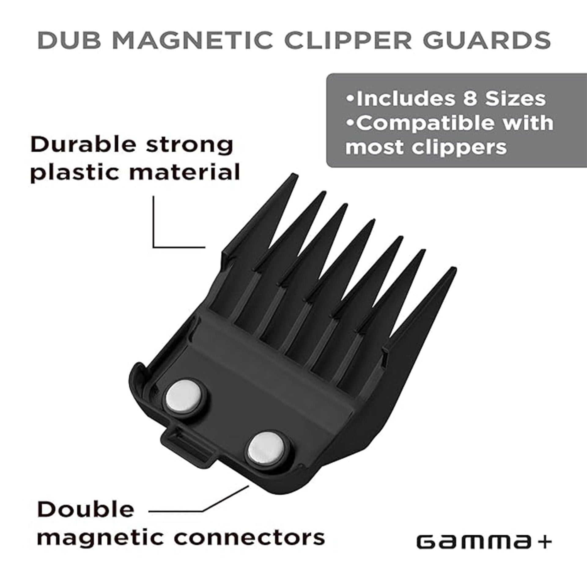 The Gamma+ Professional Dub Guard Magnets set is designed for barbers and stylists who demand precision and speed. This complete set of double Neodymium magnetic guards ensures a secure, fast, and reliable attachment to your clippers, offering a smooth and efficient trimming experience. The set includes 8 guards ranging from #0 (1.5mm) to #6 (19mm), allowing for versatile cutting options from close fades to longer trims. These premium-quality guards are compatible with all Gamma+ clippers and most other professional brands, making them an excellent addition to your toolkit. The magnetic design not only guarantees a secure fit but also enables quick changes between guards, saving valuable time during busy appointments. Engineered for durability, the Gamma+ Dub Guard Magnets are built to withstand daily use, providing consistent results with every cut. Whether you're working in a high-paced salon or perfecting your craft at home, these guards ensure professional-level performance every time.