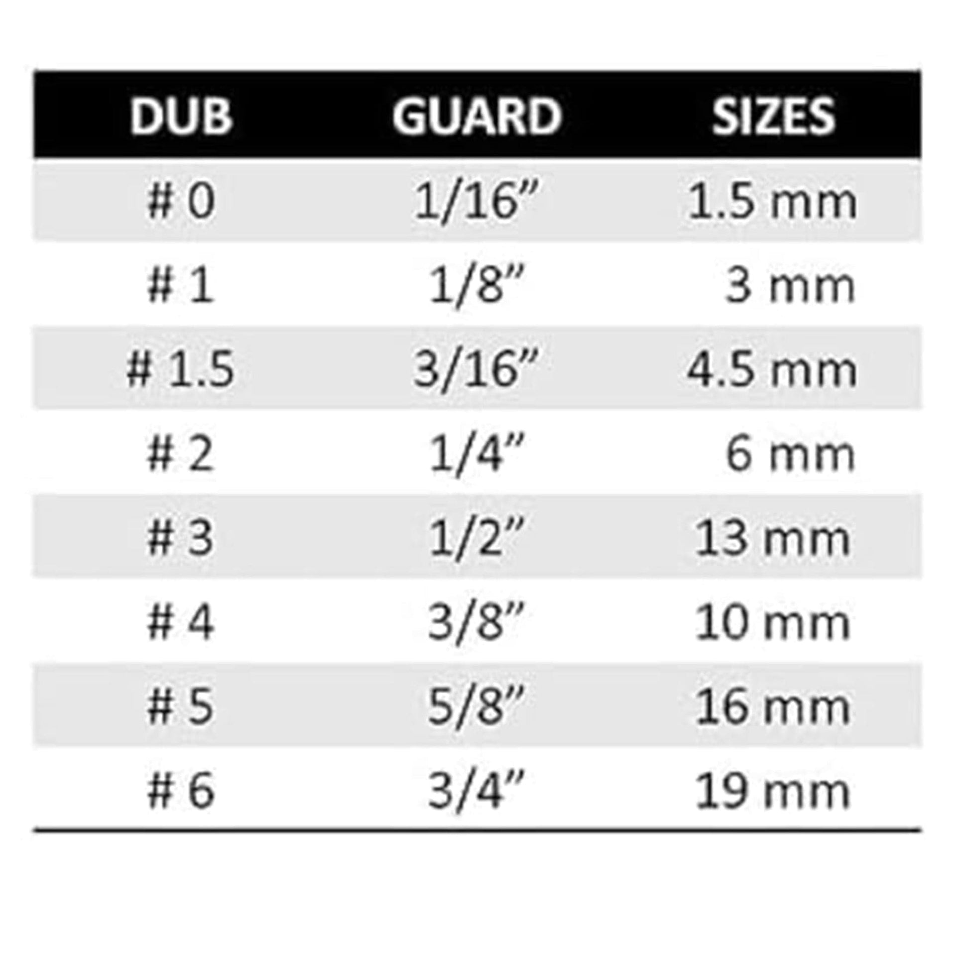 - Guard Sizes: #0 (1.5mm), #1 (3mm), #1.5 (4.5mm), #2 (6mm), #3 (10mm), #4 (13mm), #5 (16mm), #6 (19mm)