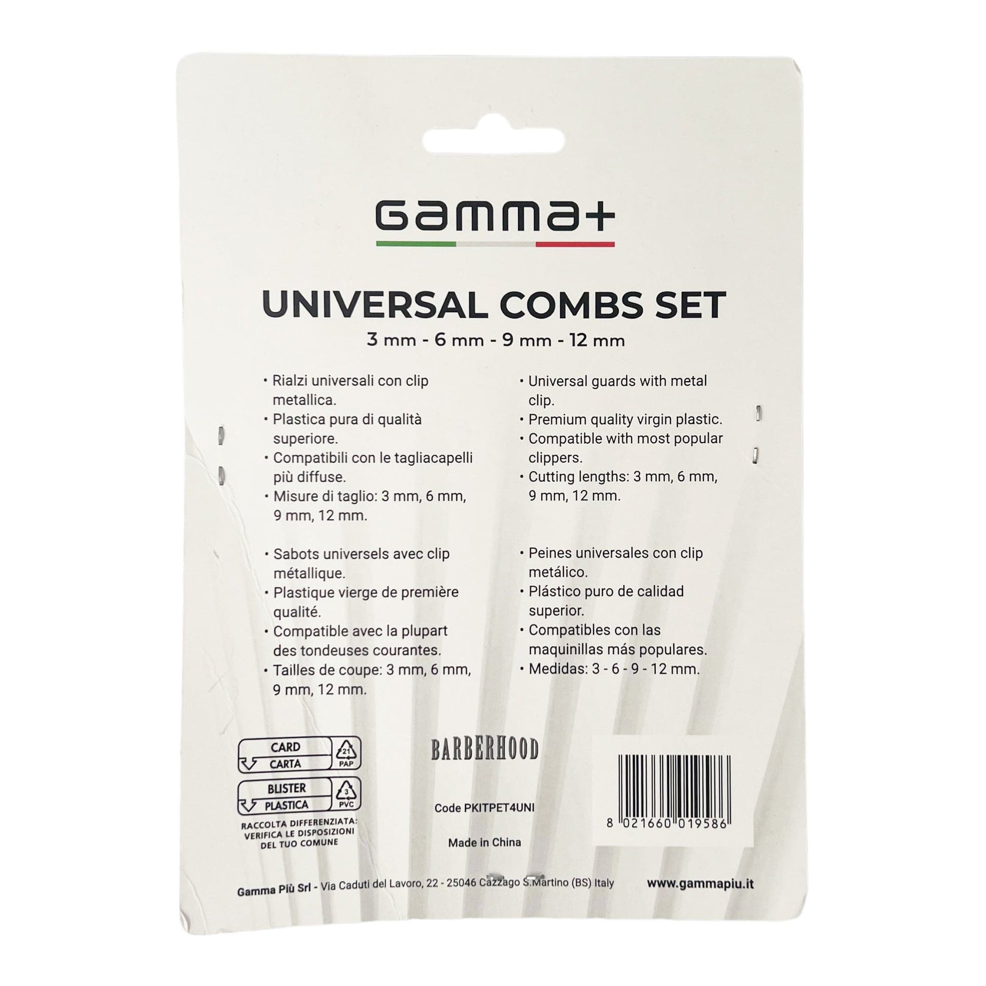 The Gamma+ Universal Combs Guards Set is an essential addition to any barber’s toolkit, designed to offer versatility and precision. This set includes four high-quality comb guards with cutting lengths of 3mm, 6mm, 9mm, and 12mm, making it perfect for achieving a variety of haircuts with ease. Manufactured from premium plastic, these guards are both durable and lightweight, ensuring long-lasting performance even during heavy use. The added metal clip ensures a secure fit onto most popular clipper models, providing stability and preventing any unwanted movement during trimming. Whether you're blending fades or trimming bulk, the Gamma+ Universal Combs Guards Set offers unparalleled control and a smooth cutting experience. Trusted by professionals, these guards are ideal for barbers who require consistent results with every cut. With universal compatibility, you can confidently use them with your existing clippers from top brands.