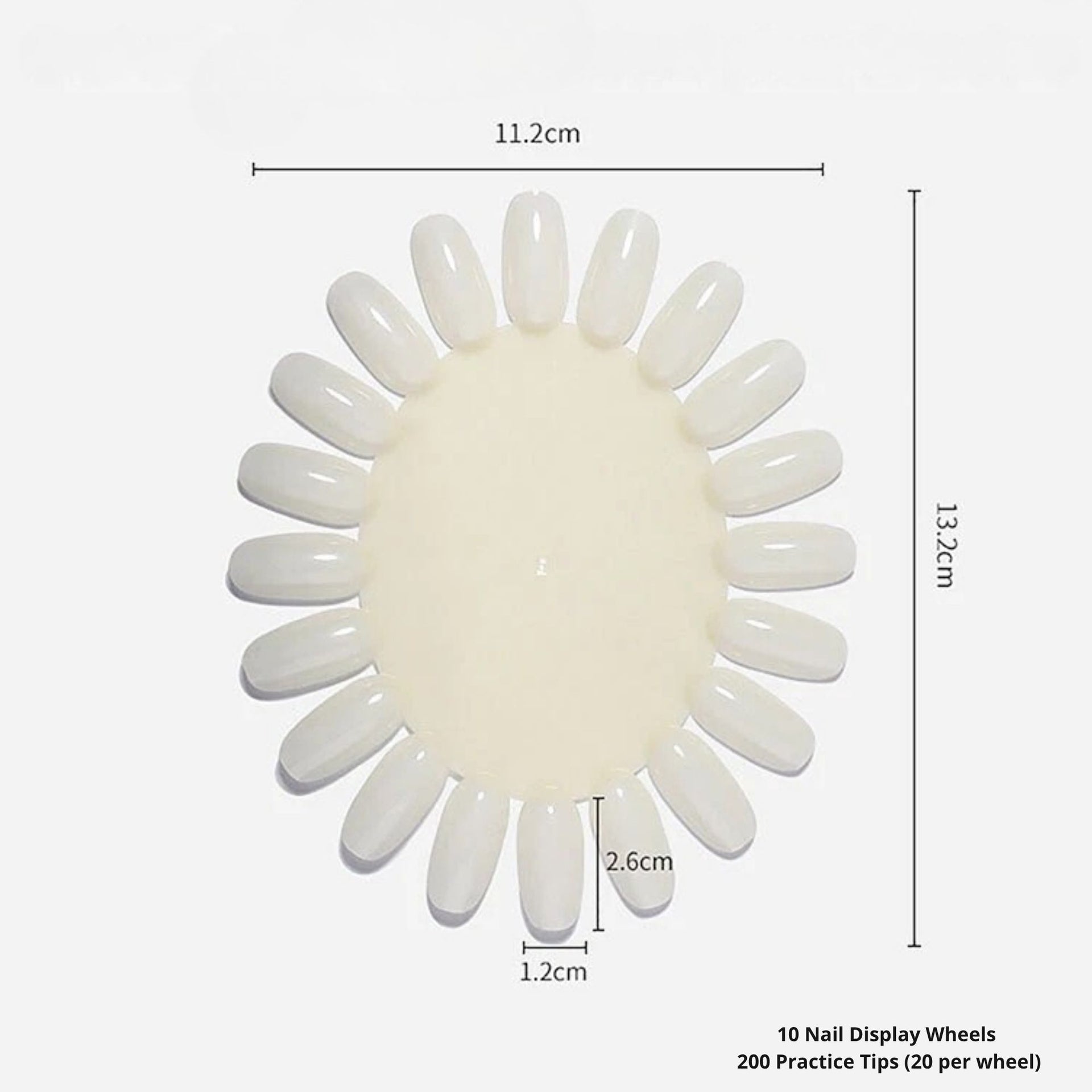 - Comprehensive set includes 10 display wheels with 20 practice tips per wheel, providing 200 nail surfaces for colour and design showcasing.