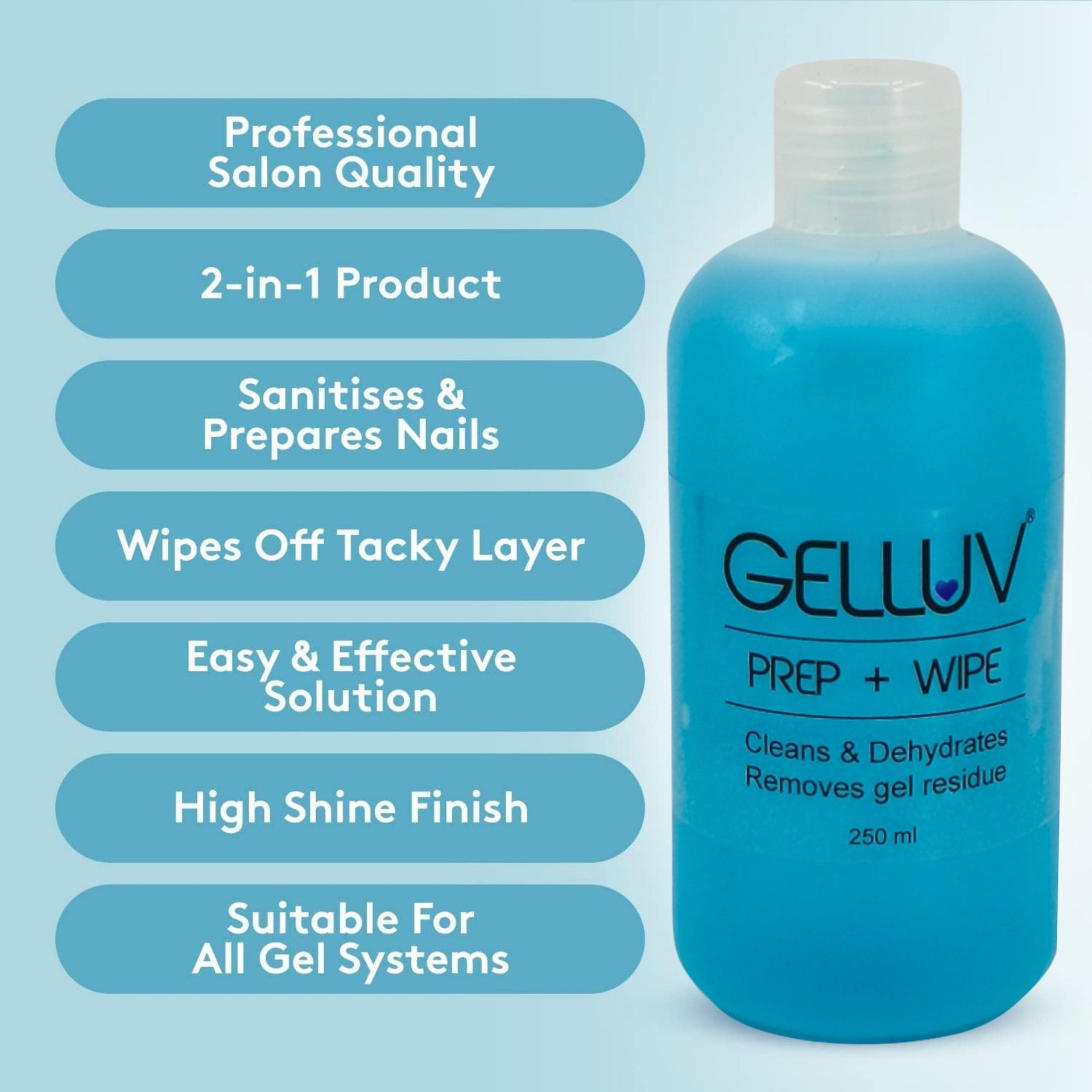 Essential for achieving salon-perfect gel manicures, this professional-grade solution serves dual purposes in the nail enhancement process, ensuring optimal adhesion and flawless finishing. The Gelluv Nail Prep & Wipe effectively dehydrates the natural nail plate before gel application, removing microscopic traces of oil and moisture that can cause lifting and premature chipping—a crucial step for clients prone to adhesion issues. Available in both convenient 250ml size for home users and professional 500ml bottle for busy salons, this versatile formula creates the perfect foundation for long-lasting gel enhancements by optimising the nail surface for maximum bonding. The crystal-clear, quick-evaporating solution leaves no residue behind, allowing for immediate application of base coats without waiting or additional buffing. Beyond preparation, this multi-functional product excels at removing the sticky inhibition layer left after curing gel polish, transforming tacky surfaces into glossy, perfectly finished manicures with a simple swipe.