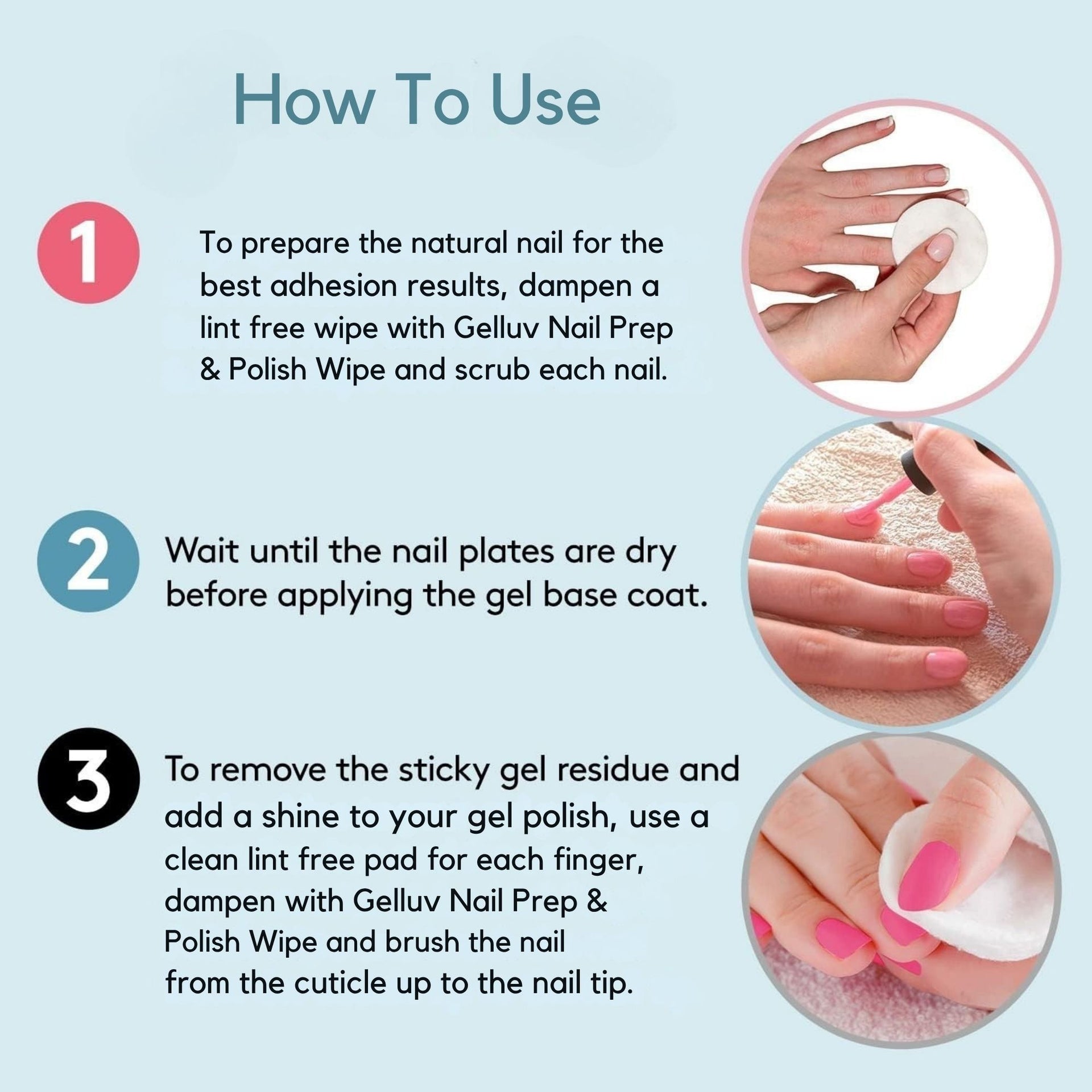 For nail preparation: Apply to a lint-free wipe and thoroughly cleanse each nail plate to remove oils and moisture before applying base coat. For finishing: After curing your final gel layer, dampen a fresh lint-free pad with the solution and wipe each nail from cuticle to free edge to remove the sticky inhibition layer and reveal a glossy finish.