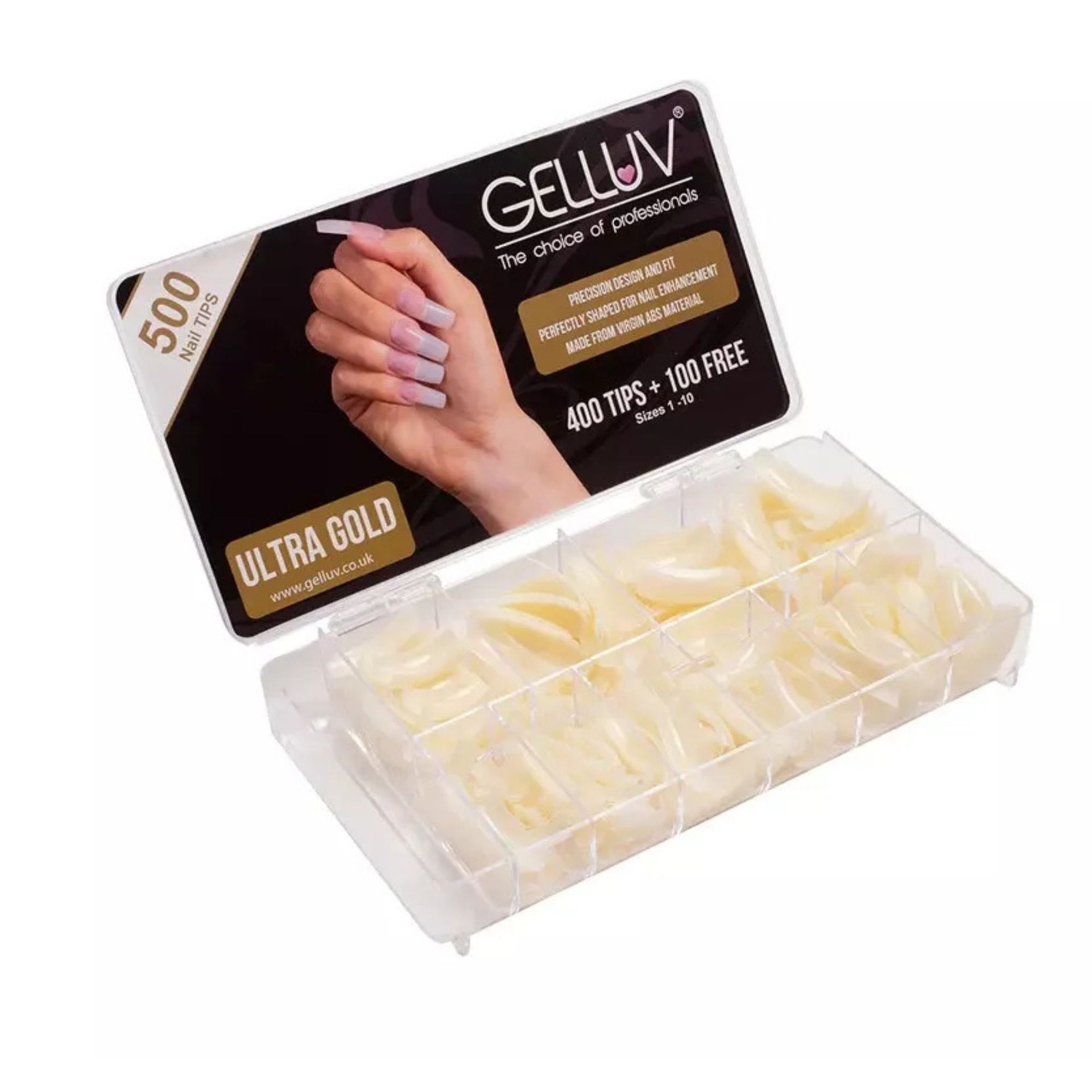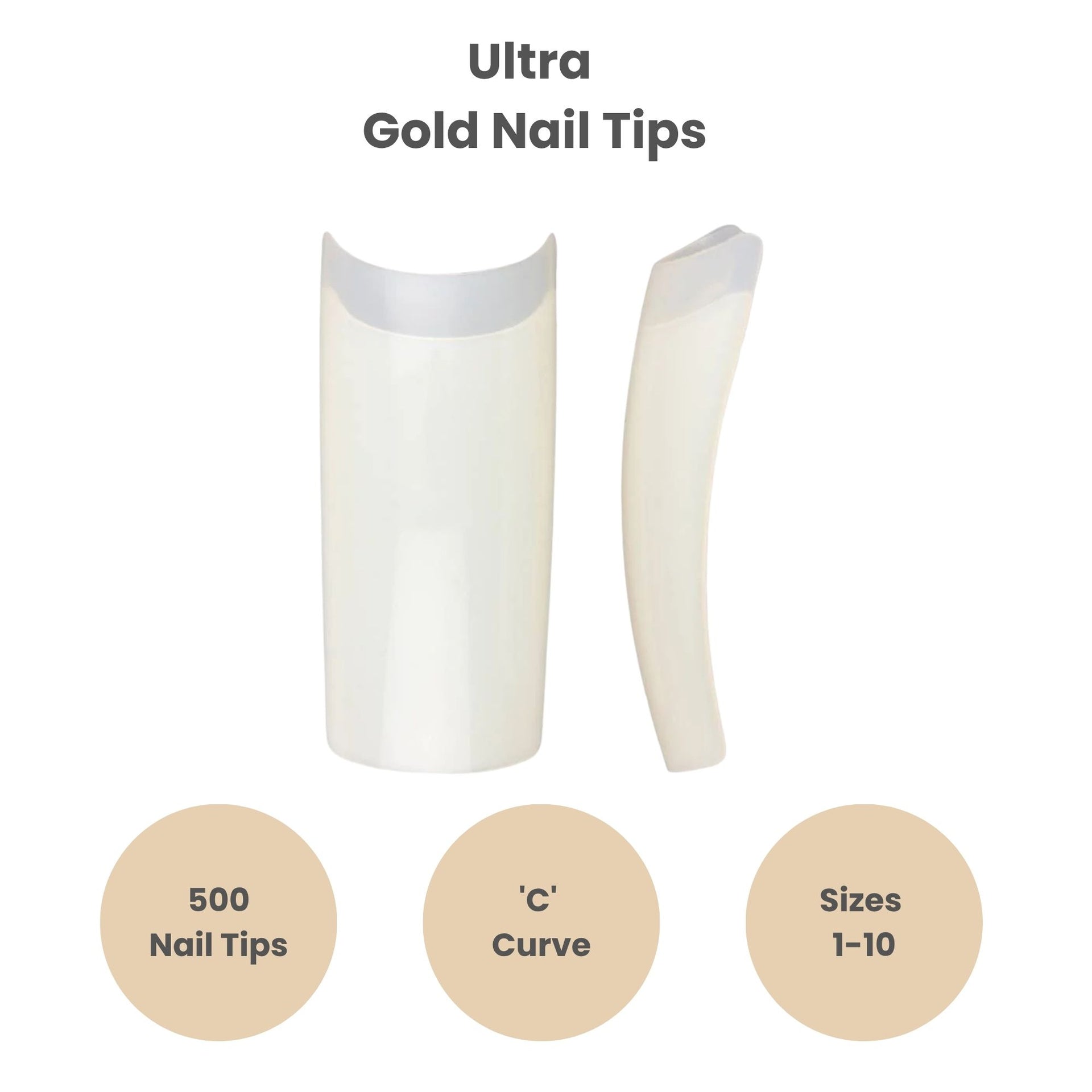 The Gelluv - Ultra Gold Nail Tips 1-10 Sizes 500pcs feature a glamorous "Big 'C' Curve," which provides a long and elegant shape perfect for creating sophisticated nail extensions. This professional bumper pack contains 500 tips conveniently sorted into 10 different sizes, ensuring you always have the perfect fit for every client's nail bed. They provide the ideal foundation for all nail enhancement systems, including gel, acrylic, and dipping powders. They are the ultimate professional choice for creating beautiful, elegant nail extensions.