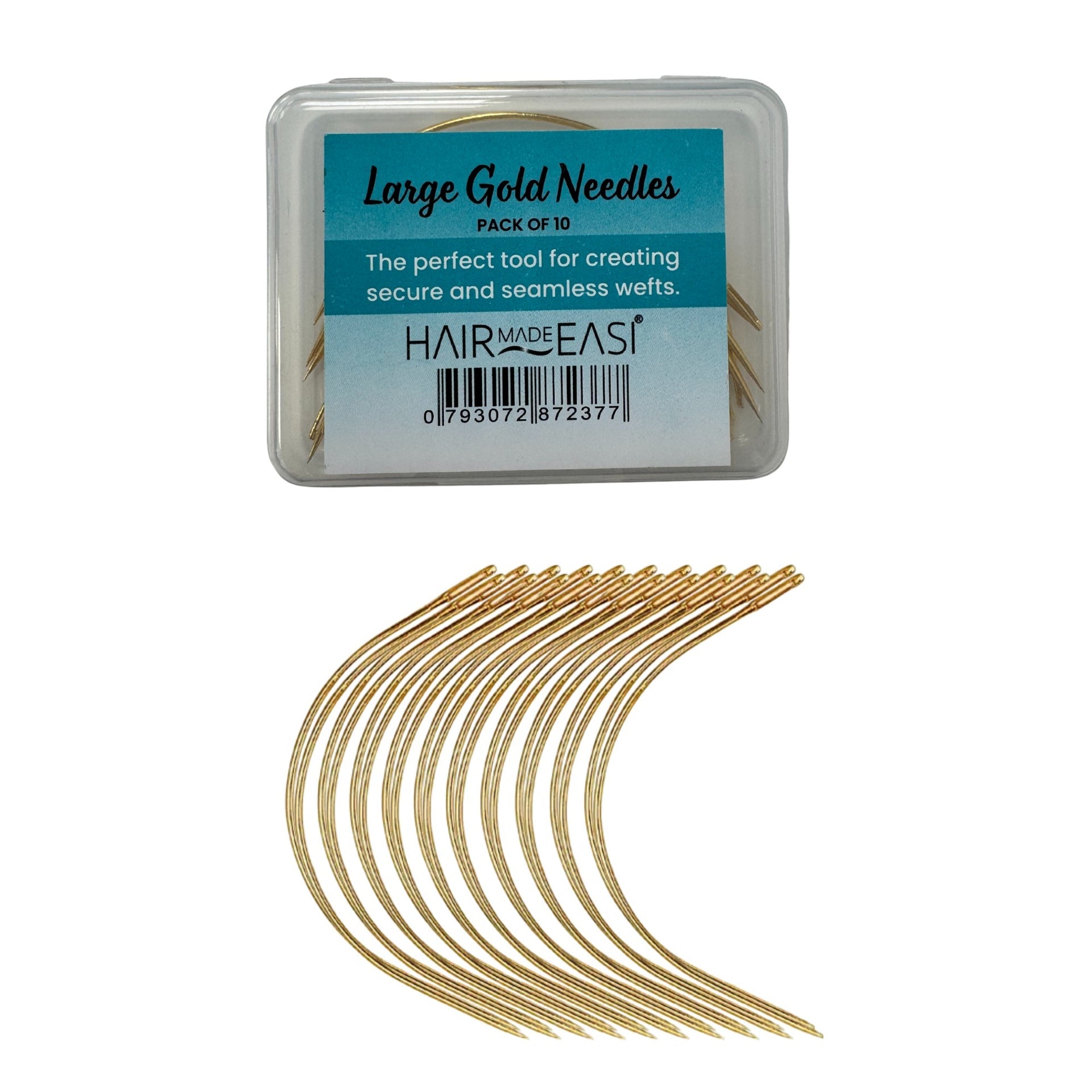 The Hair Made Easi Curved Weaving Needles Gold 6cm 10 Pack delivers essential precision and reliability for professional hair extension application. These specially curved gold needles feature an optimal 6cm length and expertly designed curve that perfectly follows the natural contour of the head, allowing for smooth, efficient thread movement when creating sew-in wefts and weaves. The premium gold-toned finish not only provides an elegant professional appearance but also offers excellent visibility against dark hair and thread, significantly reducing eye strain during detailed application work. Unlike standard sewing needles that can cause frustration and uneven results, these purpose-designed weaving needles glide effortlessly through hair, enabling you to create secure, long-lasting extensions with professional finesse.