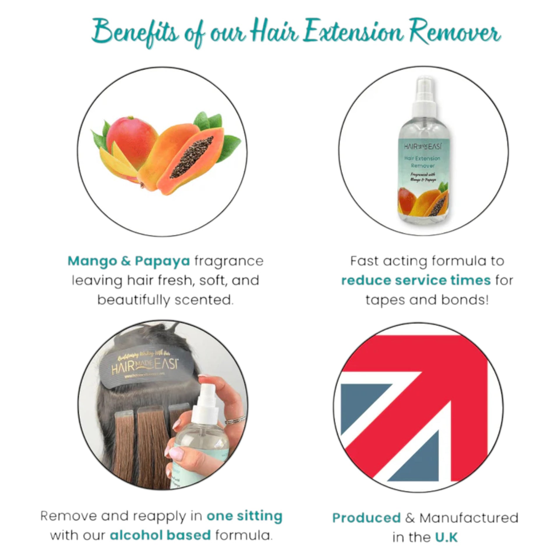 The Hair Made Easi Hair Extension Remover Spray Mango & Papaya 250ml delivers unparalleled efficiency for professional extension removal services. This fast-acting, alcohol-based formula rapidly breaks down adhesives in both tape-in and keratin bond extensions, significantly reducing service times whilst ensuring the integrity of natural hair remains protected throughout the removal process. The generous 250ml spray bottle provides precise application control, allowing you to target specific areas or treat larger sections with equal effectiveness, making it versatile for all extension removal scenarios. Unlike oil-based removers that leave greasy residue requiring multiple shampoos, this professional-grade solution evaporates quickly after dissolving the adhesive, allowing for immediate reapplication in the same appointment without additional washing steps.