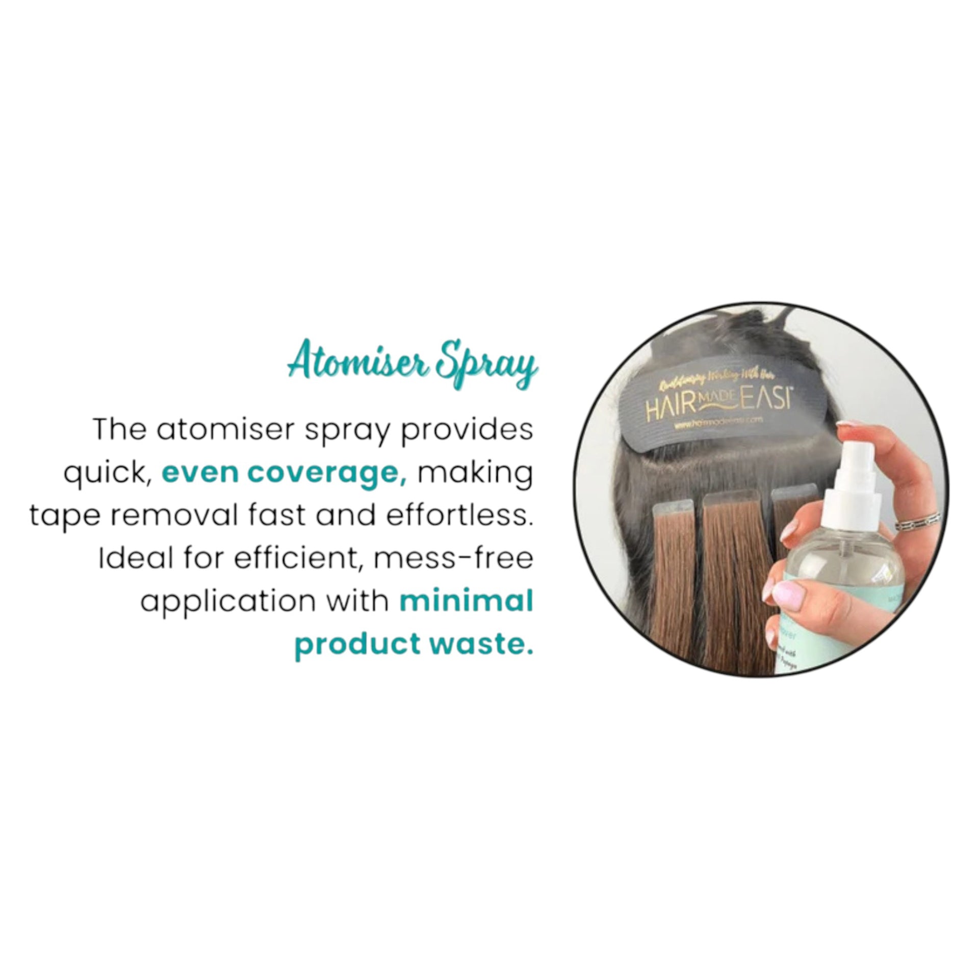 For tape extensions, spray directly onto the bond area and allow 30-60 seconds for the adhesive to begin dissolving before gently separating the tape. For keratin bonds, apply generously to the bond area, wait 1-2 minutes, then use bond crushing pliers to break the softened bond before sliding it off the hair.