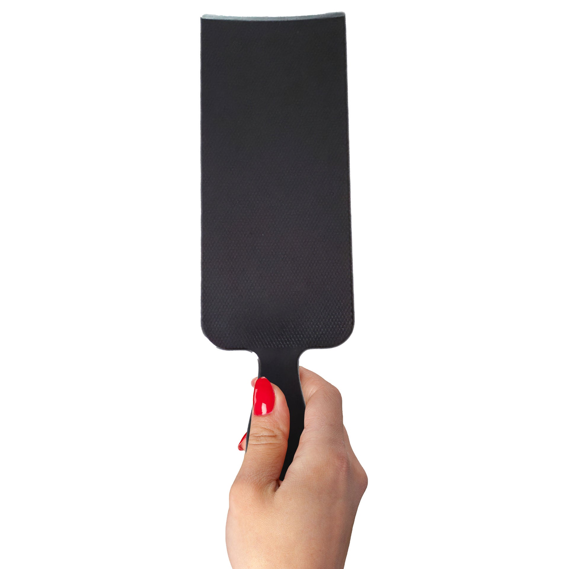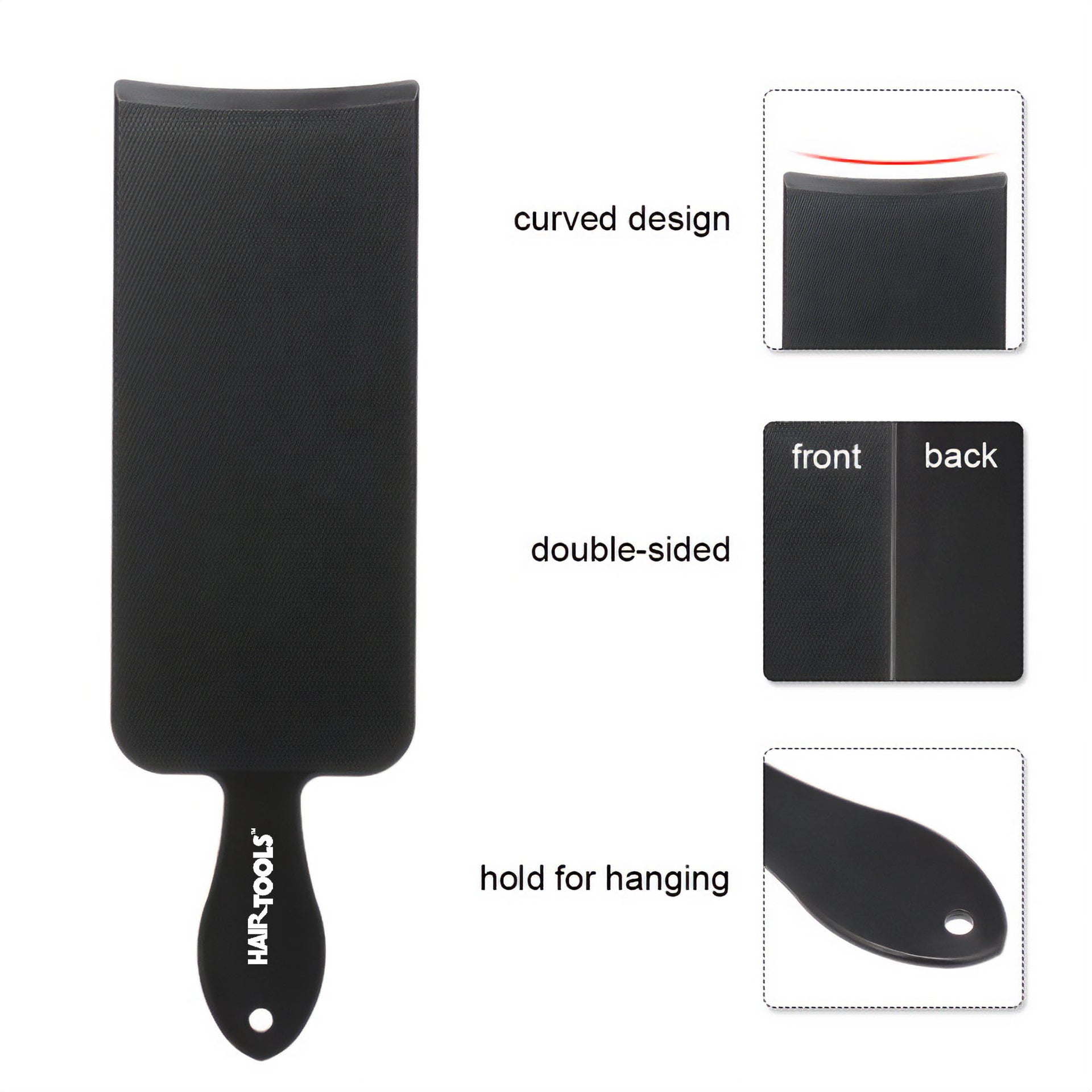 Utilise the textured side for soft transitions and the smooth side for bold highlights, aligning the board comfortably against the client's head.