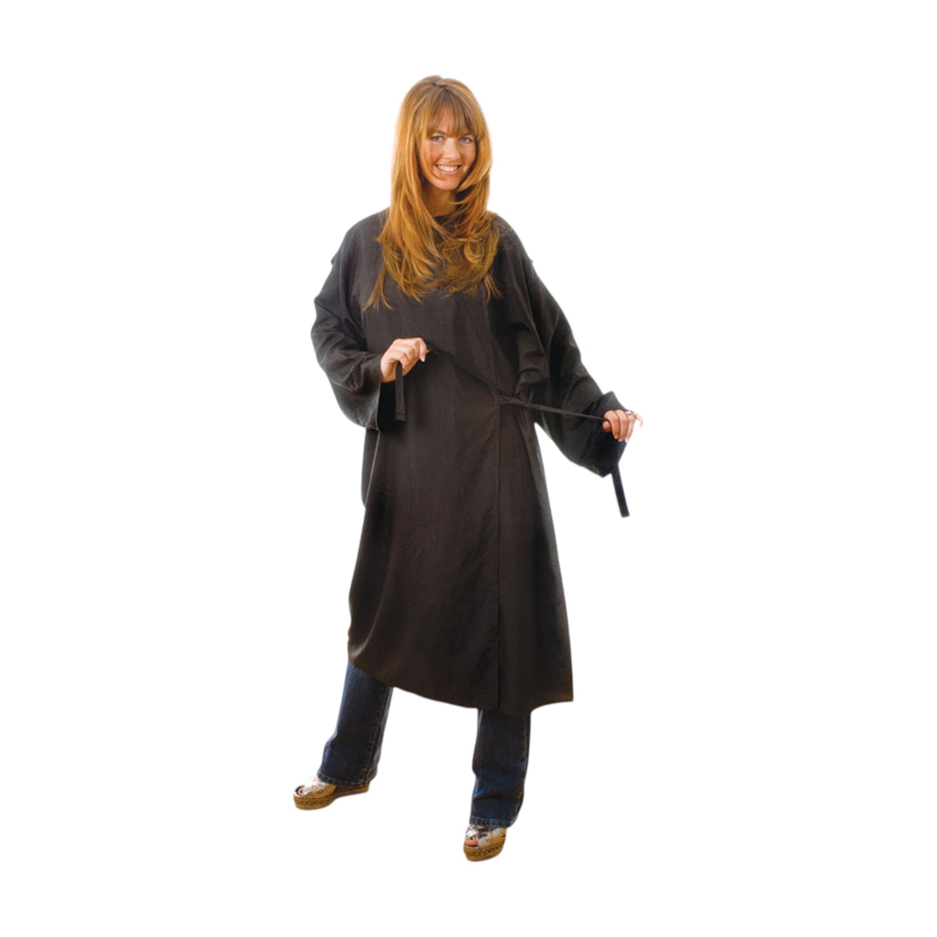 Ensure the gown is securely fastened before beginning any chemical treatments to prevent skin contact with products. Not suitable for use with naked flames or heated tools placed directly on the fabric. Please review all fastening mechanisms before each use.