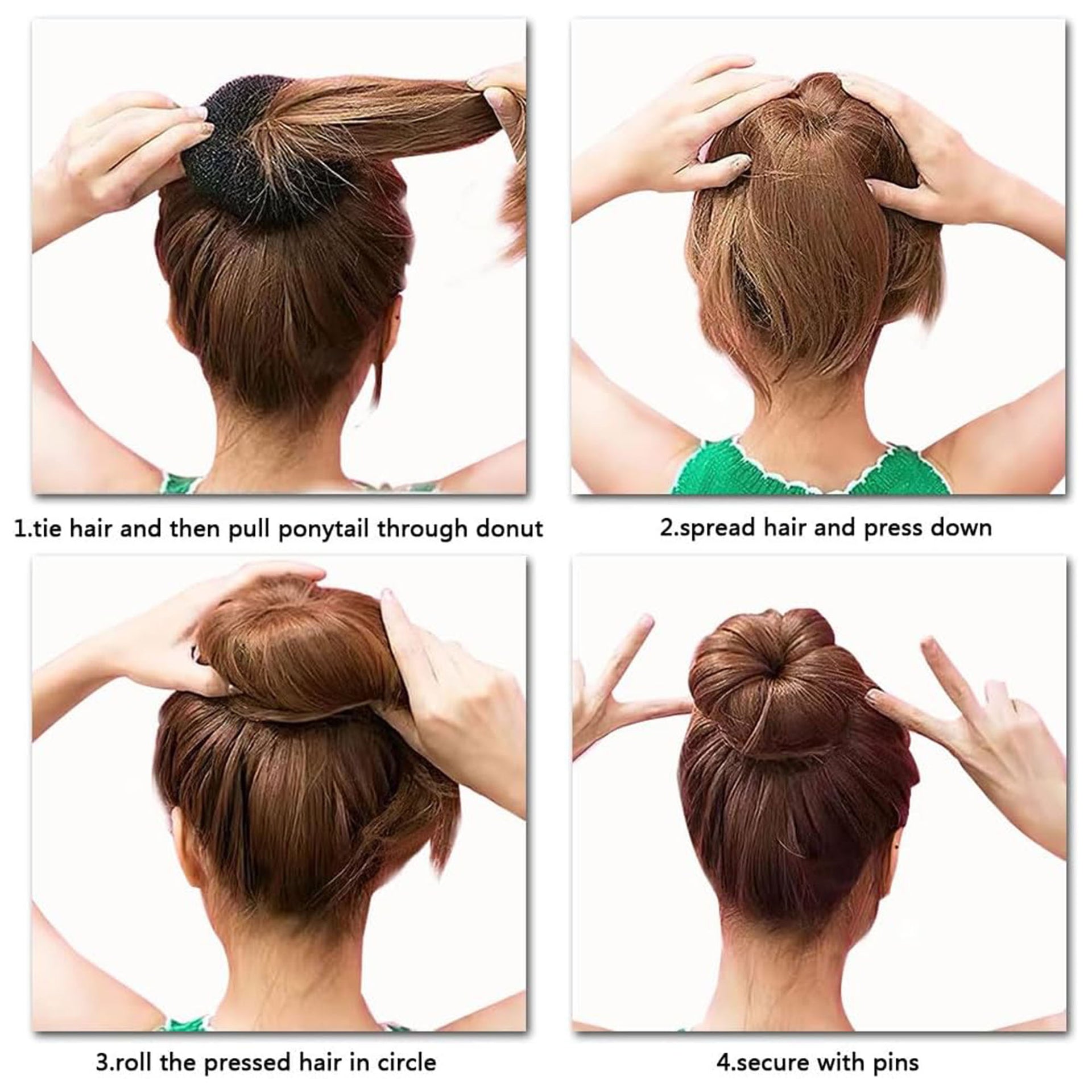 Ensure the bun ring is securely positioned in the hair to avoid slippage. Review care instructions before use.