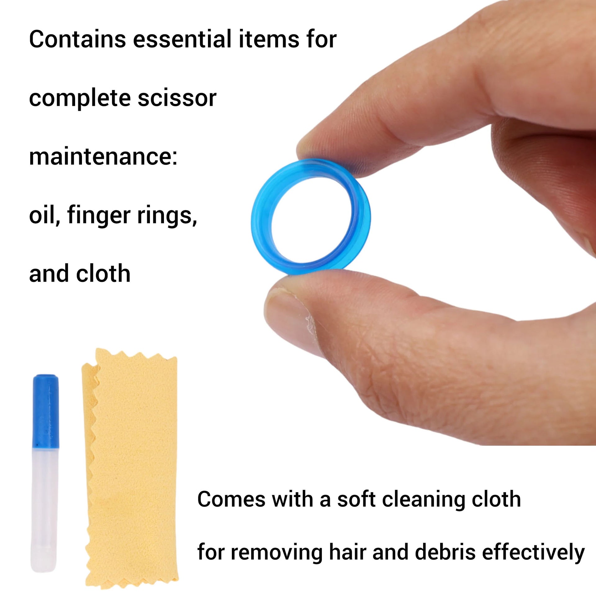 - Contains essential items for complete scissor maintenance: oil, finger rings, and cloth.