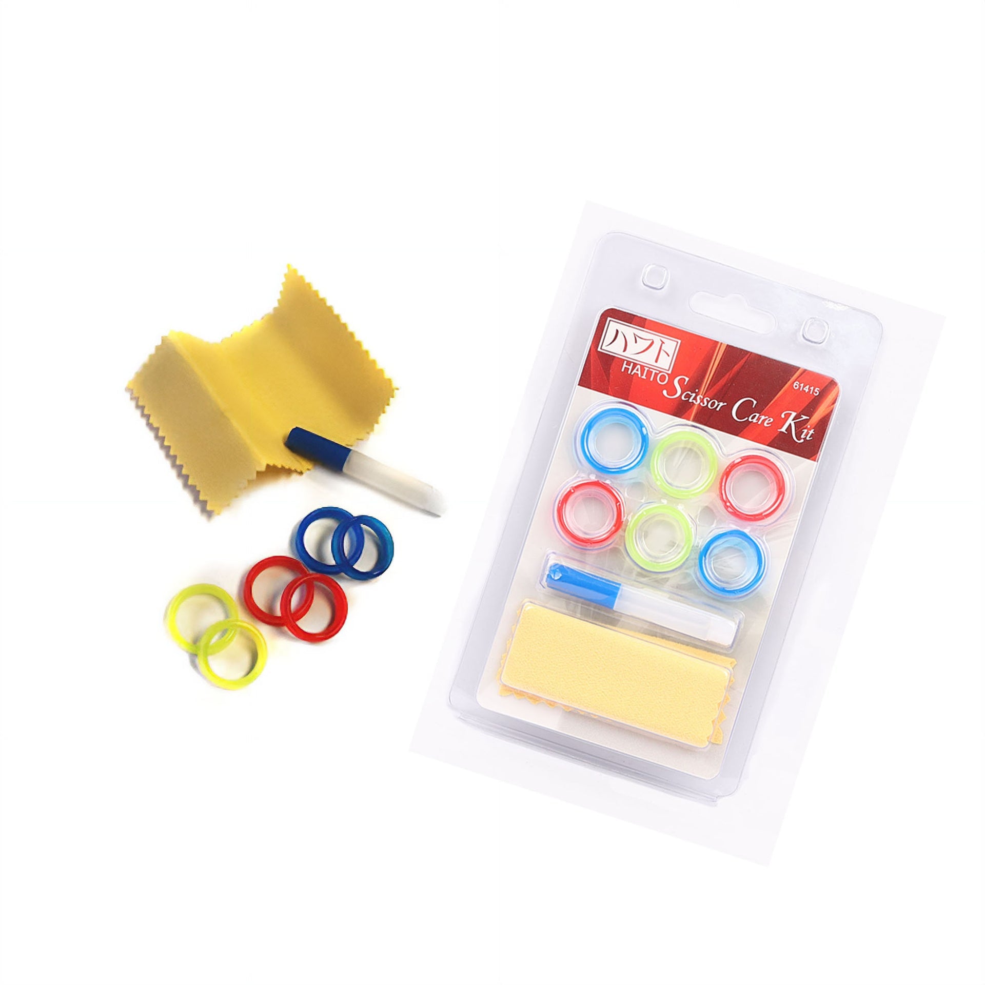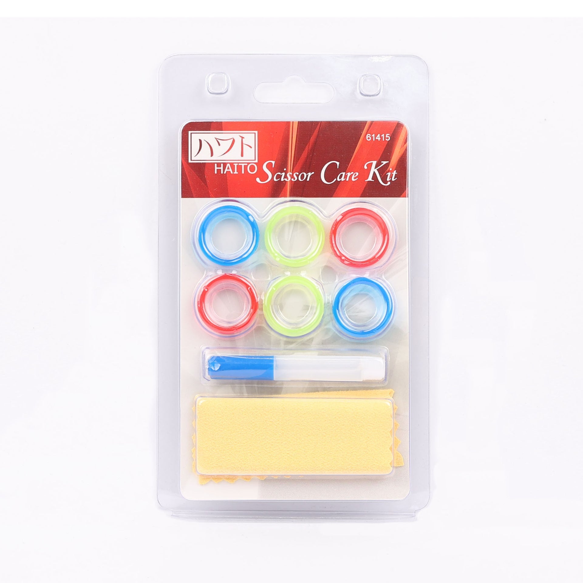 Ensure your professional scissors remain in peak condition with the comprehensive Haito - Scissor Care Kit. This essential kit provides everything required to maintain the precision, smoothness, and longevity of your valuable cutting tools. It includes three pairs of comfortable silicone finger rings, specially formulated scissor lubricant oil, and a soft, effective cleaning cloth. Proper maintenance is crucial for performance, and this kit simplifies the process, helping you protect your investment and deliver flawless cuts every time.