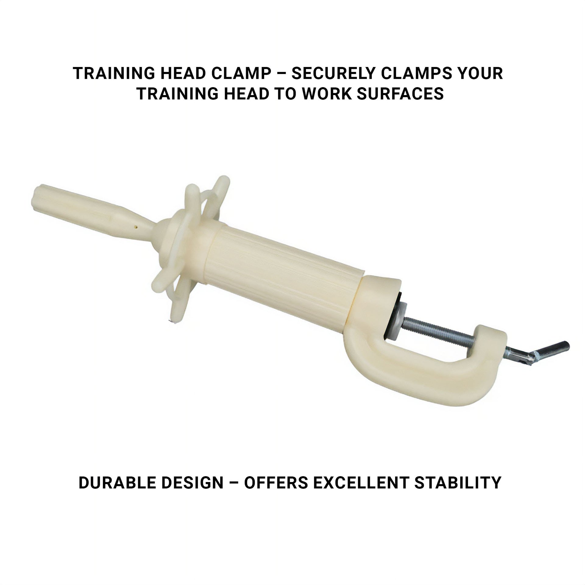 - Securely attaches training heads to workstations or tables.