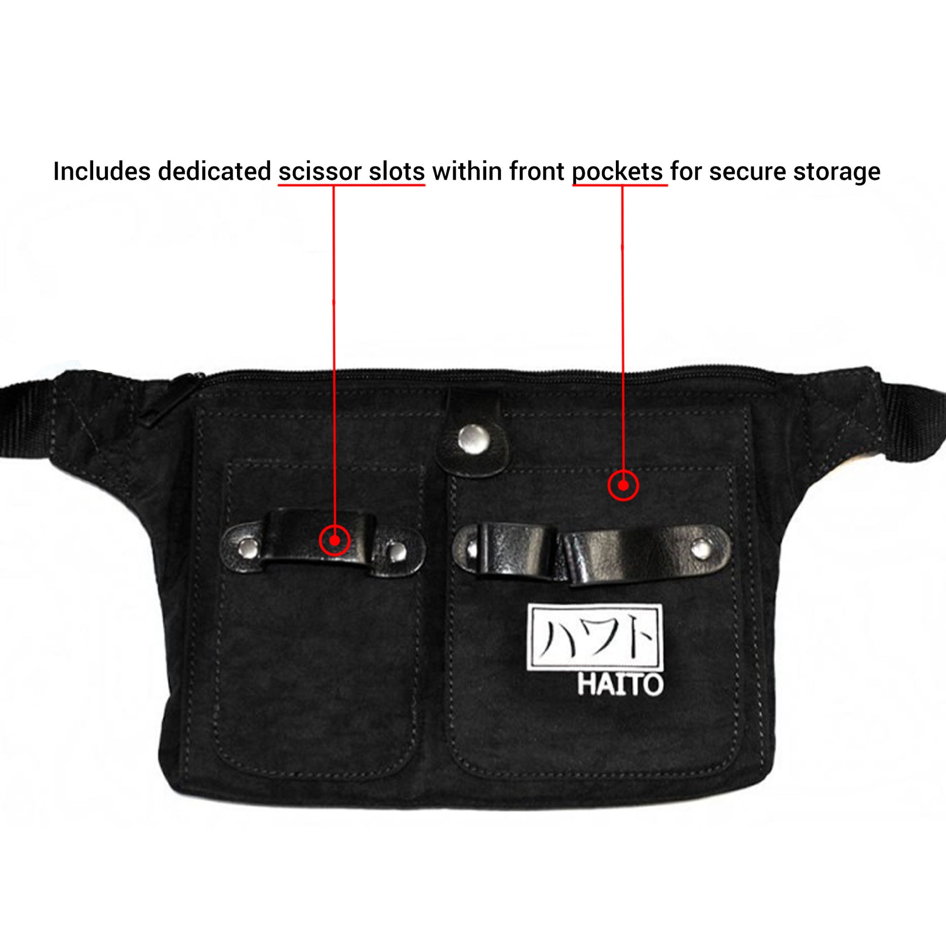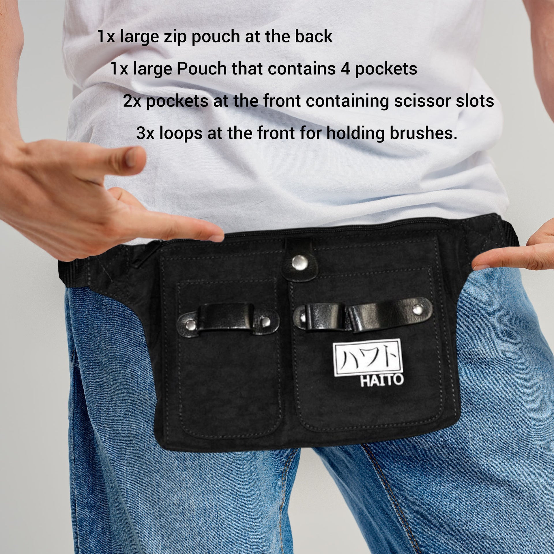 Constructed for durability and convenience, the Haito - Tool Belt boasts multiple storage options, including dedicated scissor slots, brush loops, and versatile pouches. A large zipped pouch at the back provides secure storage for valuables or less frequently used items, while front pockets keep your primary tools readily accessible. Say goodbye to cluttered workstations and hello to efficient, organised styling with this indispensable accessory. It's the ideal solution for professionals who value efficiency and organisation in their daily work.