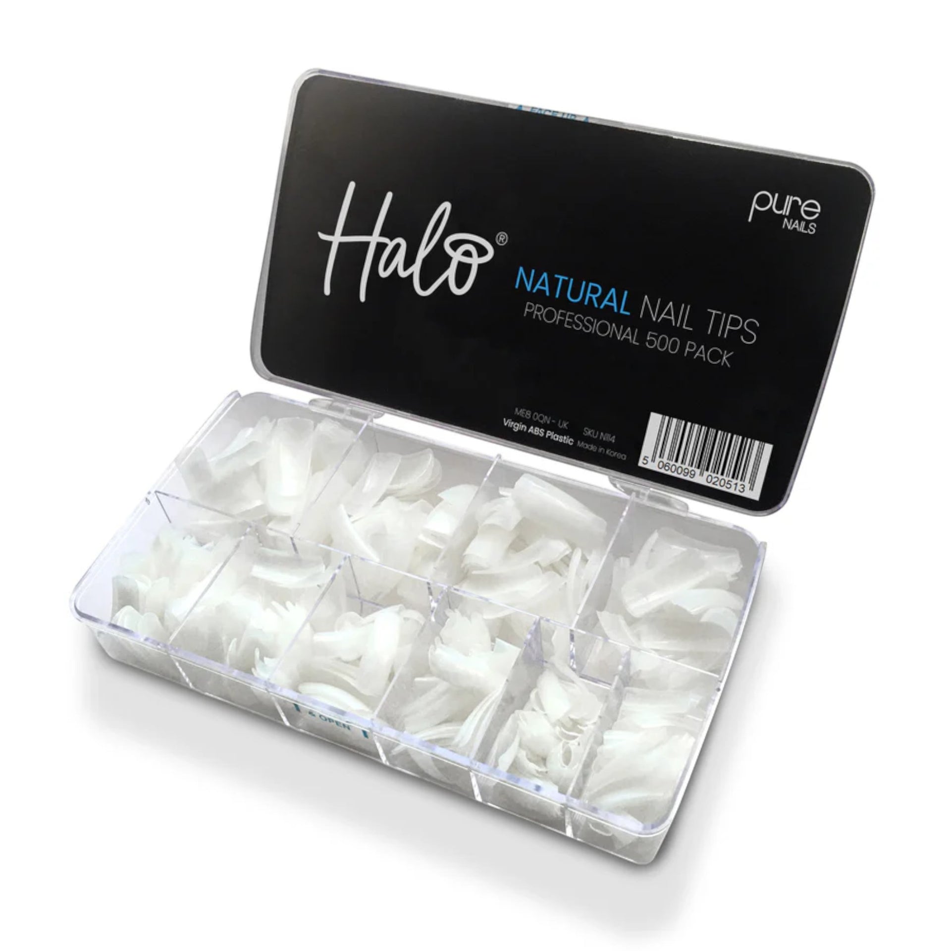 Discover premium nail artistry with Halo Natural Tips, crafted from virgin ABS plastic for superior durability and natural aesthetics. These professionally designed tips feature a classic full-well shape that adapts seamlessly to most nail beds, whilst maintaining optimal flexibility for comfortable wear. The Pure Natural Collection offers reinforced sidewalls that ensure lasting strength without compromising on the natural appearance that clients desire.