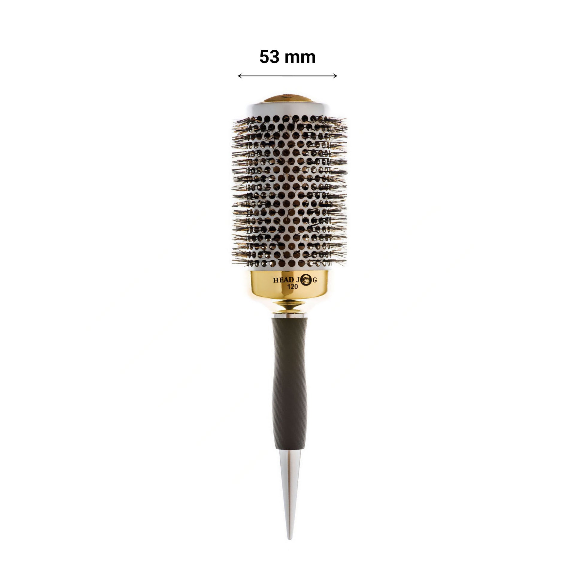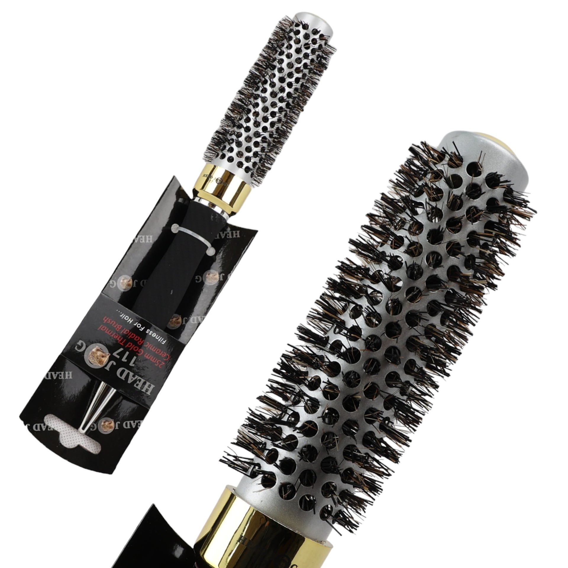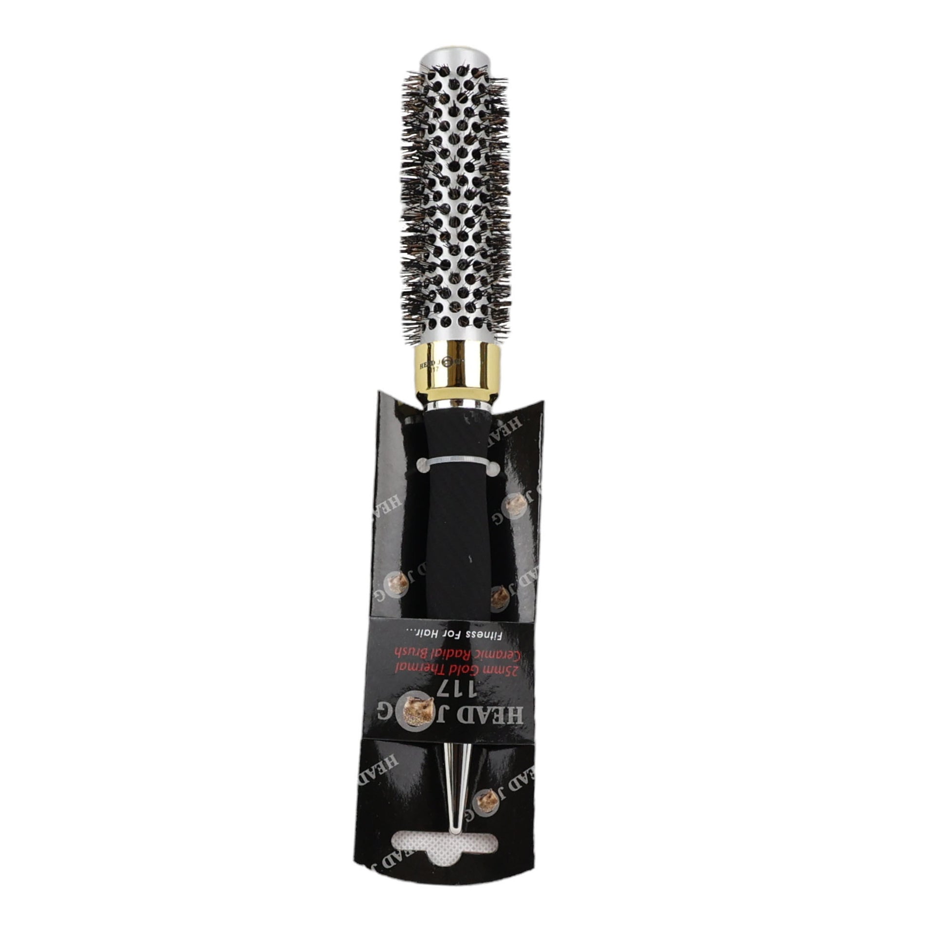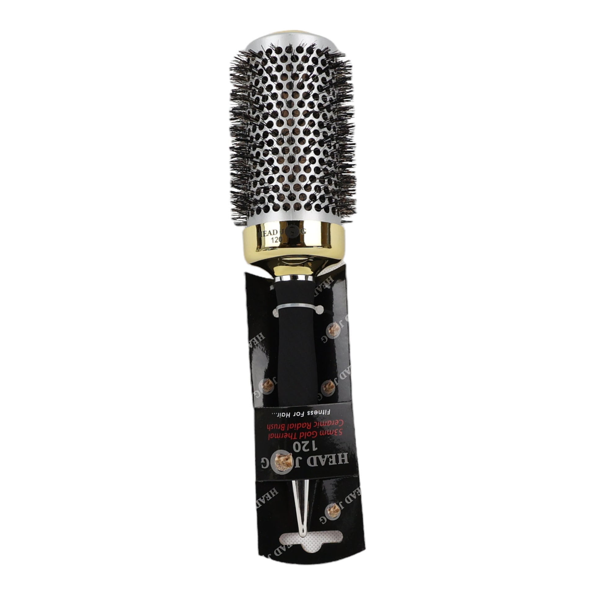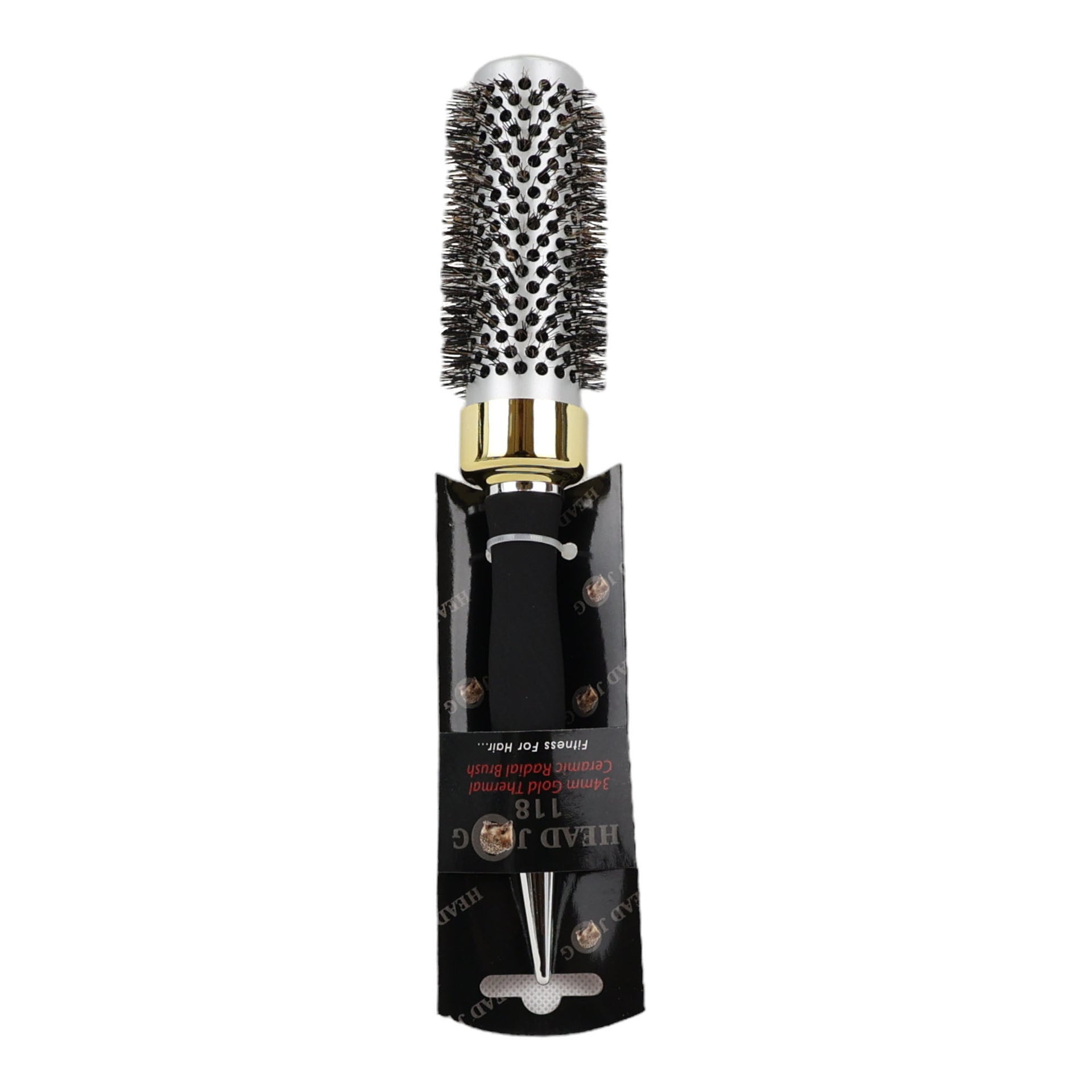 The Head Jog Gold Thermal Ceramic Radial Round Brush is an exceptional styling tool that masterfully combines luxurious design with professional-grade performance. This brush features a silver ceramic-coated barrel that evenly distributes heat, significantly reducing static and frizz to ensure a smooth, polished finish. The unique blend of boar and nylon bristles works in perfect harmony to enhance your hair's natural shine, leaving it looking healthier and more vibrant with every stroke. Crafted for both comfort and precision, the brush's ergonomic, lightweight handle provides an easy grip, allowing for effortless styling control, even during extended sessions. Whether you’re styling at home or in a professional salon, the Head Jog Gold Thermal Ceramic Radial Round Brush is your essential tool for achieving flawless, salon-quality results.