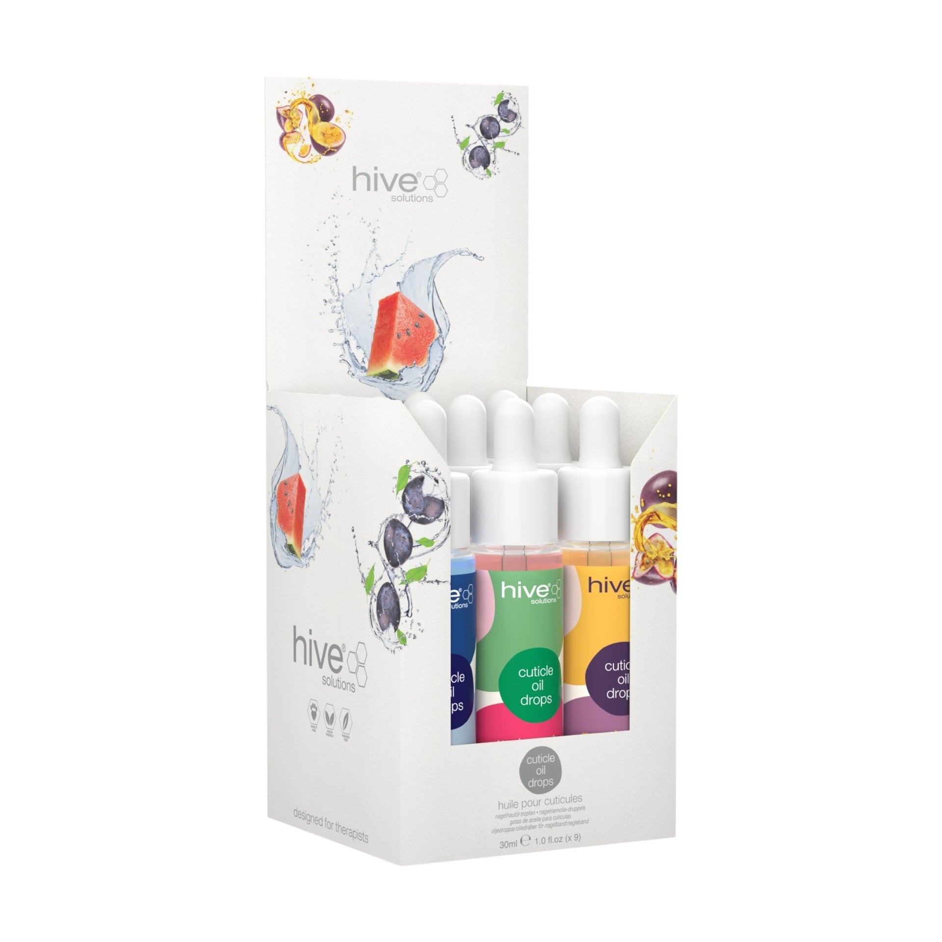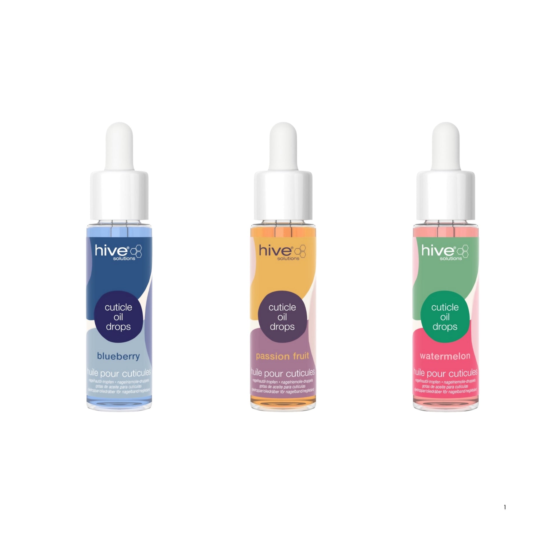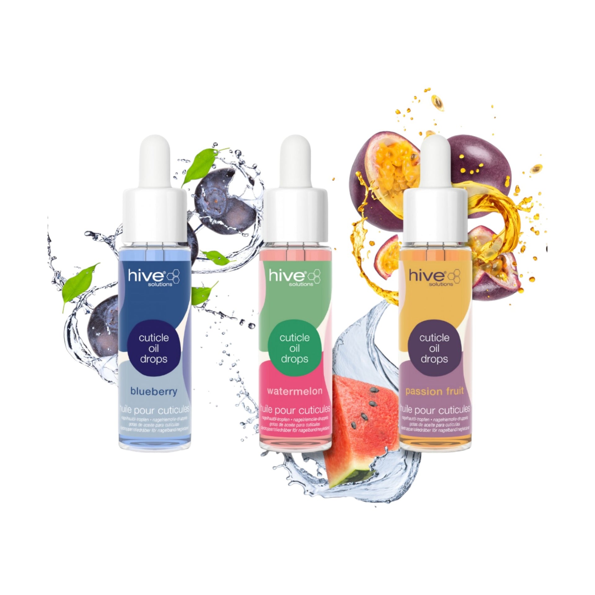 The elegant dropper bottles not only ensure precise application without waste but also make a striking addition to retail displays or professional manicure stations. Each variant comes in a colour-coordinated formula that visually represents its fruit inspiration – deep blue for Blueberry, vibrant pink for Watermelon, and sunny yellow for Passion Fruit – making it easy to identify your preferred fragrance at a glance. The premium packaging and salon-quality formulations make these cuticle oils an ideal retail offering for beauty businesses looking to expand their nail care range with products that deliver visible results and encourage repeat purchases. Whether used as a finishing touch to professional treatments or as part of a home nail care routine, these cuticle oil drops represent the perfect balance between therapeutic efficacy and sensory indulgence that clients will eagerly incorporate into their regular beauty regimen.