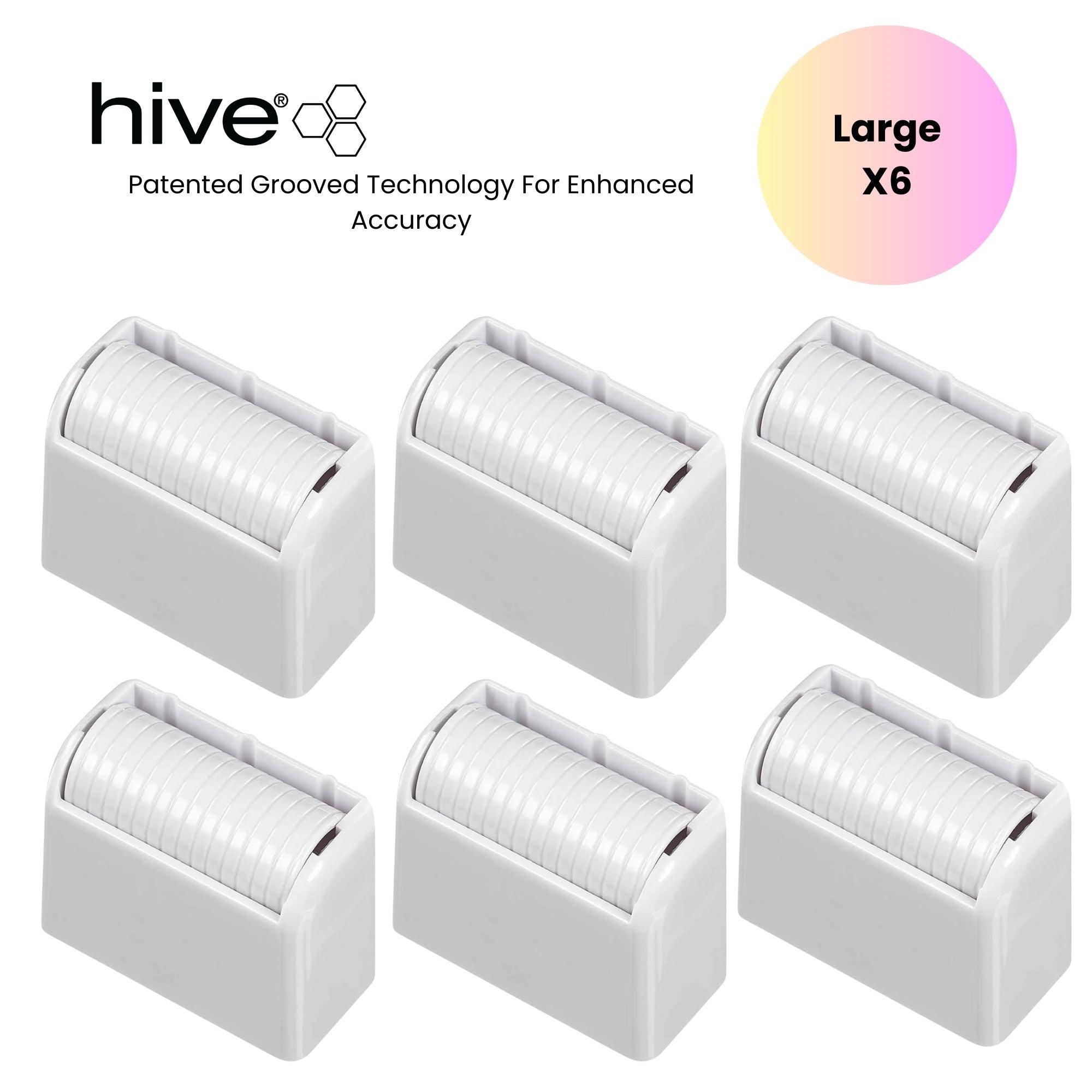 The Hive - Roller Heads Large 6pcs are the professional's choice for a quick, accurate, and supremely hygienic method of wax application. These large roller heads are perfectly sized for efficiently treating bigger areas of the body, making them ideal for leg waxing. Featuring patented grooved technology, each head is designed to provide an even and consistent distribution of wax across its full width. This innovative design ensures enhanced accuracy and control for a flawless, mess-free application every time.