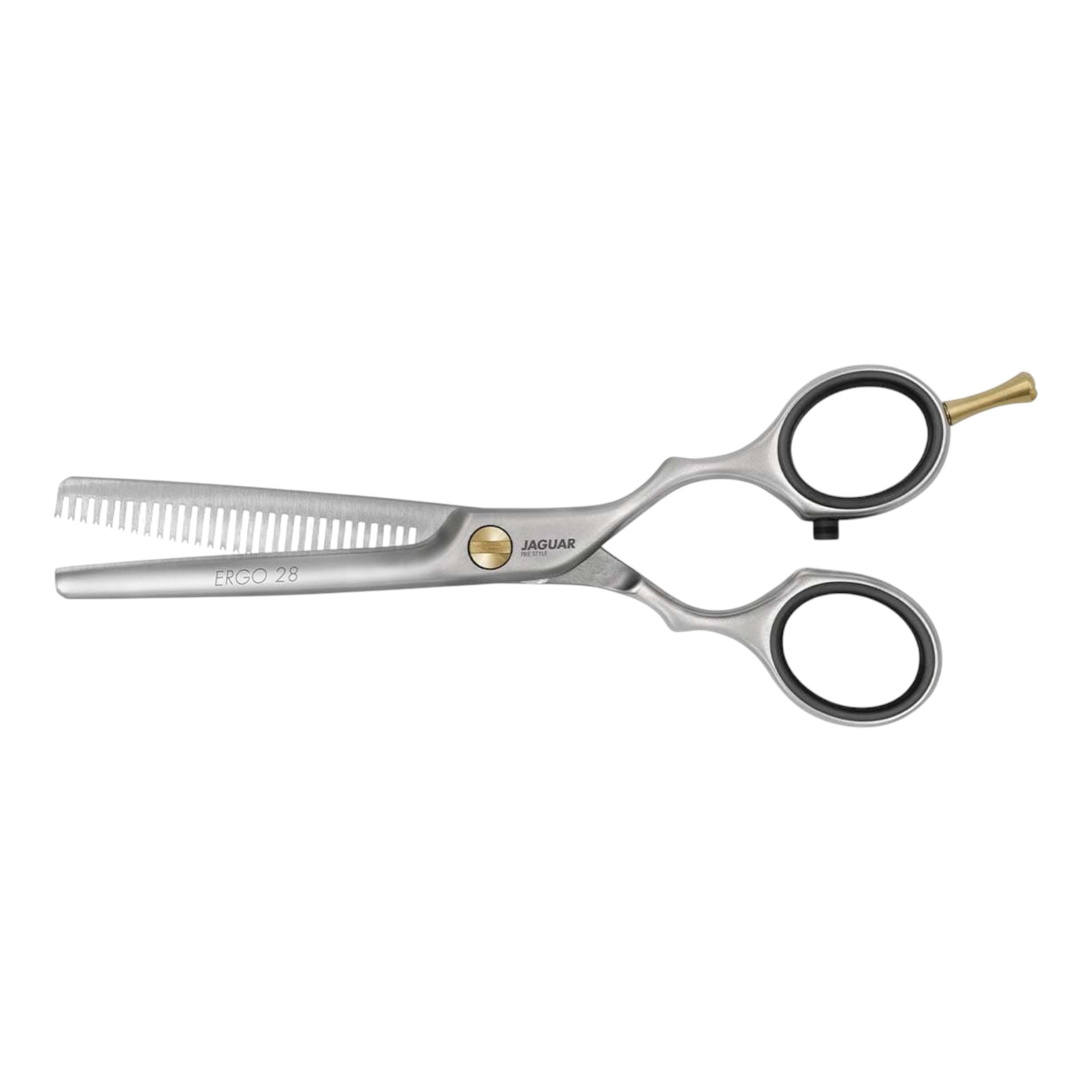 What distinguishes the Jaguar - Ergo 28 Pre Style Hairdressing Cut Blending Scissors 5.5" (14cm) from standard texturing tools is the meticulous attention to detail that characterises genuine German craftsmanship. The perfectly balanced weight of just 36 grams ensures effortless handling during detailed texturing techniques, whilst the flat cutting angle of the blades delivers exceptional sharpness that maintains consistent performance throughout extended use. The brass-tone screw and finger rest provide an elegant contrast against the matte silver finish, creating a professional aesthetic that reflects quality craftsmanship. The versatile 5.5-inch length makes these scissors ideal for a wide range of texturing techniques, including weight removal, blending, and creating seamless layer transitions. These scissors represent an excellent investment for both newly qualified stylists building their initial toolkit and experienced professionals seeking a reliable workhorse for daily salon use, offering the perfect balance of professional performance, ergonomic comfort and exceptional value that has made Jaguar a respected name in professional hairdressing tools worldwide.