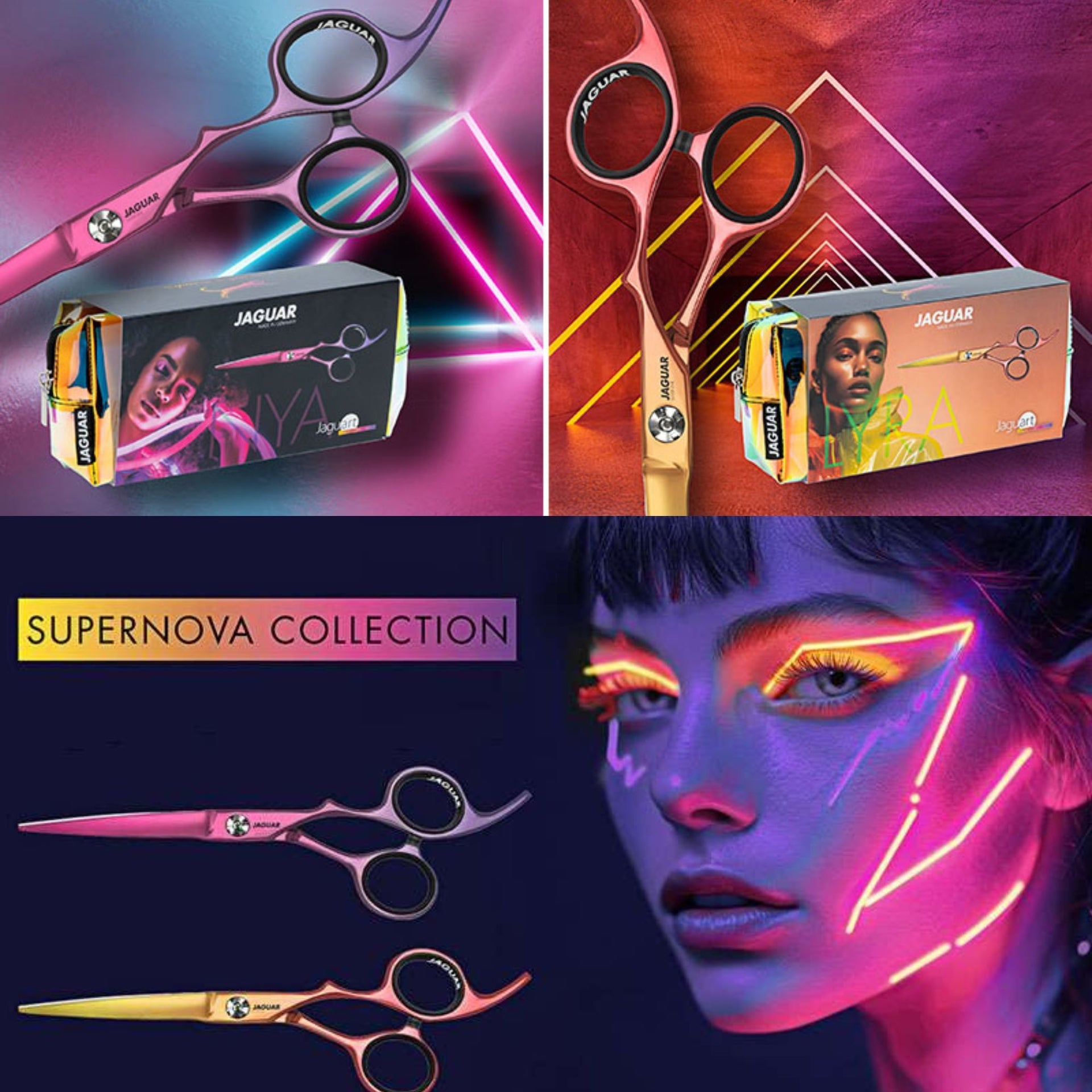 Experience a new galaxy of cutting performance with the limited edition Jaguar - Supernova Collection Hairdressing Scissors 5.5 inch (14cm). These professional scissors represent the perfect fusion of traditional German craftsmanship and high-fashion aesthetics. They are crafted from high-quality forged special steel and ice-hardened to guarantee long-lasting sharpness and durability. Featuring double-sided polished cutting edges with additional honing and a fine concave grind, these scissors are perfectly suited for smooth and precise slicing techniques, gliding effortlessly through the hair.