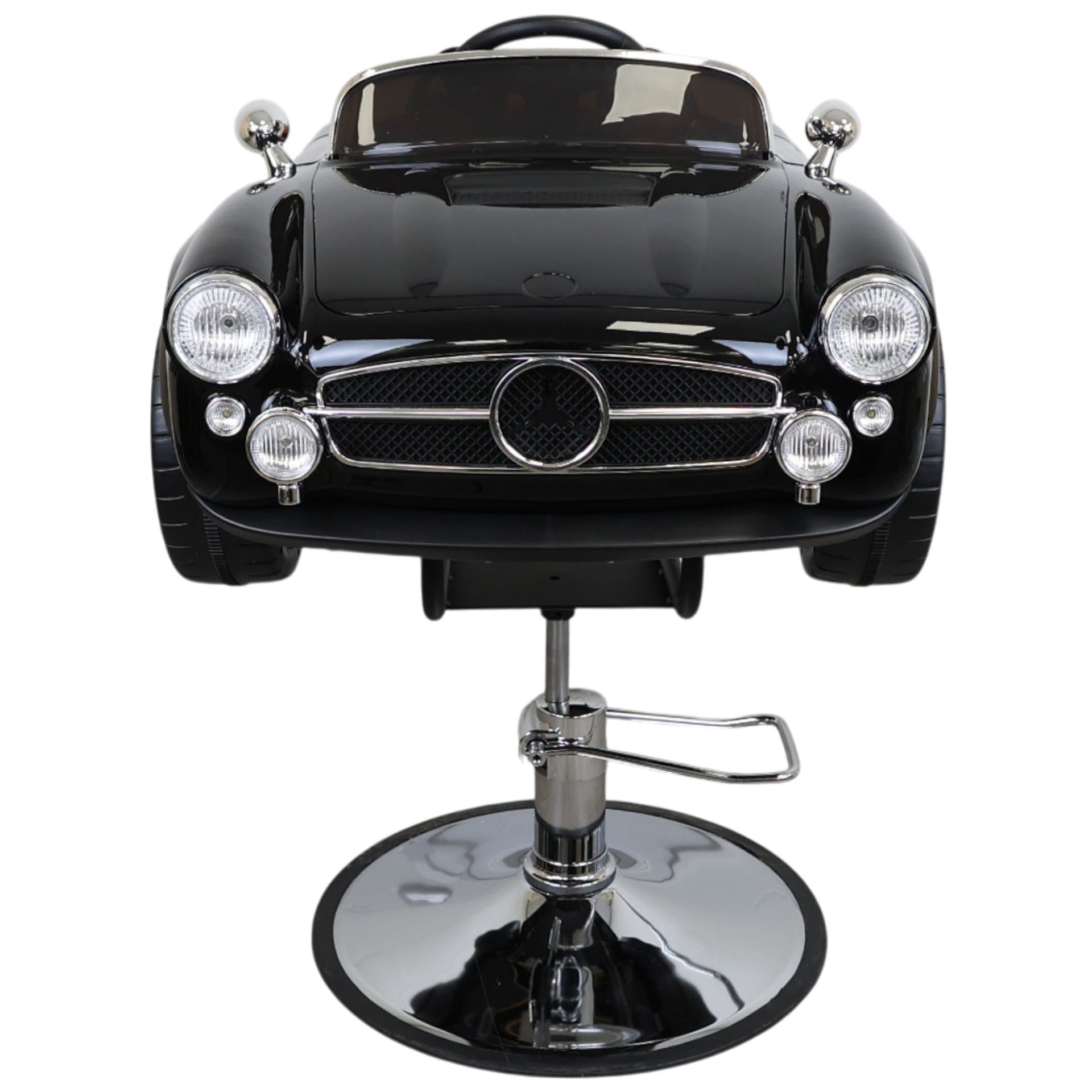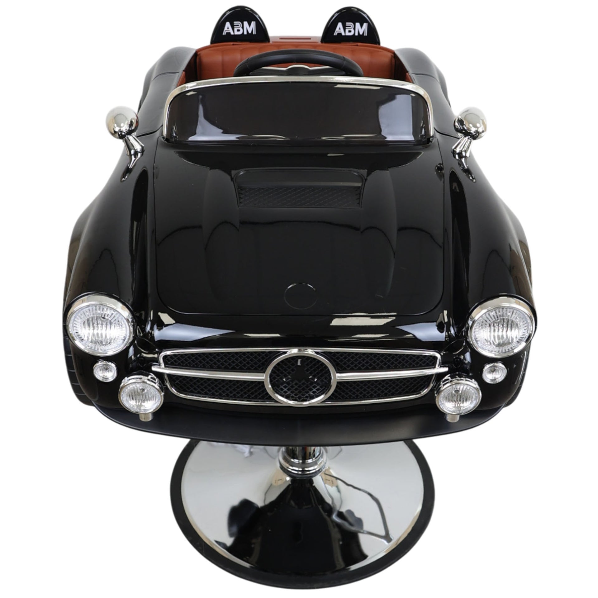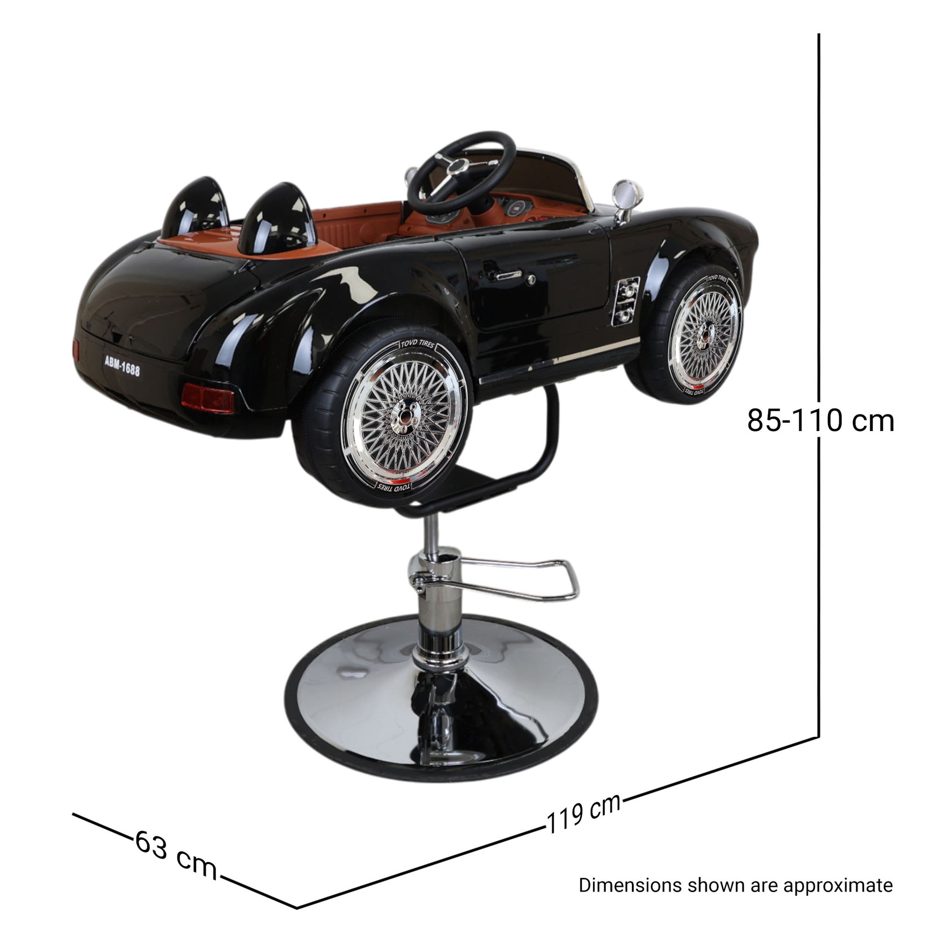 The Kids Barber Chairs - Vintage Roadster Classic Black revolutionises the hairdressing experience for young clients by transforming routine haircuts into thrilling adventures behind the wheel of a classic luxury convertible. This premium styling chair features an authentic vintage roadster design with meticulous attention to detail, including the iconic three-pointed emblem, polished chrome accents, vintage-inspired grille, wire-spoke wheels, and a sophisticated gloss black finish with complementary tan leather-look interior that immediately captures kids' imagination and enthusiasm. Thoughtfully engineered for professional salon environments, this innovative chair combines nostalgic aesthetics with practical functionality, featuring a comfortable upholstered seat with safety-focused ergonomics for kids aged 3-8 years. The robust construction supports a weight capacity of up to 30kg, ensuring durability even in busy salon environments with multiple daily appointments. Unlike standard salon chairs that often intimidate young clients, this classic roadster design creates an immersive experience that effectively distracts kids during styling sessions, resulting in significantly calmer, more cooperative clients and noticeably smoother appointments for both stylists and parents. The easy-clean surfaces allow for quick sanitation between clients, maintaining the highest hygiene standards essential for kids' services.