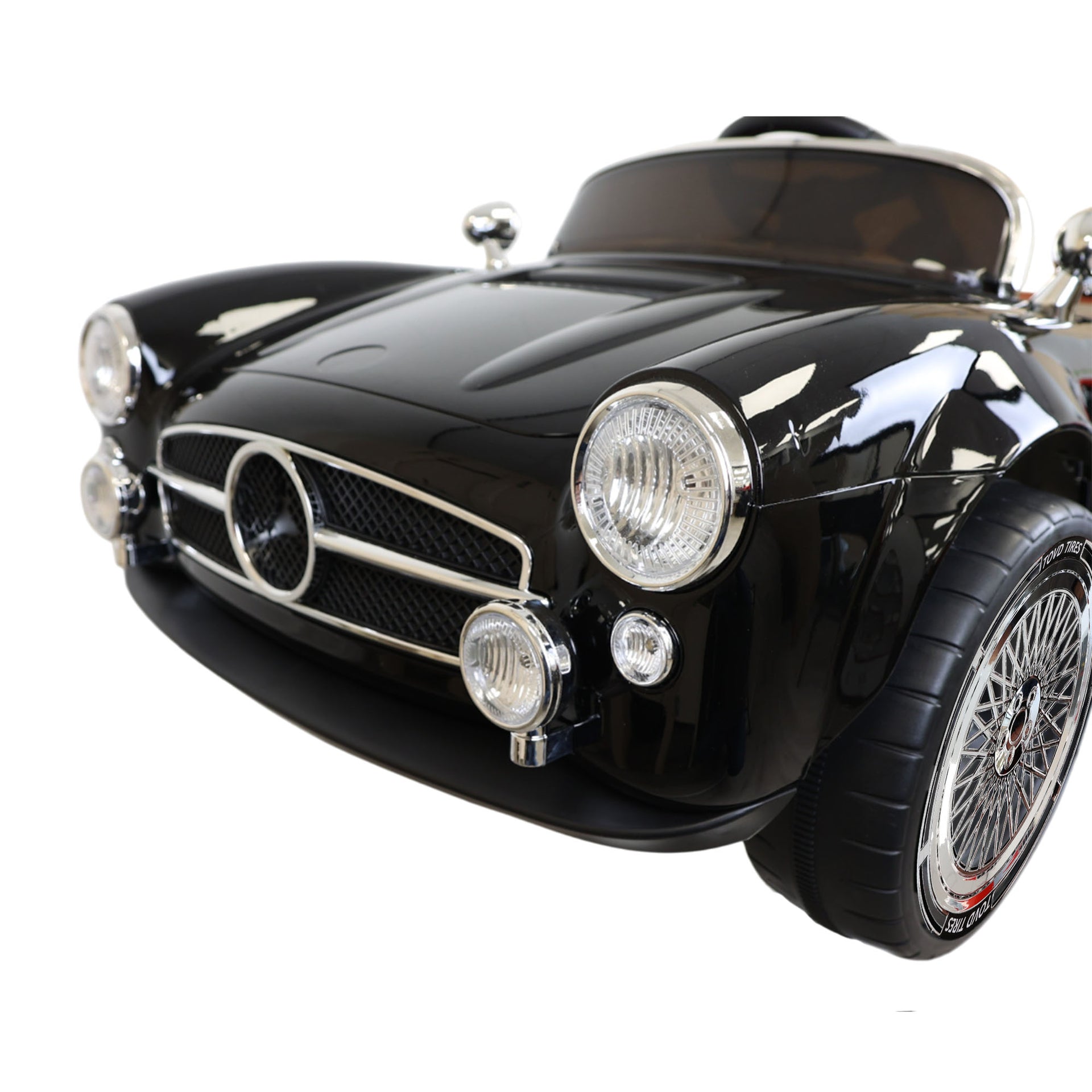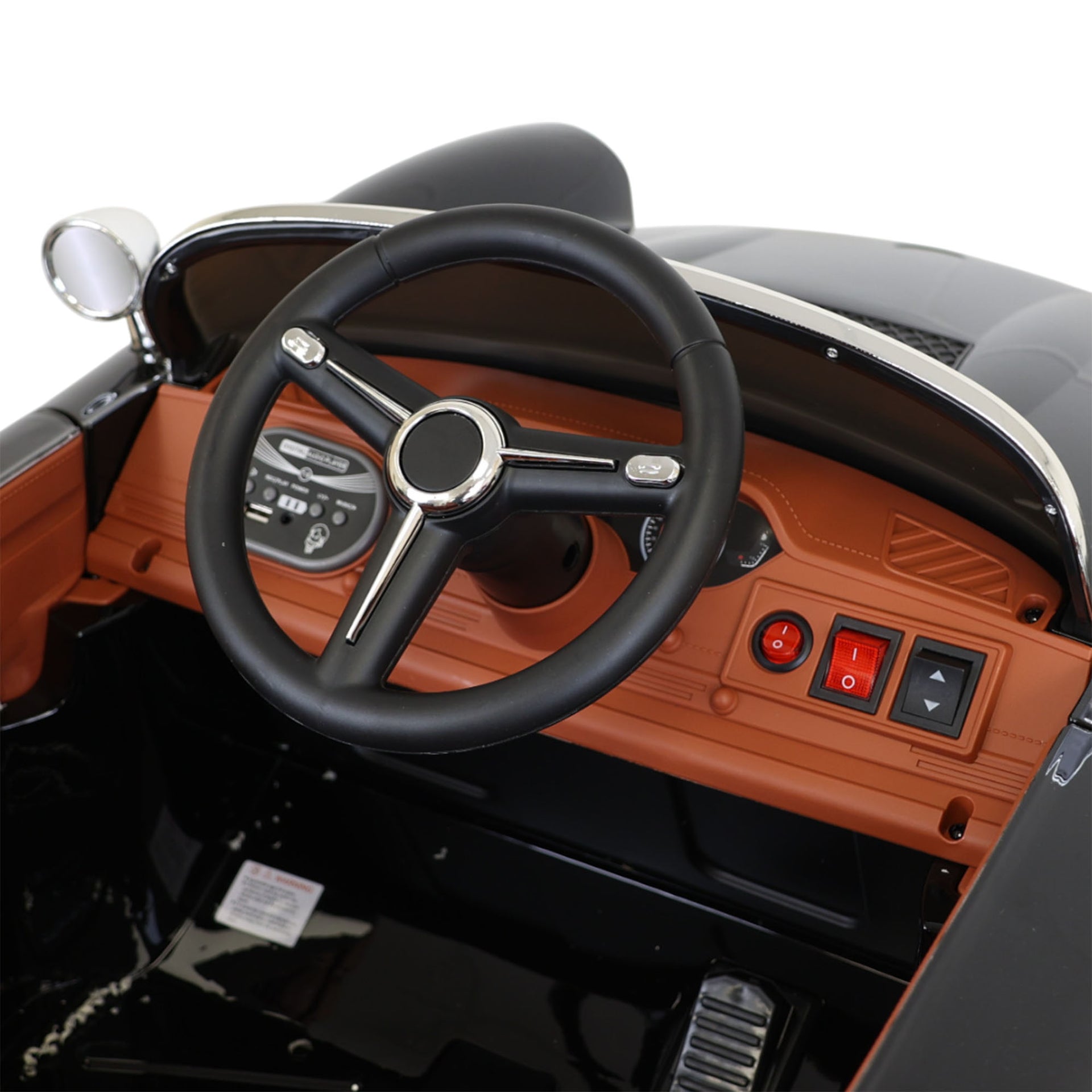 - Authentic vintage roadster design with gloss black finish and tan interior that immediately engages kids' imagination.