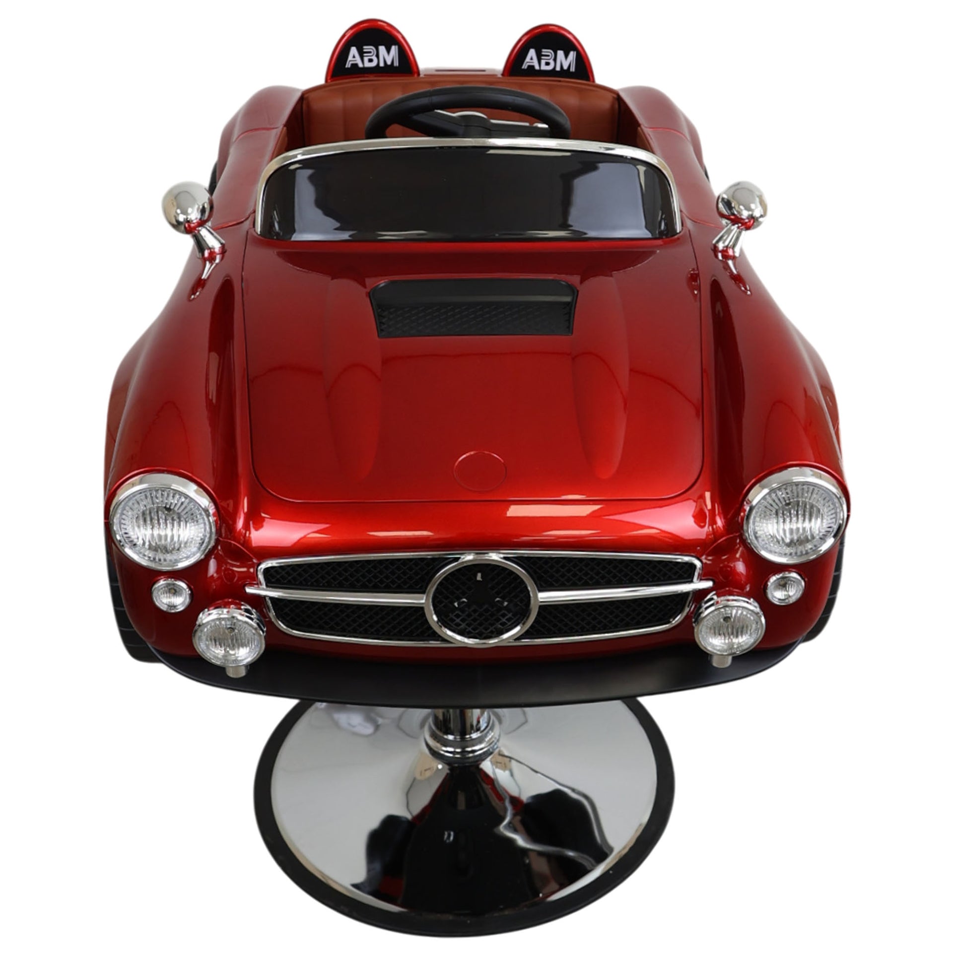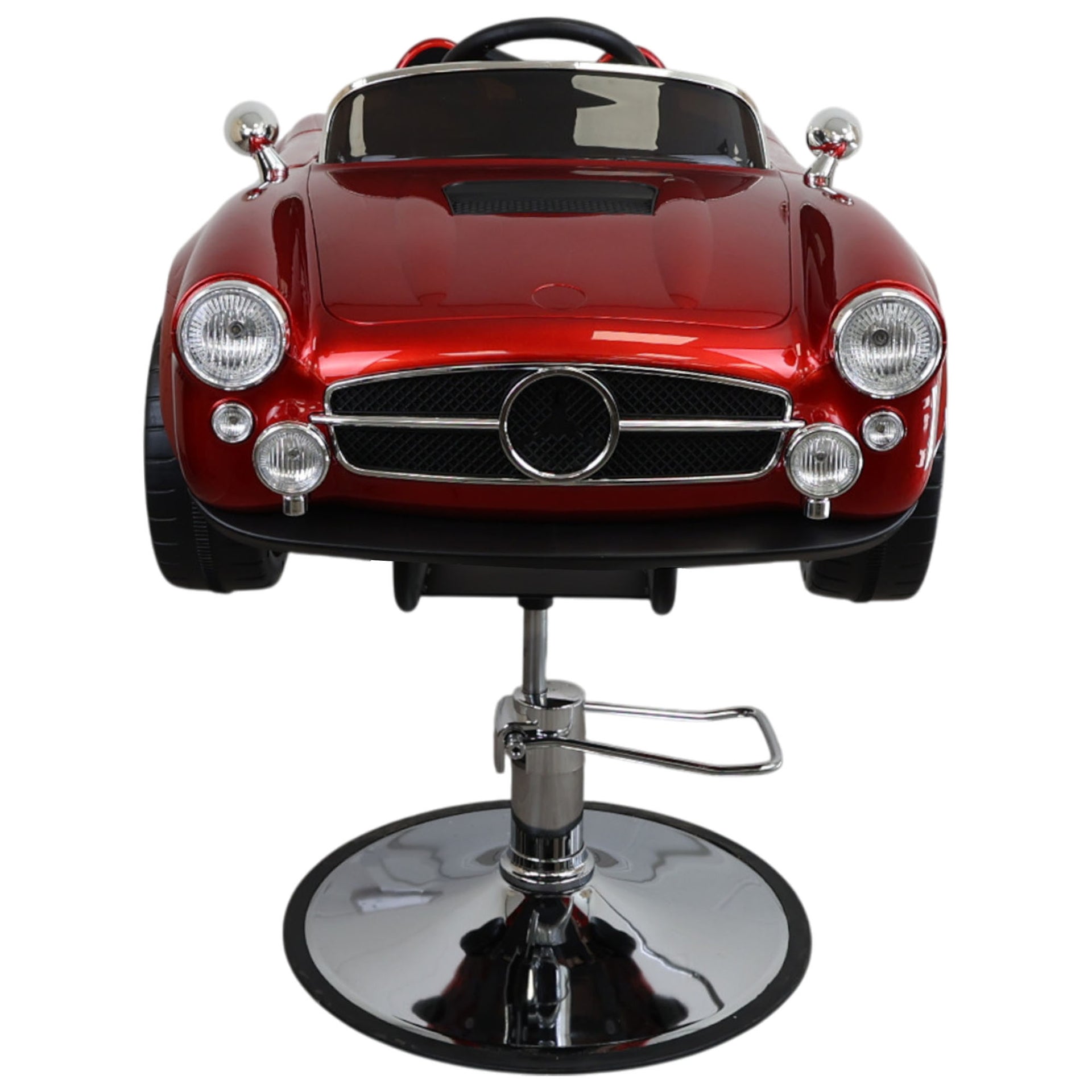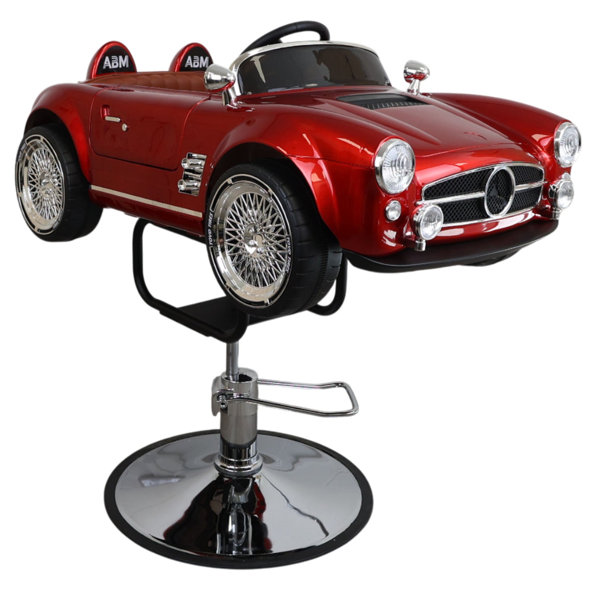 The Kids Barber Chairs - Vintage Roadster Classic Red revolutionises the hairdressing experience for young clients by transforming routine haircuts into thrilling adventures behind the wheel of a classic luxury convertible. This premium styling chair features an authentic vintage roadster design with meticulous attention to detail, including the iconic three-pointed emblem, polished chrome accents, vintage-inspired grille, wire-spoke wheels, and a stunning metallic red finish with complementary tan leather-look interior that immediately captures kids' imagination and enthusiasm. Thoughtfully engineered for professional salon environments, this innovative chair combines nostalgic aesthetics with practical functionality, featuring a comfortable upholstered seat with safety-focused ergonomics for kids aged 3-8 years. The robust construction supports a weight capacity of up to 30kg, ensuring durability even in busy salon environments with multiple daily appointments. Unlike standard salon chairs that often intimidate young clients, this classic roadster design creates an immersive experience that effectively distracts kids during styling sessions, resulting in significantly calmer, more cooperative clients and noticeably smoother appointments for both stylists and parents. The easy-clean surfaces allow for quick sanitation between clients, maintaining the highest hygiene standards essential for kids' services.