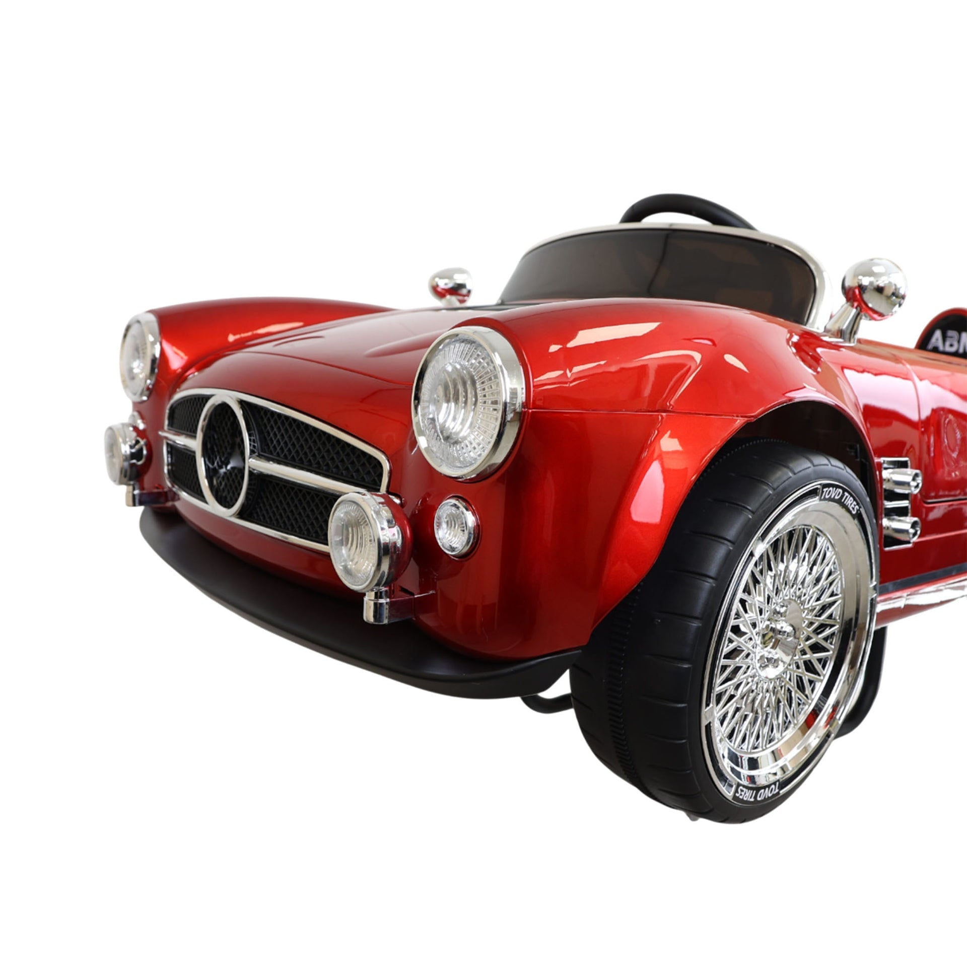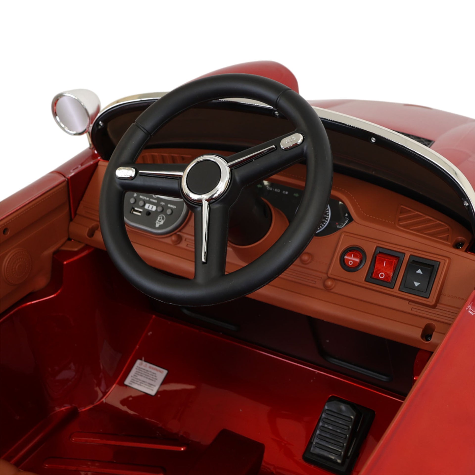 - Authentic vintage roadster design with metallic red finish and tan interior that immediately engages kids' imagination.
