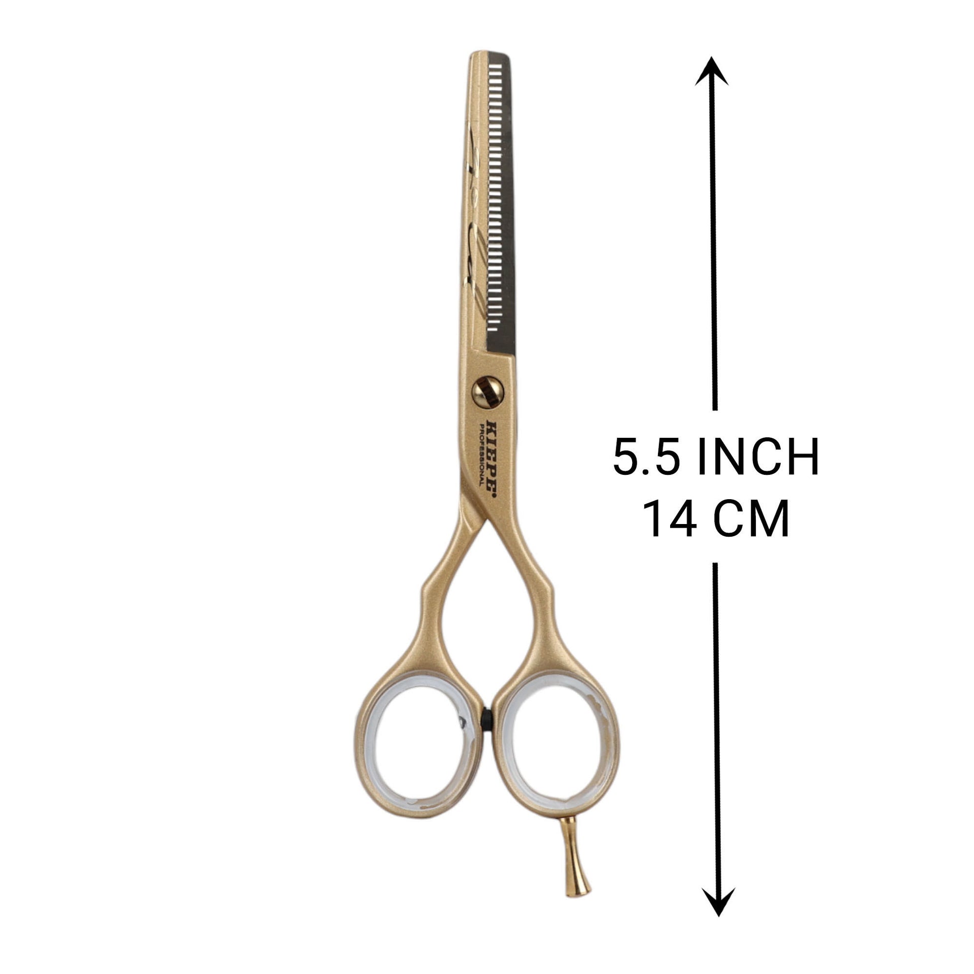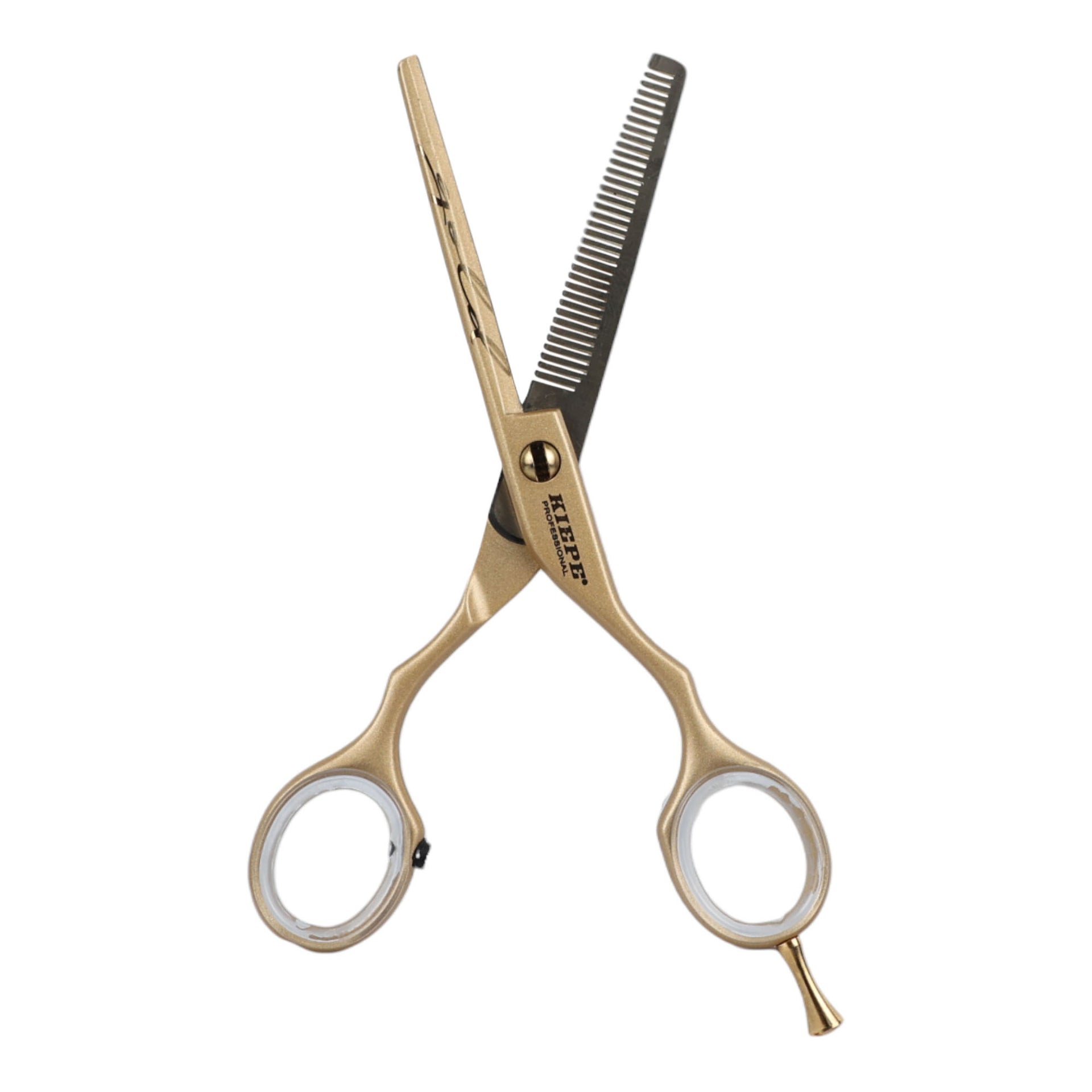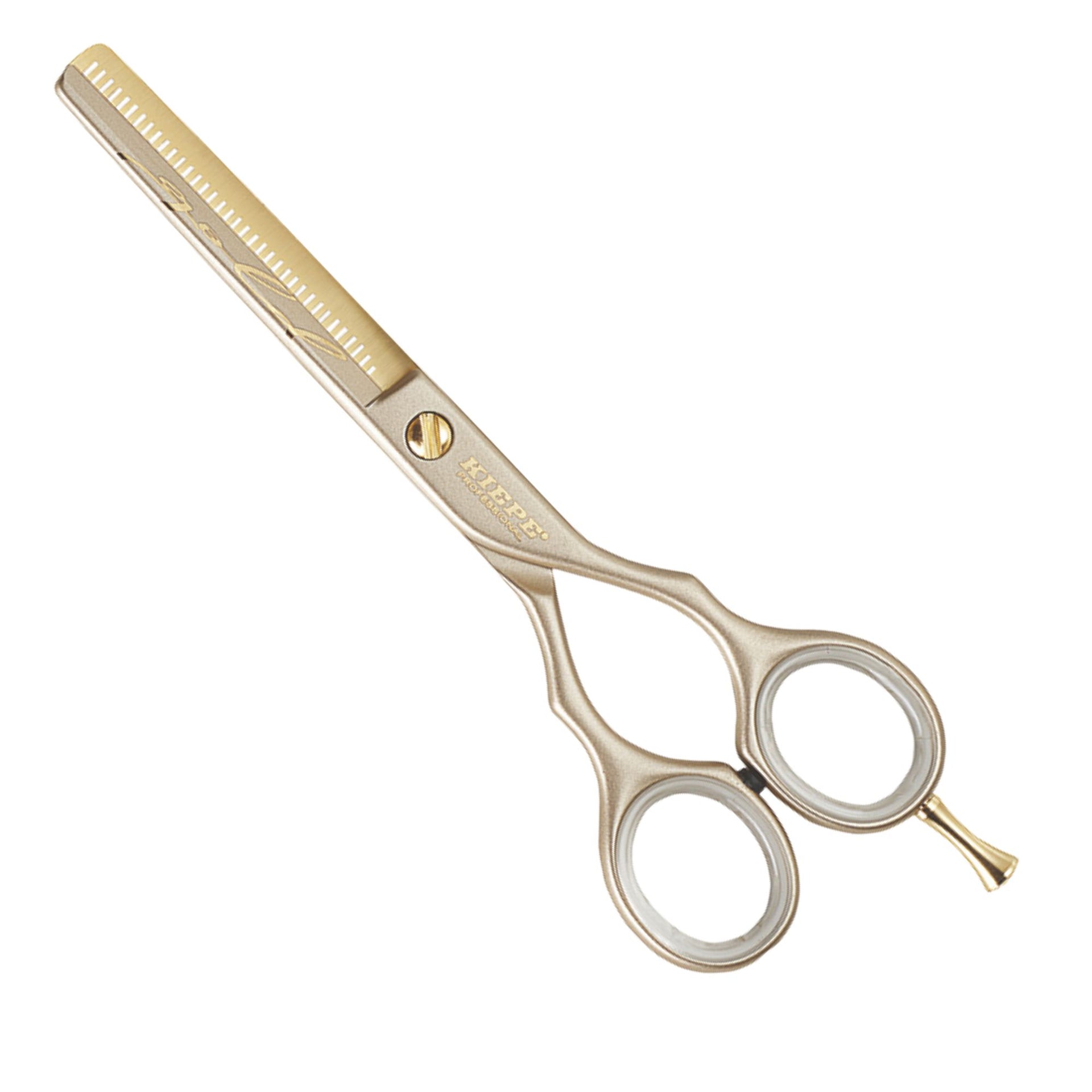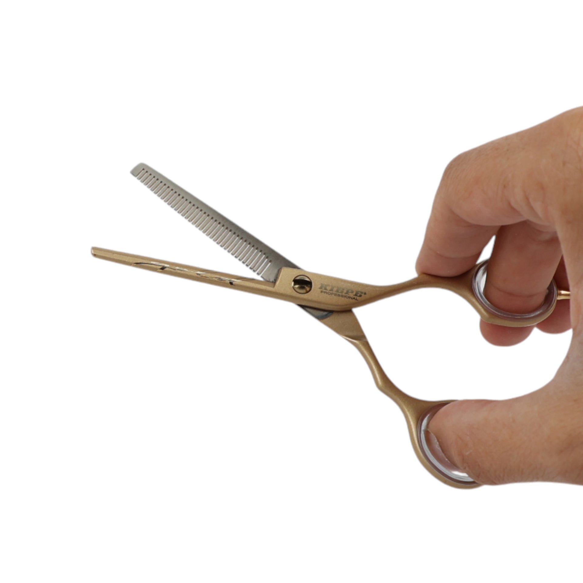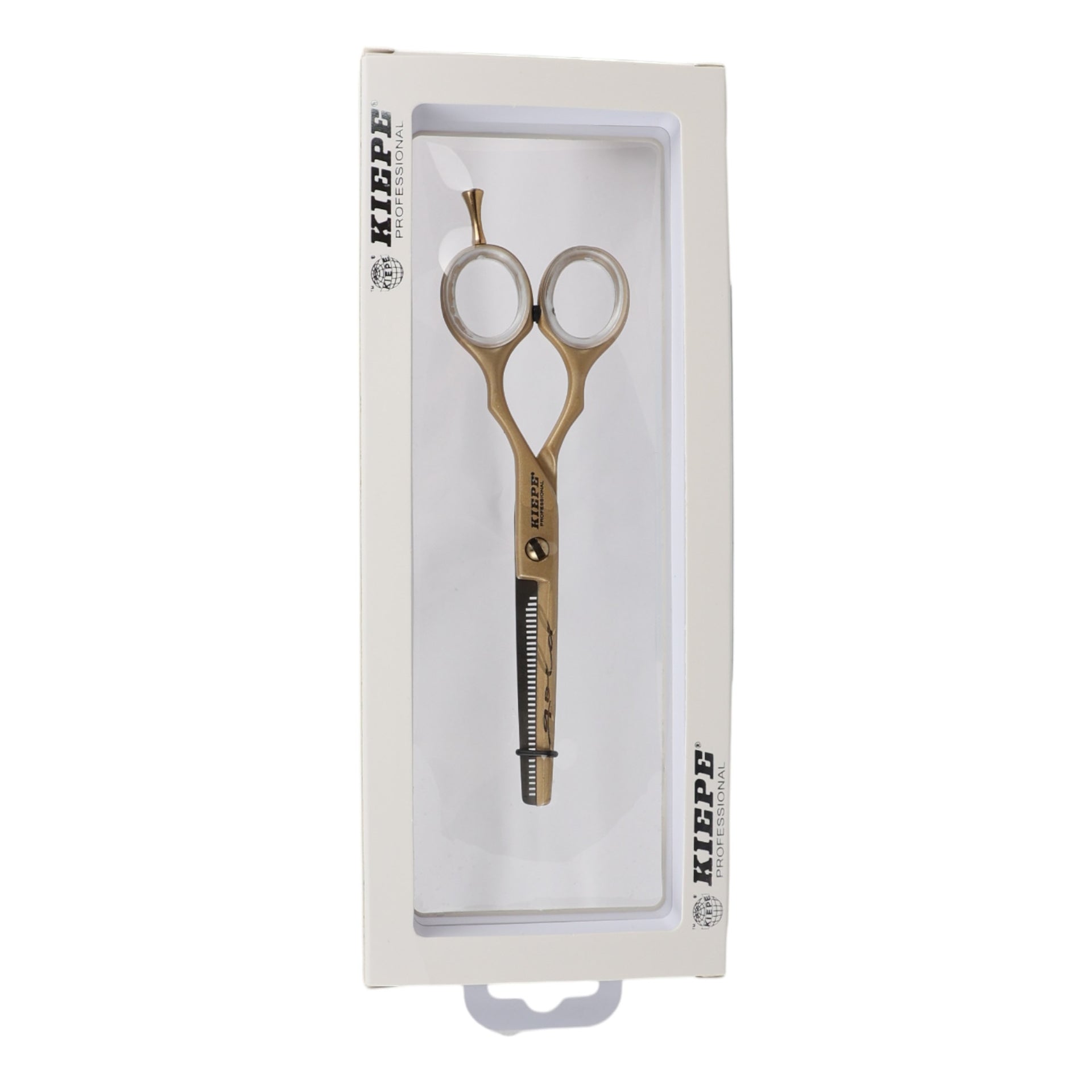 Introducing the Kiepe 2471 Luxury Blending Scissors 5.5 Inch (14cm), the ultimate tool for professional stylists who value both precision and elegance. These exquisite scissors are crafted from AISI 420 stainless steel, known for its exceptional durability and resistance to corrosion, making them a long-lasting addition to any stylist’s toolkit. The 'Extreme Grid' sharpening technique used on these blades ensures an ultra-smooth cut, allowing for flawless blending and texturising with minimal effort. The luxurious gold-toned finish not only enhances your salon's aesthetic but also reflects the superior craftsmanship behind these shears.