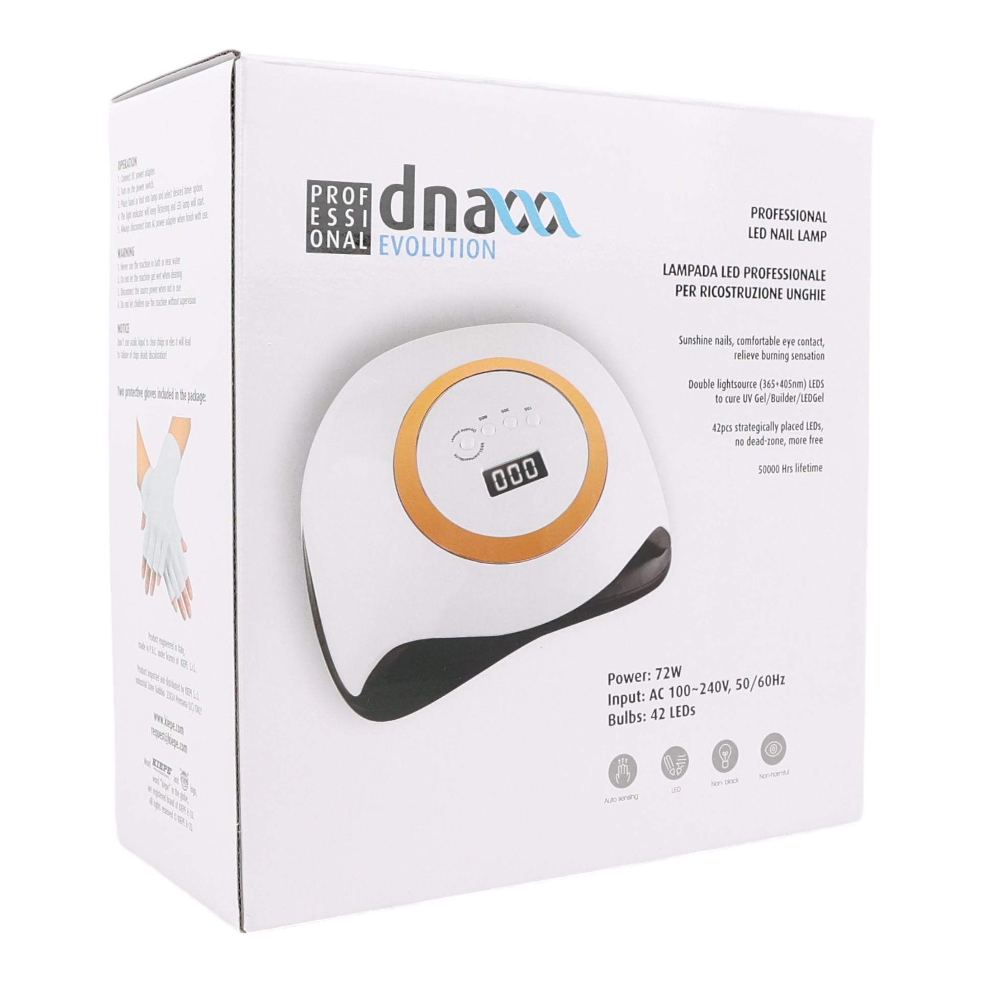 Elevate your nail care routine with the Kiepe DNA Evolution LED Nail Lamp, a professional-grade device ideal for both salon and home use. This 72-watt lamp features a dual light source (365+405 nm), making it compatible with all types of UV and LED gel polishes, builder gels, and nail extensions. With 42 strategically placed LEDs, it ensures complete coverage and eliminates dead zones, allowing for optimal hand placement and consistent curing. Achieve salon-quality results in the comfort of your home, with reduced curing times and enhanced longevity for your manicures and pedicures.