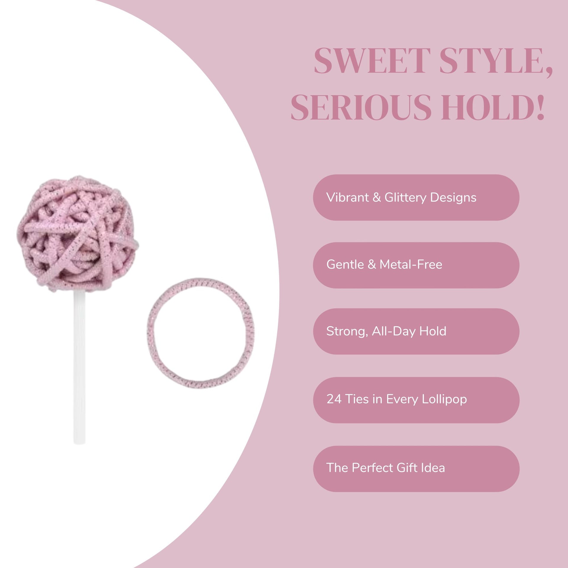 - A charming set of 24 glittery pink hair ties presented in a fun lollipop design.