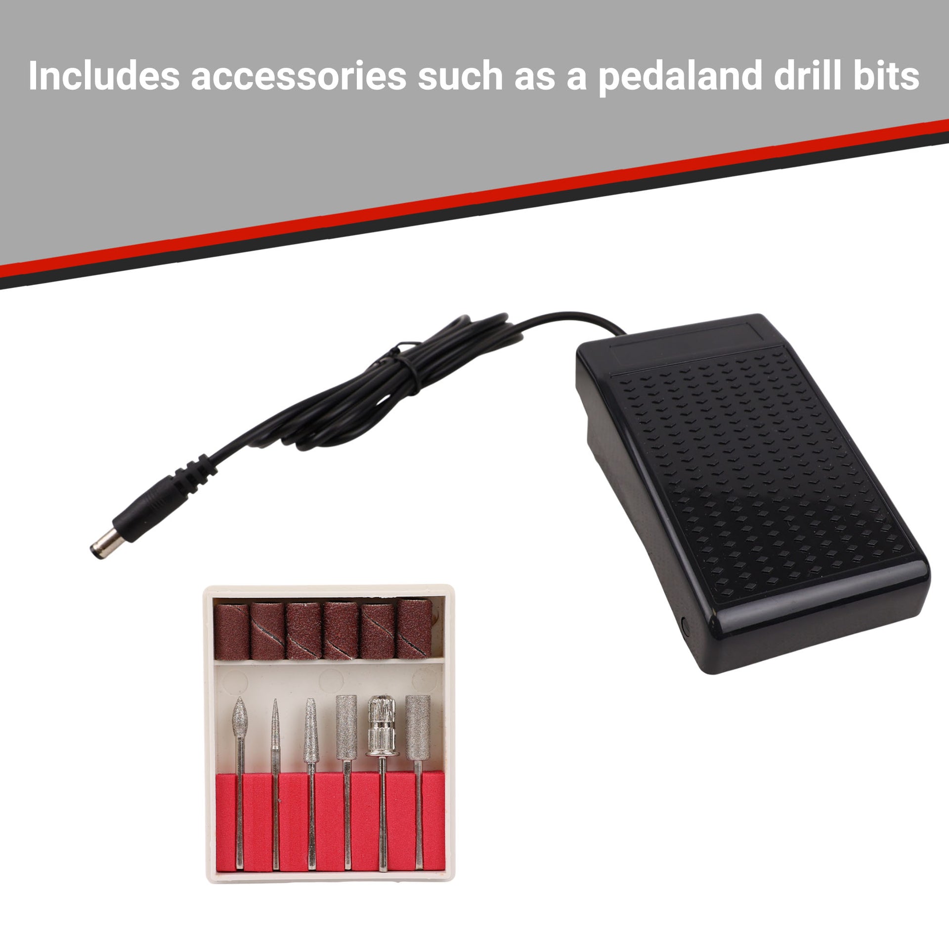 - Accessories: Pedal, non-slip rubber support, and drill bits