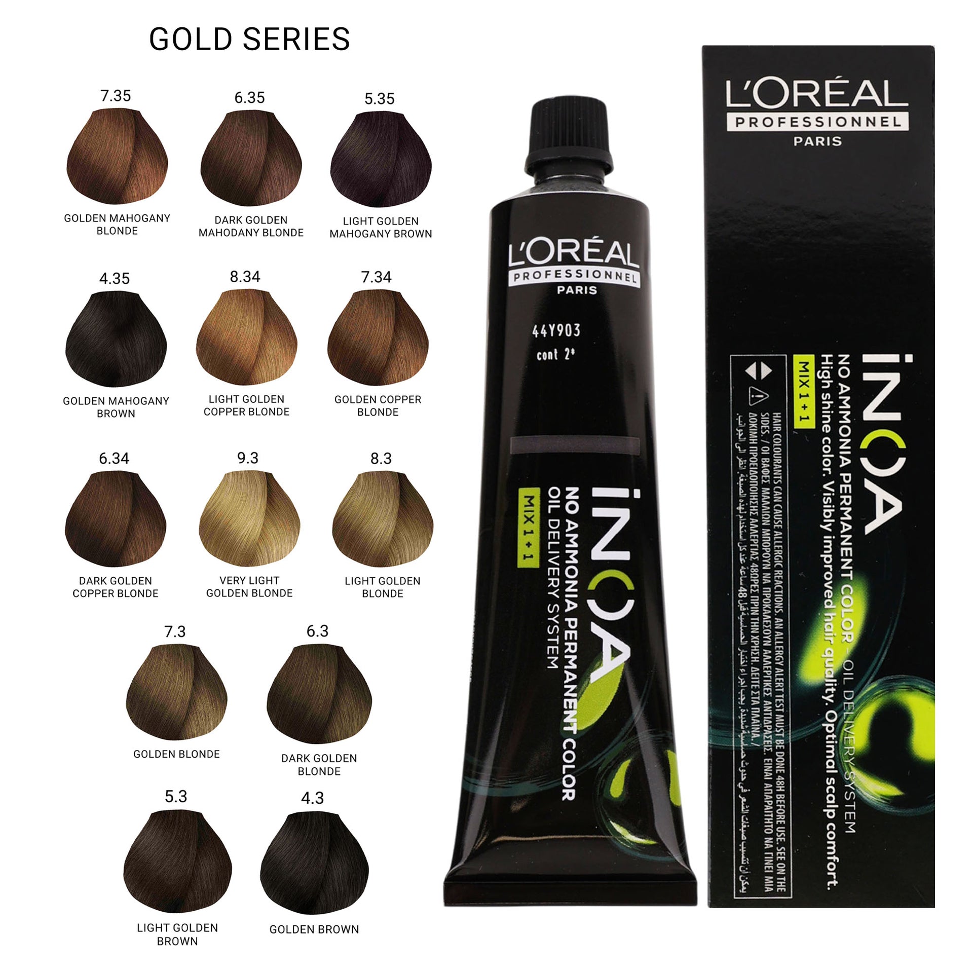 Experience a revolutionary approach to permanent hair colour with the L'Oréal Professionnel INOA range, specifically featuring the radiant Gold Series. This collection leverages a unique, patented Oil Delivery System (ODS2) technology, entirely free from ammonia for a more pleasant colouring experience without compromising on results. The oil base not only propels colour deep within the hair fibre but also optimises scalp comfort during the process. Achieve high-impact, luminous colour results across a spectrum of stunning golden hues, from rich browns to dazzling blondes.