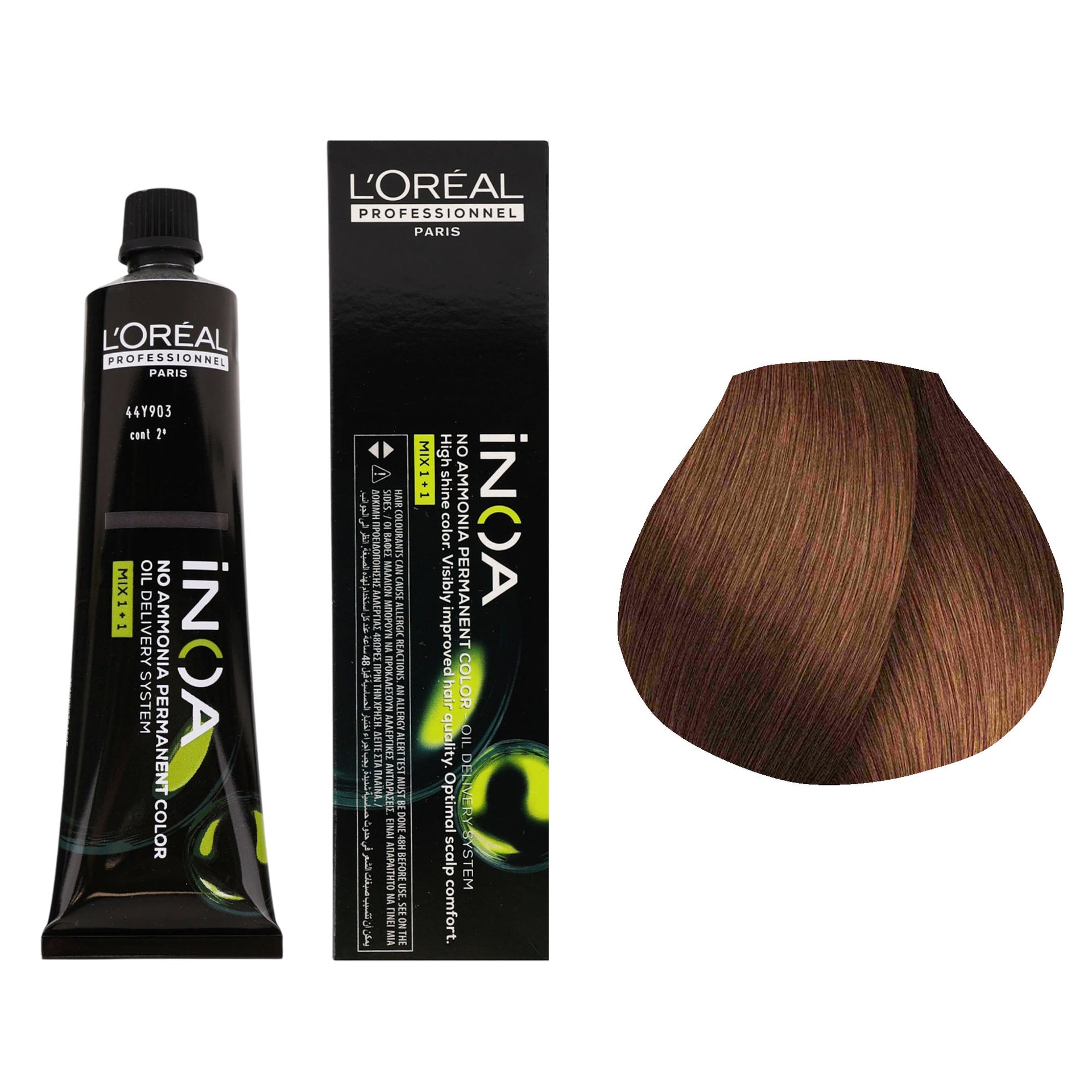 For professional use: Mix the INOA colour and the recommended INOA oxidant (10, 20, or 30 vol) in a 1:1 ratio using non-metallic tools until a homogenous texture is achieved. Apply to the root area and, if needed, lengths and ends. Allow developing for 35 minutes before emulsifying gently, rinsing thoroughly, and finishing with a specific post-colour shampoo.