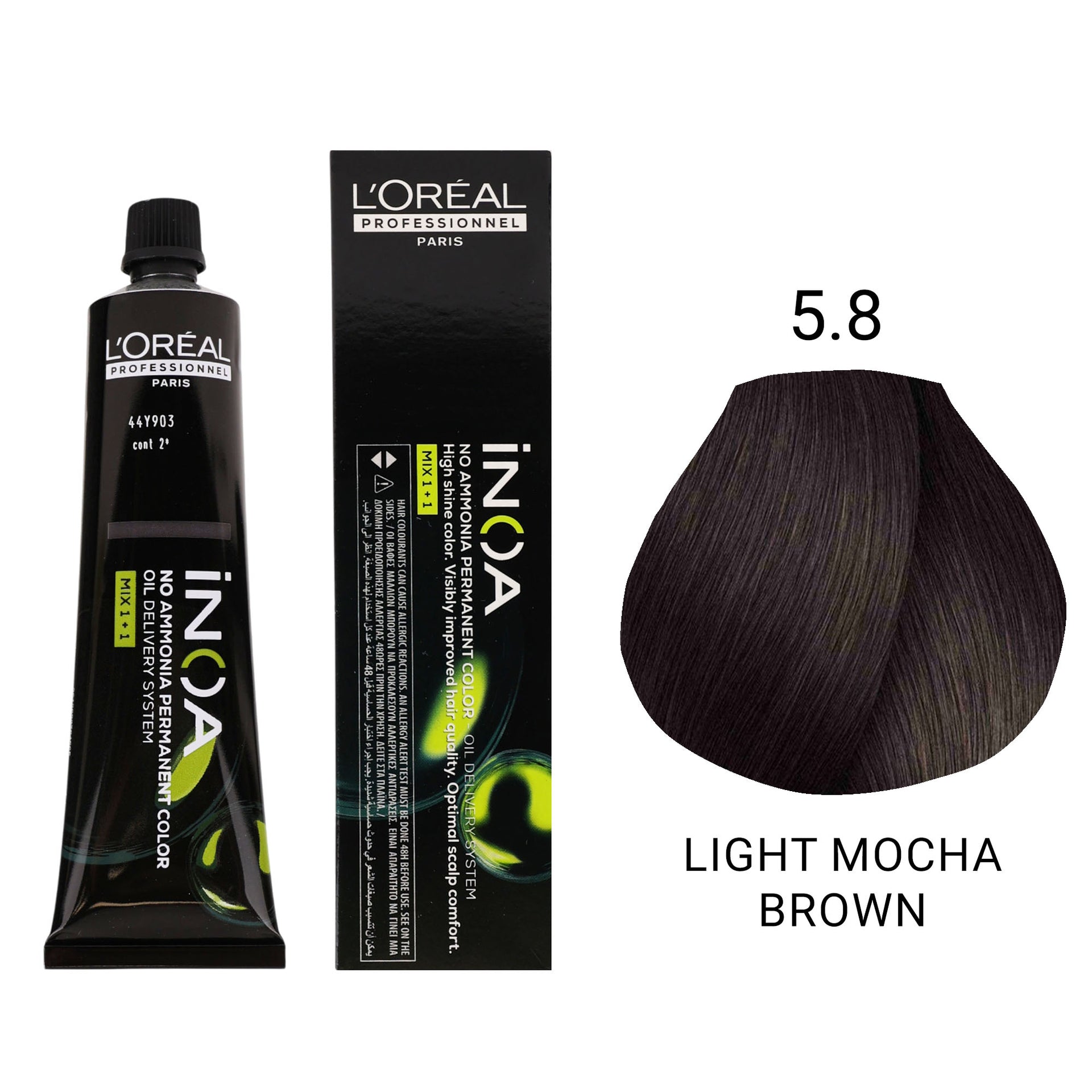 Discover the sophistication of the L'Oréal Professionnel INOA Mocha Series, part of the groundbreaking ammonia-free permanent hair colour collection. This range utilises the unique Oil Delivery System (ODS2) technology, offering a luxurious colouring process that prioritises hair integrity and scalp well-being. The absence of ammonia creates a pleasant, odour-free experience, while the high concentration of oil (60%) ensures optimal comfort and enhances the colour's luminosity. Achieve beautiful, multi-tonal mocha results with exceptional softness and shine.